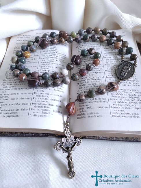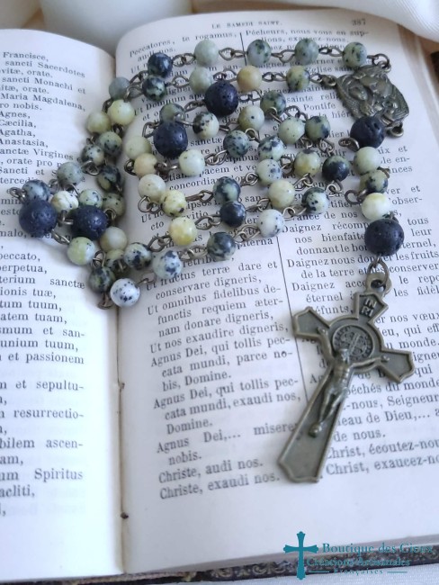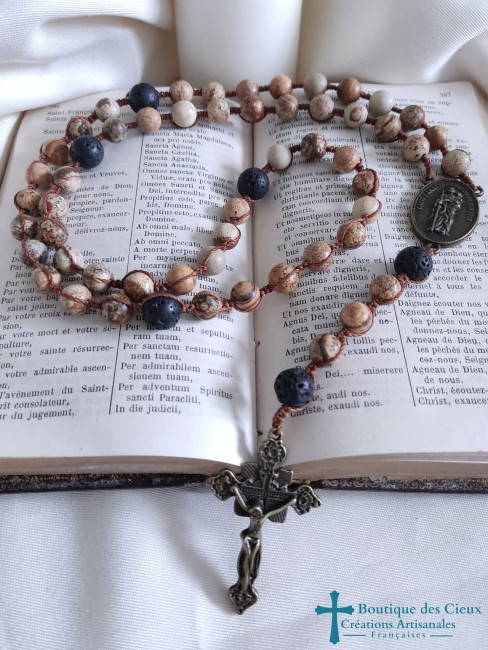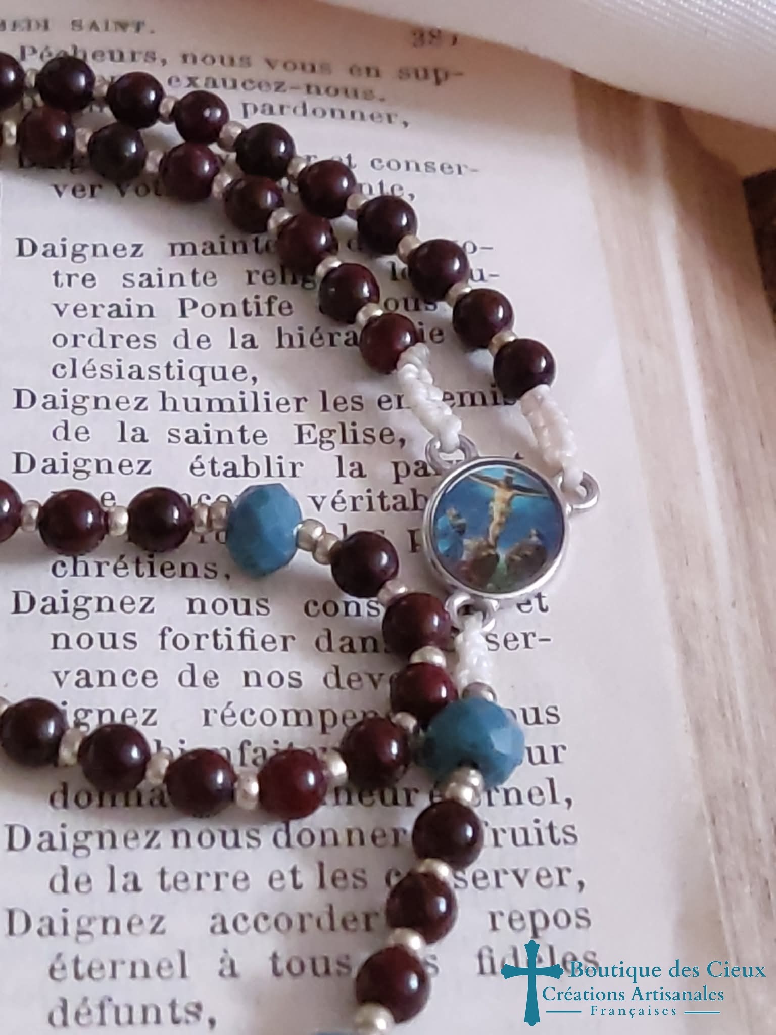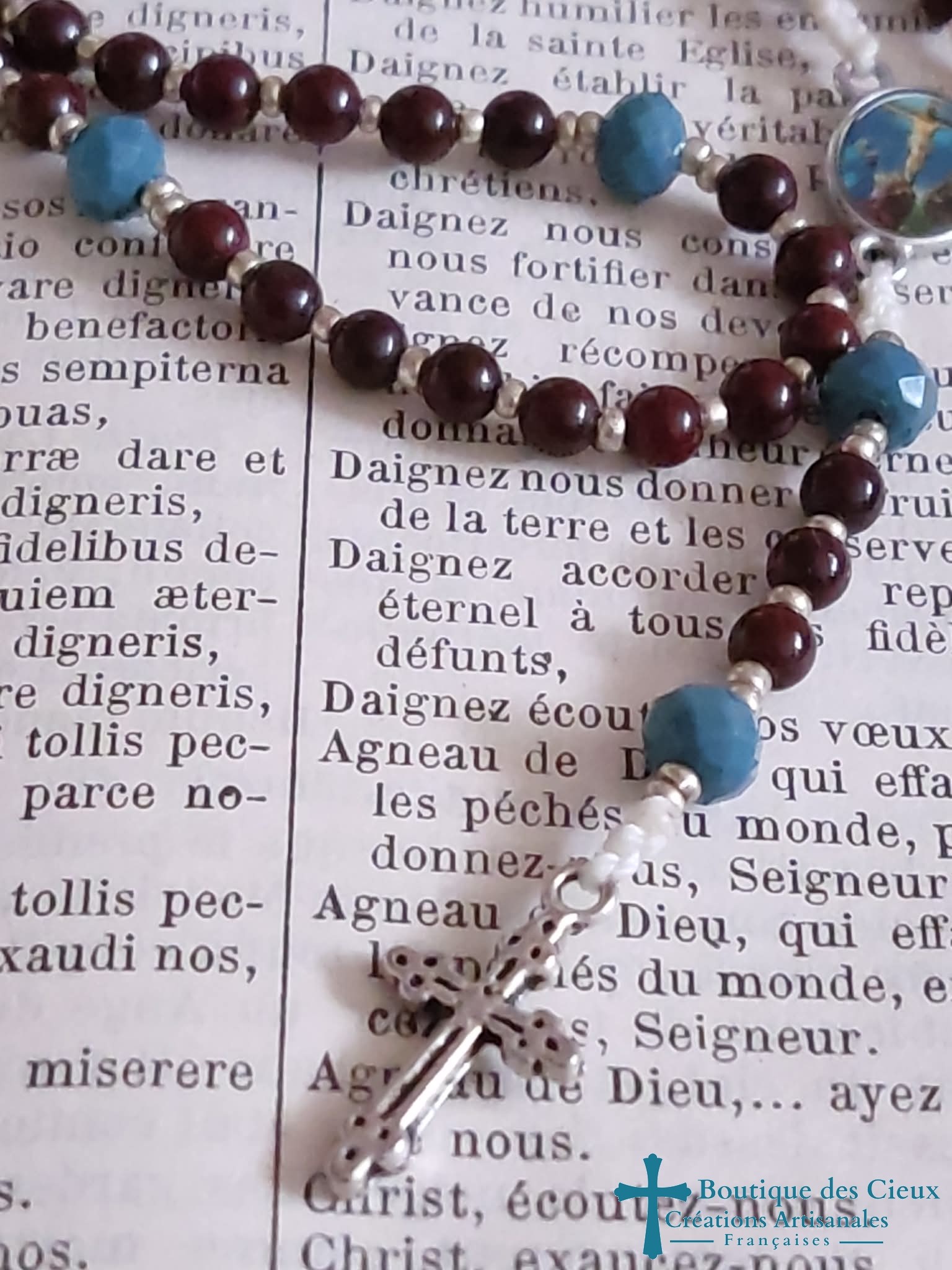 Petit chapelet en grenat et perles en verre bleu, monté sur fil polyester. Les grains sont facilement discernables grâce aux petites perles qui les séparent, et la différence de taille et forme pour les "Notre Père".De texture souple, il est facilement glissable dans vos poches. Il peut également être suspendu à vos rétroviseurs sans gêner la visibilité.