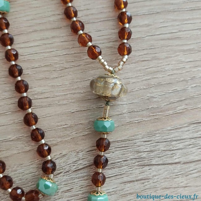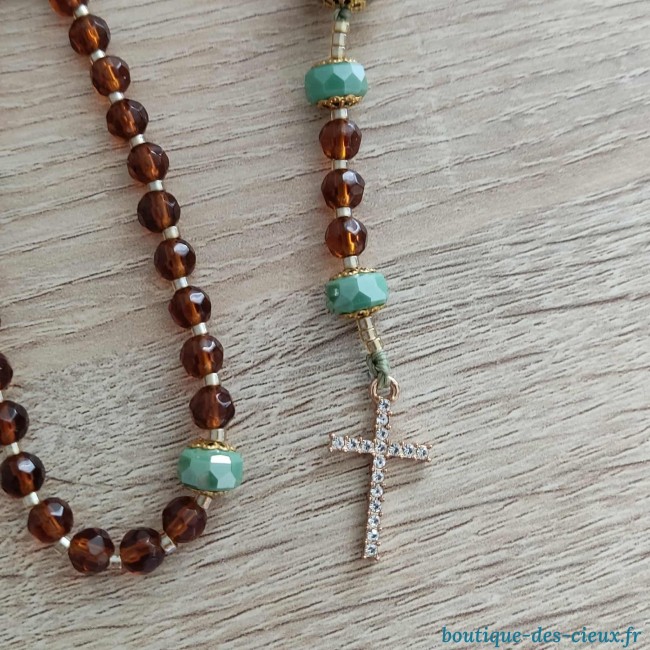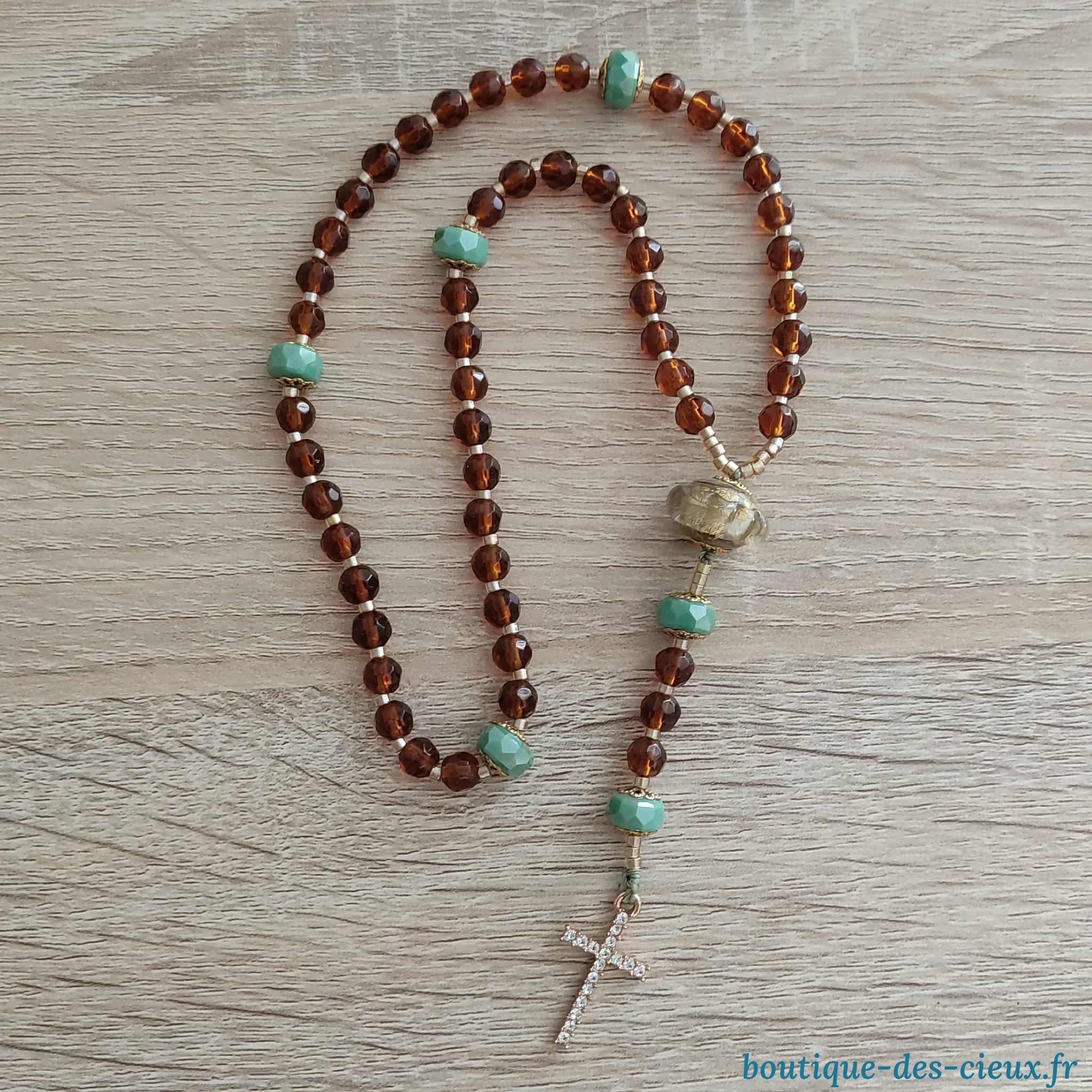 Chapelet pour femme composé de perles en verre facetté marron, magnifique perle en verre filé d'art avec inclusion de feuille d'or, et belle croix dorée à strass. Les grains des dizaines sont facilement discernables grâce aux petites perles qui les séparent, ainsi que la différence de forme et tailles avec les "Notre Père". Souple il se glisse facilement dans une poche. Il peut également être du plus bel effet accroché à votre rétroviseur tout en étant à disposition pour méditer. Vous souhaitez prier le chapelet, mais ne savez pas comment procéder : rendez vous dans les pages à votre disposition. Vous y trouverez des explications et un livret complet téléchargeable en format pdf vous y est offert. |