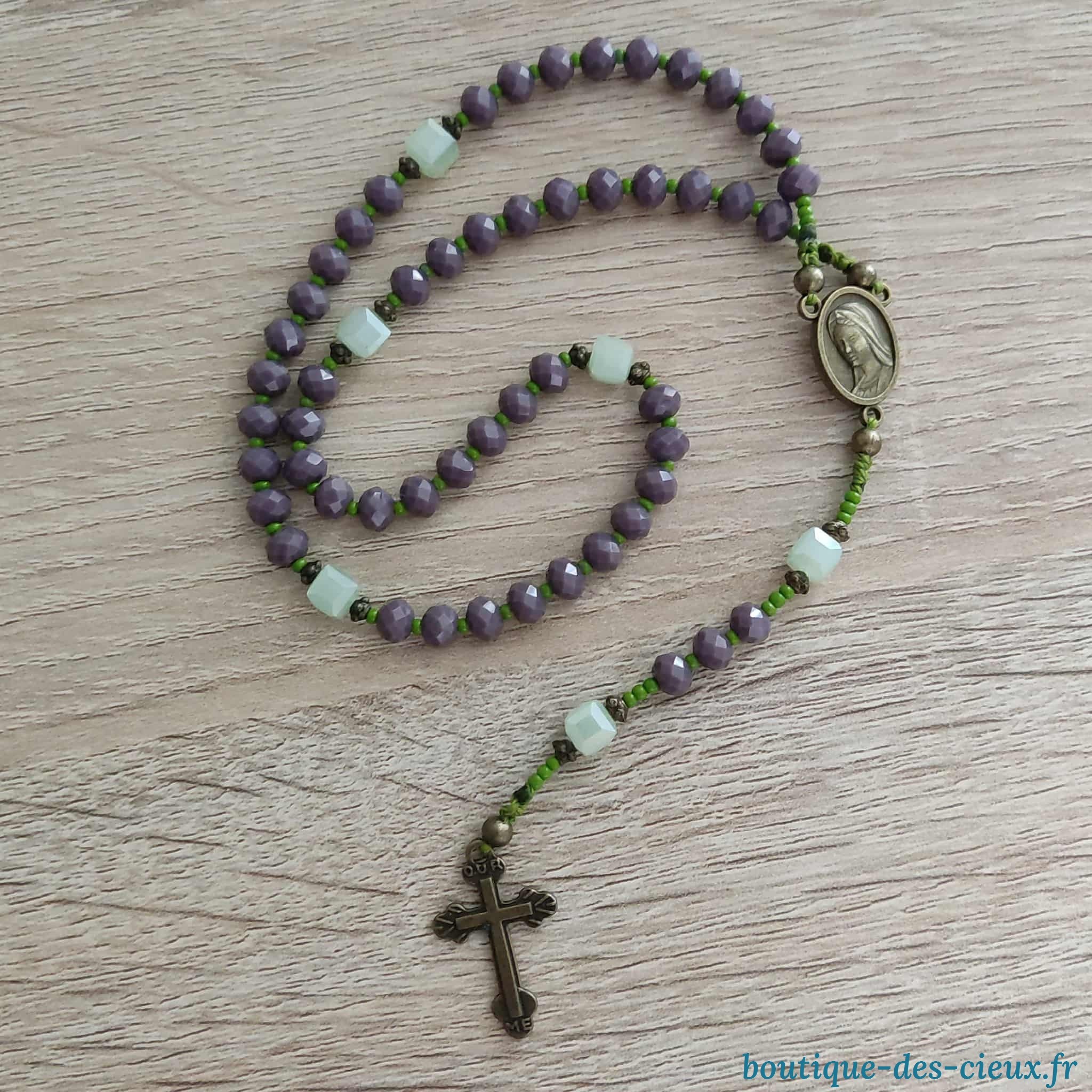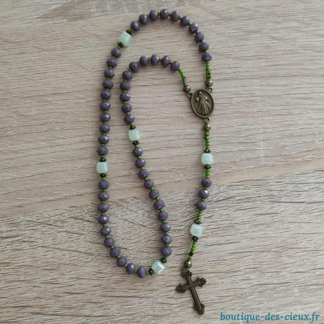 Chapelet pour femme composé de perles en verre facetté violet et cubes en verre irisé, ainsi que de diverses pièces en métal bronze. Les grains des dizaines sont facilement discernables grâce aux petites perles qui les séparent, ainsi qu'à la différence de forme des "Notre Père". Très souple et de petite taille, il se glisse facilement n'importe où protégé par son pochon. Vous souhaitez prier le chapelet, mais ne savez pas comment procéder : rendez vous dans les pages à votre disposition. Vous y trouverez des explications et un livret complet téléchargeable en format pdf vous y est offert. |