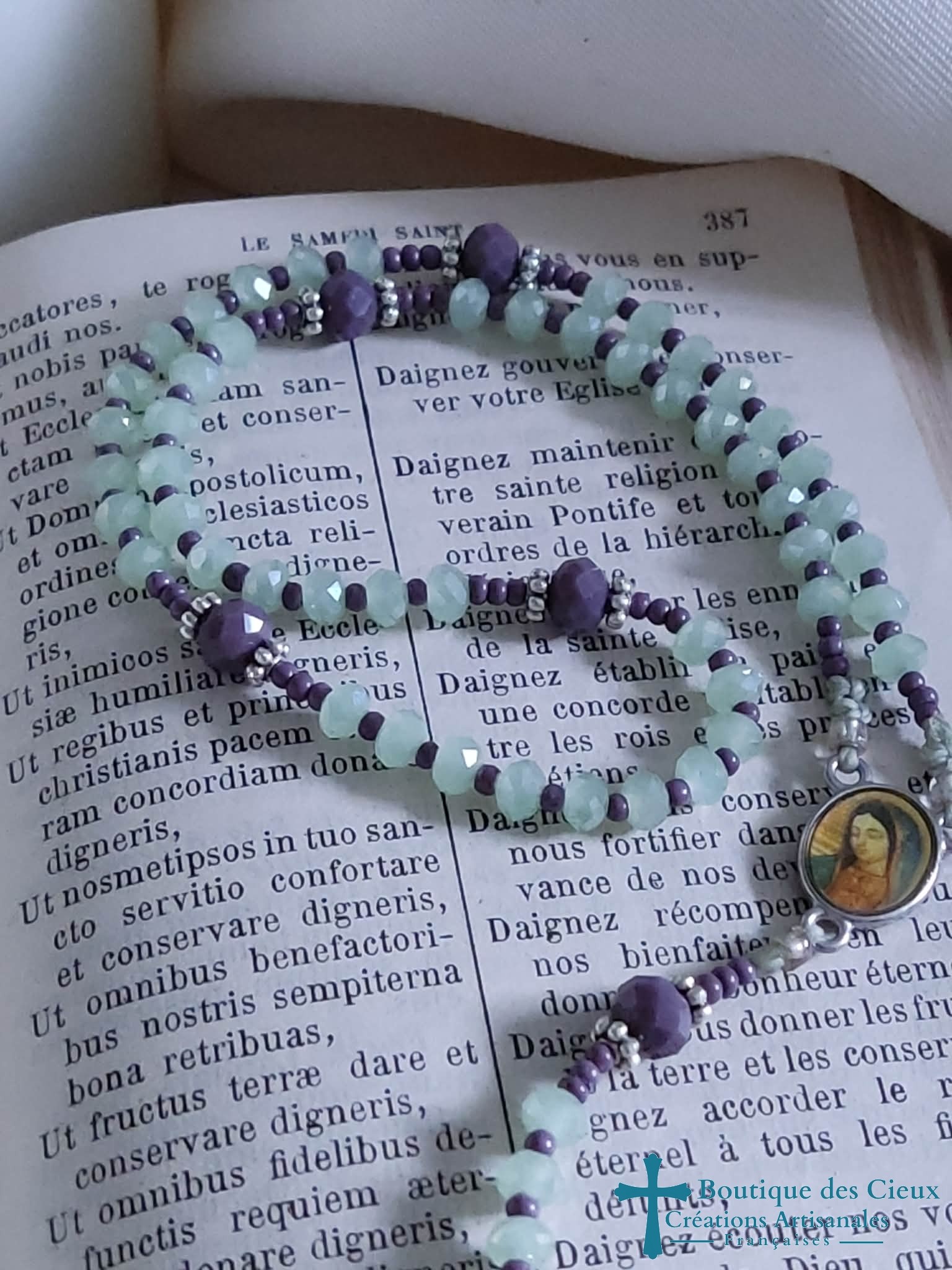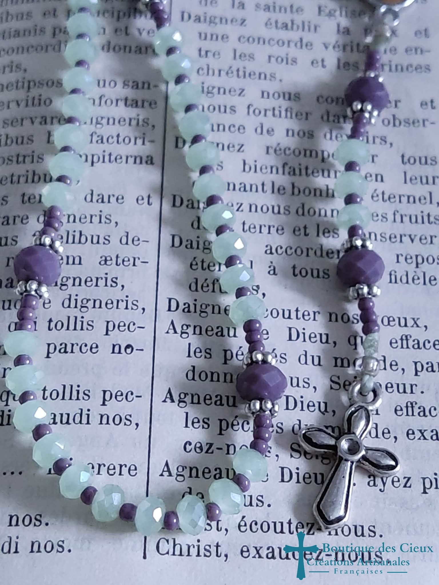 Petit chapelet composé de perles en verre facetté vert irisé, ainsi que d'un connecteur Notre Dame de Guadalupe et d'une petite croix en métal argenté. Vous souhaitez prier le chapelet, mais ne savez pas comment procéder : rendez vous dans les pages à votre disposition. Vous y trouverez des explications et un livret complet téléchargeable en format pdf vous y est offert. |