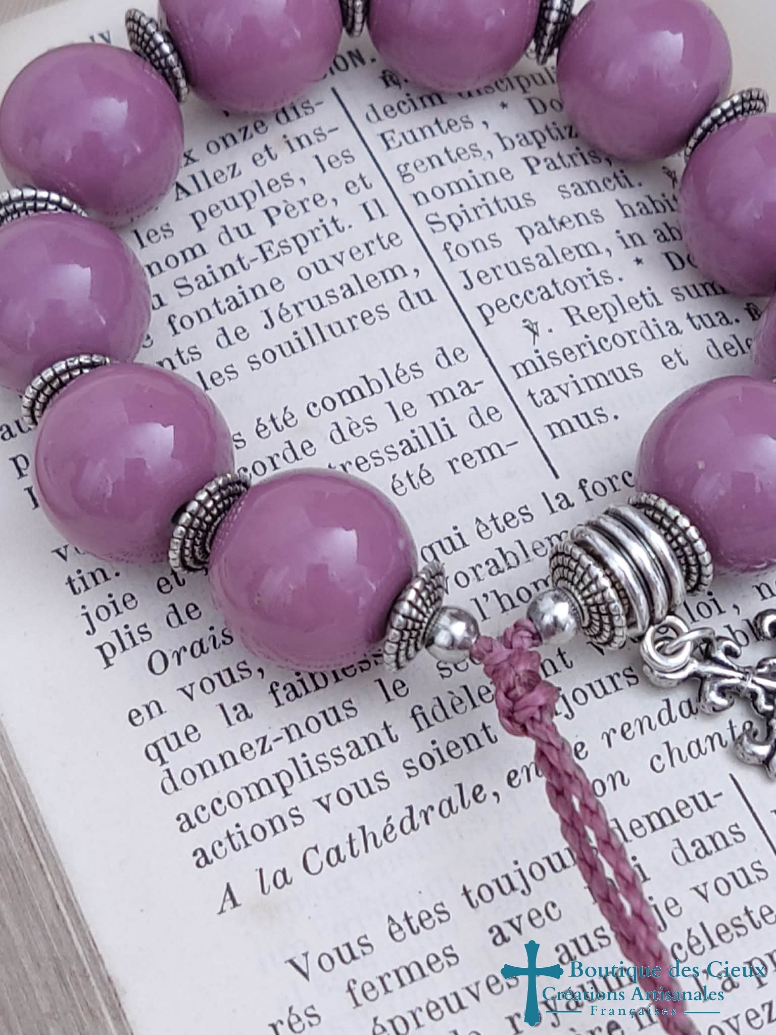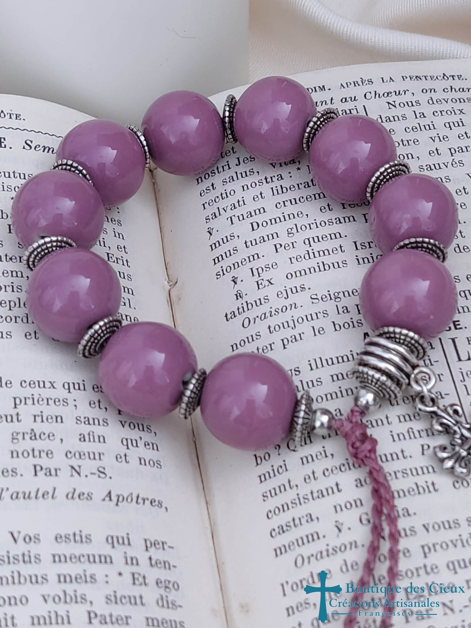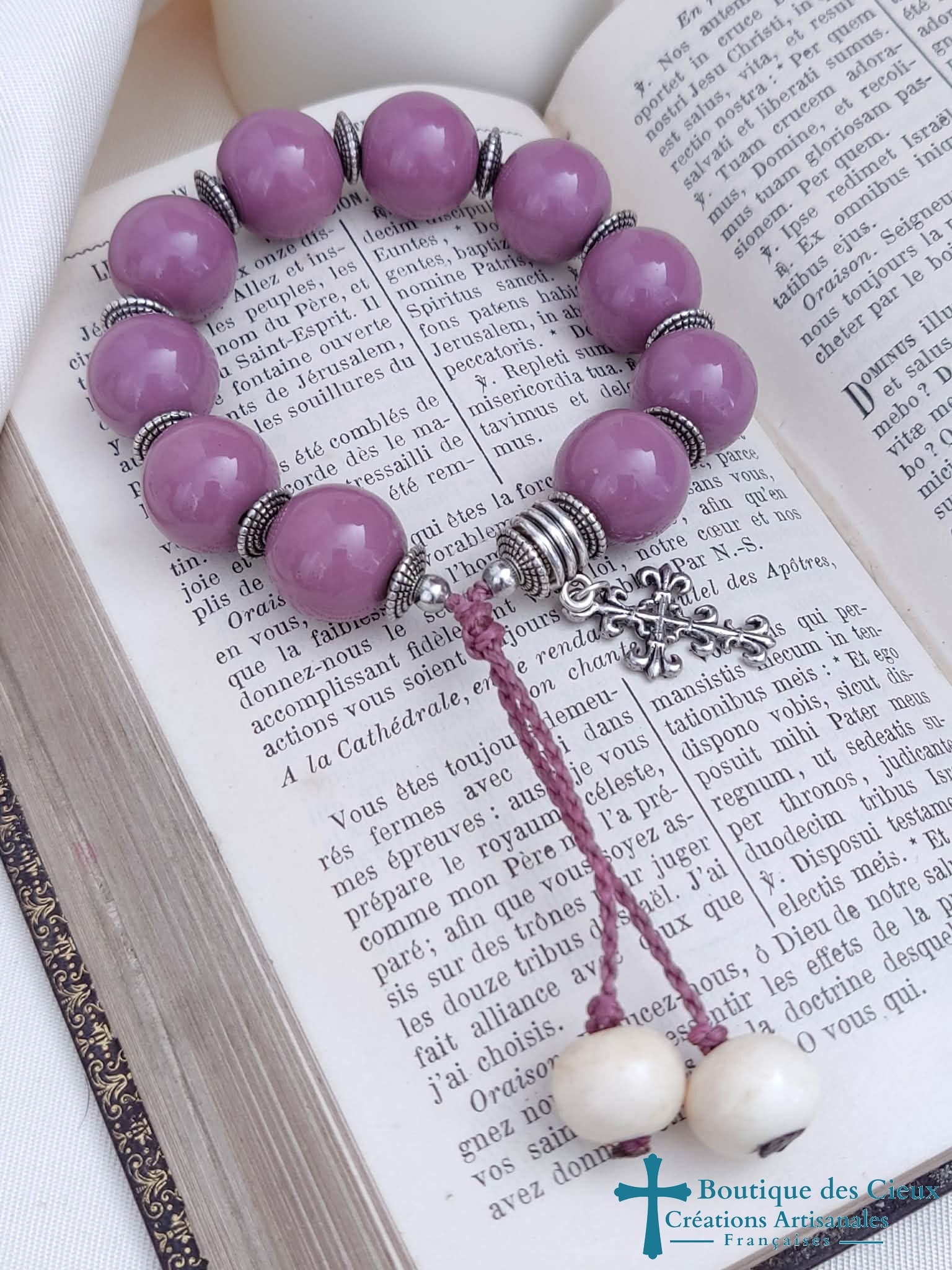 Bracelet dizainier pour femme composé de perles en porcelaine et de pièces en métal argenté.Ce dizainier à été créé pour avoir l'apparence d'un bracelet ordinaire (de style ethnique), tout en respectant les étapes de la prière. Les grains en grosses perles sont facilement maniables, la bélière avec sa jolie croix marque le début et la fin de la méditation.Entièrement monté à la main sur du fil polyester à macramé, ce bijou est réglable grâce à son fermoir coulissant. |