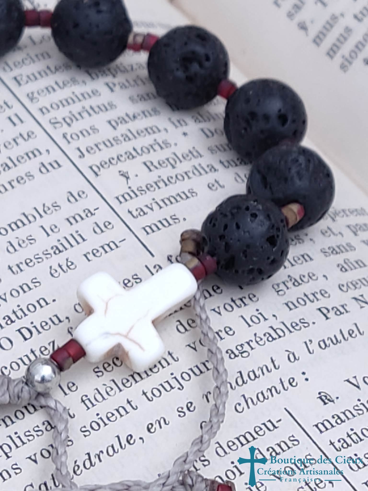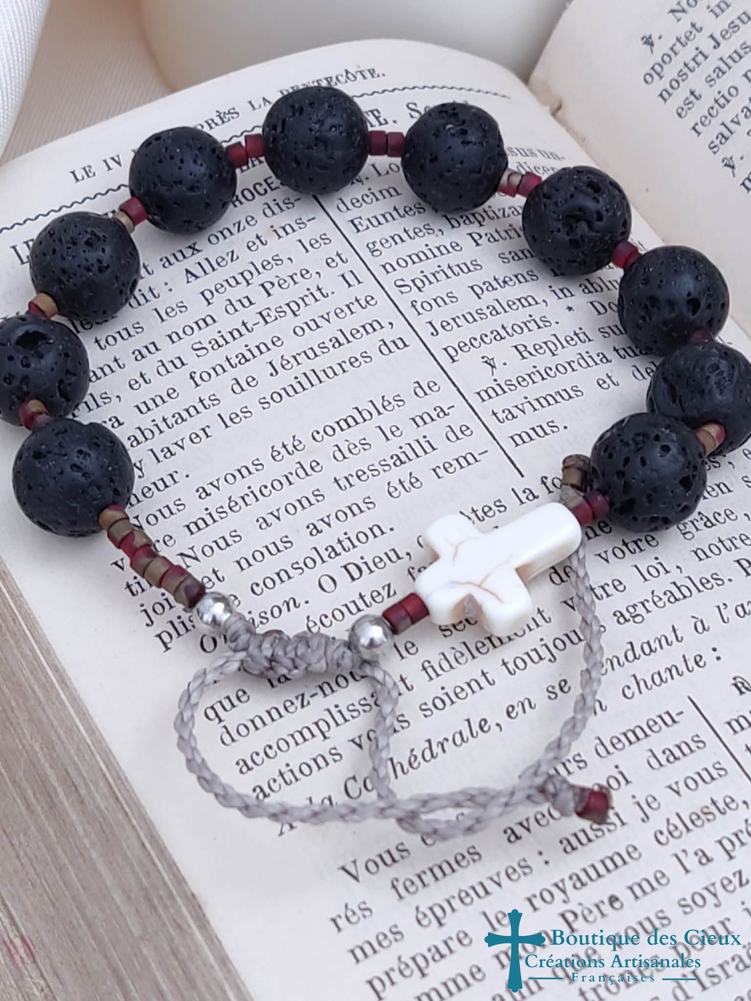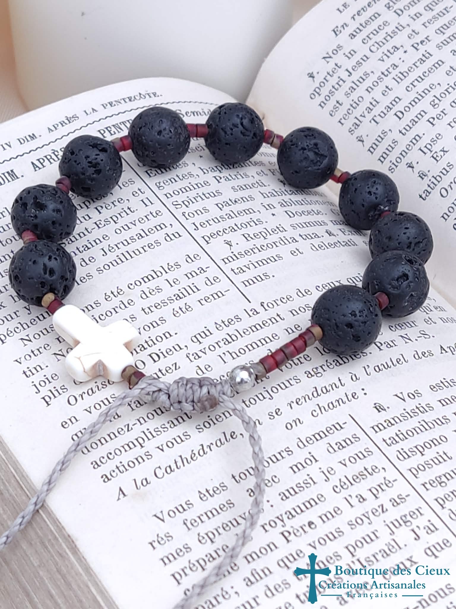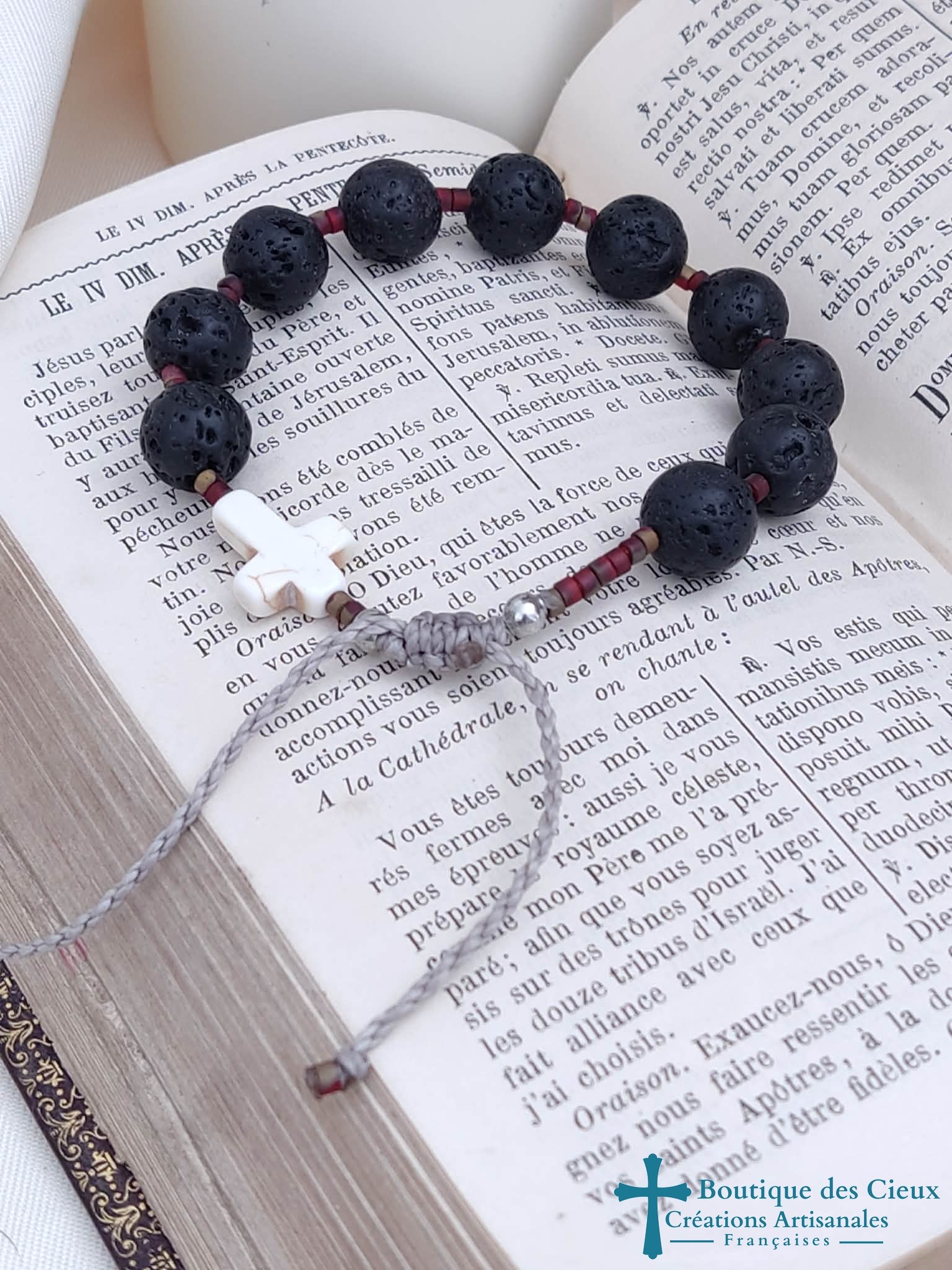 Bracelet dizainier pour homme composé de pierre de lave (éloigne la négativité). Véritable bijou, ce dizainier à été créé pour avoir l'apparence d'un bracelet ordinaire tout en respectant les étapes de la prière.Entièrement monté à la main sur du fil polyester (solide et à la fois souple) à macramé, ce bijou est réglable grâce à son fermoir coulissant. |