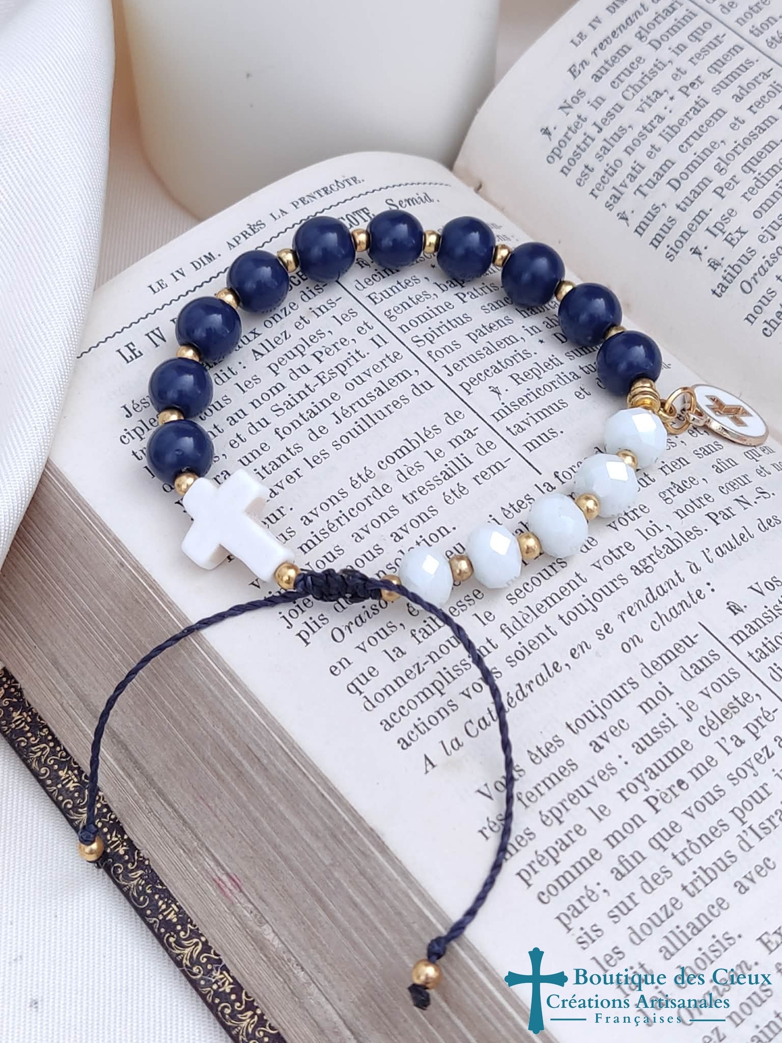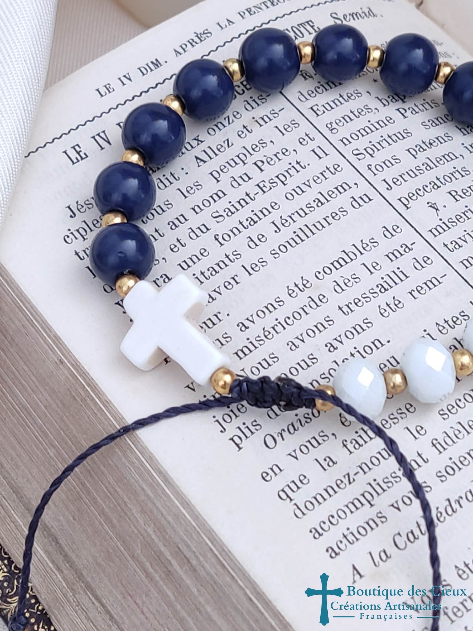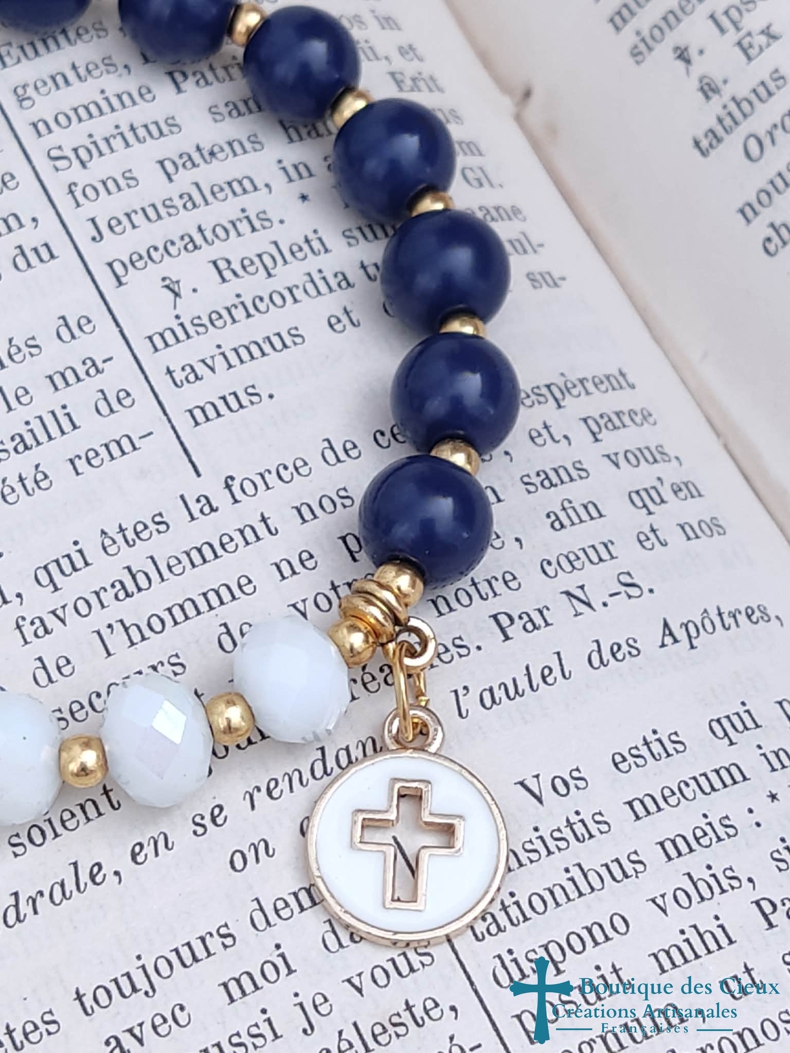 Bracelet dizainier pour femme composé de perles en verre lisse bleu représentant les grains de prière, et de verre facetté pour une belle finition. La croix façon howlite démarque le début de prière et la jolie médaille la fin (ou inverssement selon votre choix). Chaque grains est séparé d'une bille dorée ce qui permet un égrainage simple et facilite la concentration.Véritable bijou, ce dizainier à été créé pour avoir l'apparence d'un bracelet ordinaire tout en respectant les étapes de la prière.Entièrement monté à la main sur du fil polyester à macramé, ce bijou est très solide et souple. |
