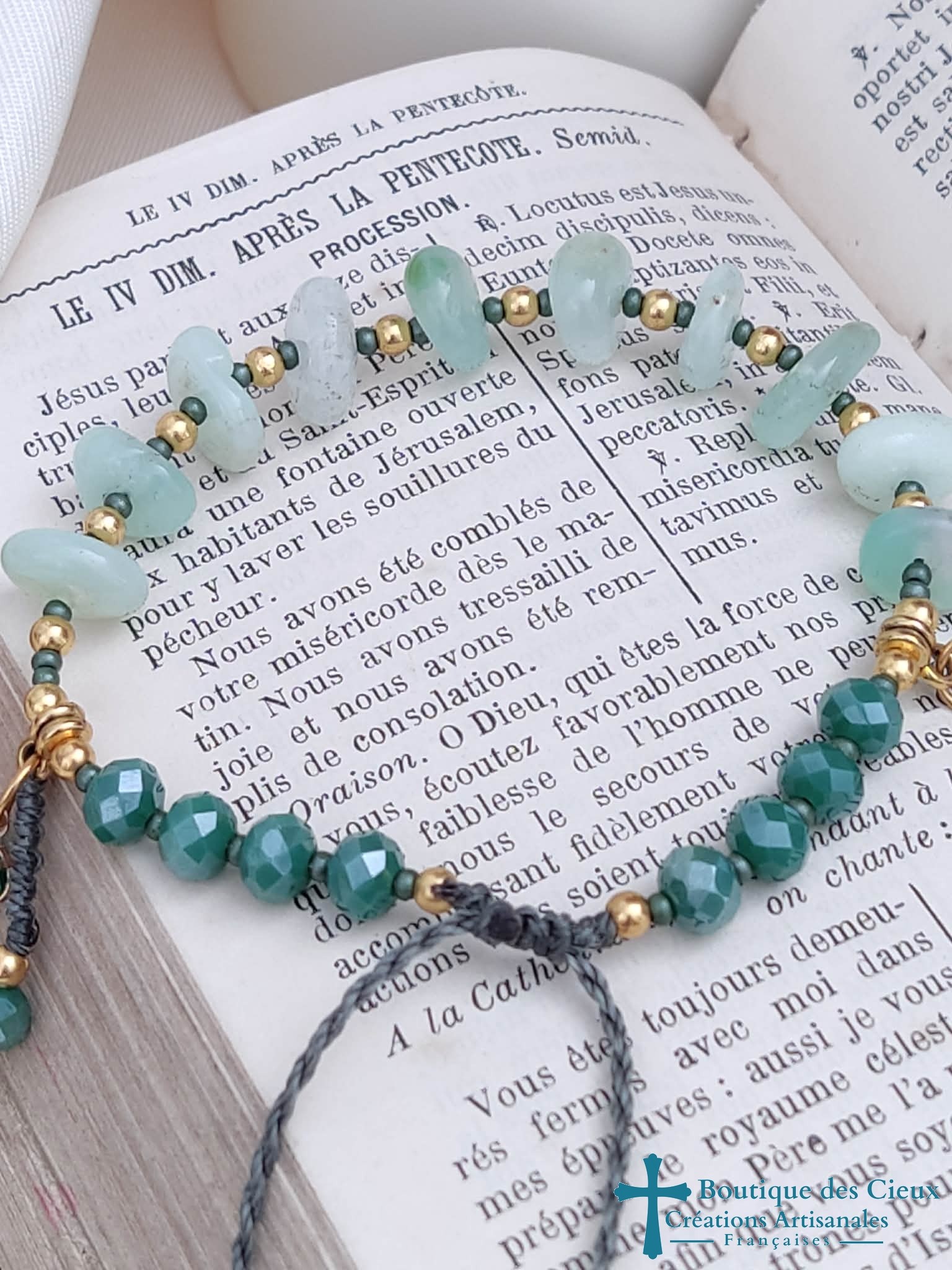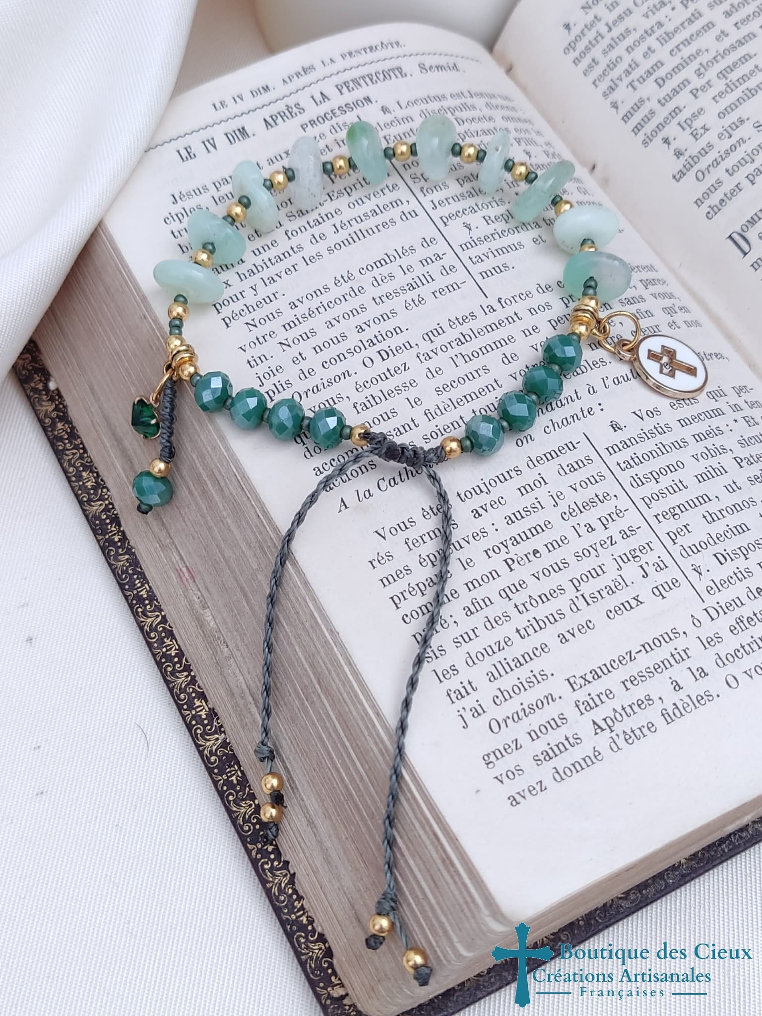 Bracelet dizainier pour femme composé de chip's de jade vert d'afghanistan (aide à trouver la paix intérieure) et de perles en verre facetté.Ce dizainier à été créé pour avoir l'apparence d'un bracelet ordinaire tout en respectant les étapes de la prière. Les grains sont facilement discernables grâce aux petites pièces doré qui les séparent. La jolie médaille croix émaillée marque le début de la méditation, et le joli petit coeur accompagné de sa perle la fin (ou inversement selon votre choix)Entièrement monté à la main sur du fil polyester à macramé, ce bijou réglable grâce à son fermoir coulissant, est très solide. |