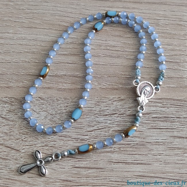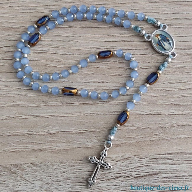 Mini chapelets de poche à l'énergie Mariale composés de perles en verre bleu clair. Les grains des dizaines sont facilement discernables grâce aux petites perles qui les séparent, ainsi qu' avec la différence de forme et taille avec les "Notre Père". Vous souhaitez prier le chapelet, mais ne savez pas comment procéder : rendez vous dans les pages à votre disposition. Vous y trouverez des explications et un livret complet téléchargeable en format pdf vous y est offert. |