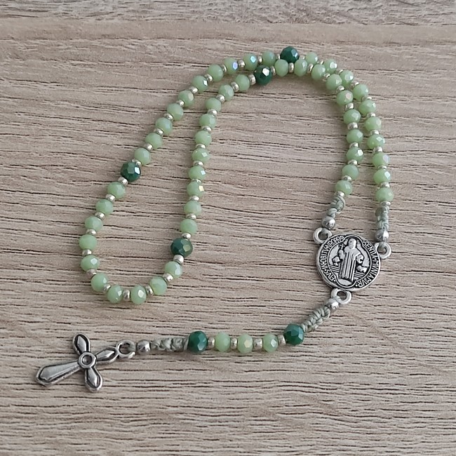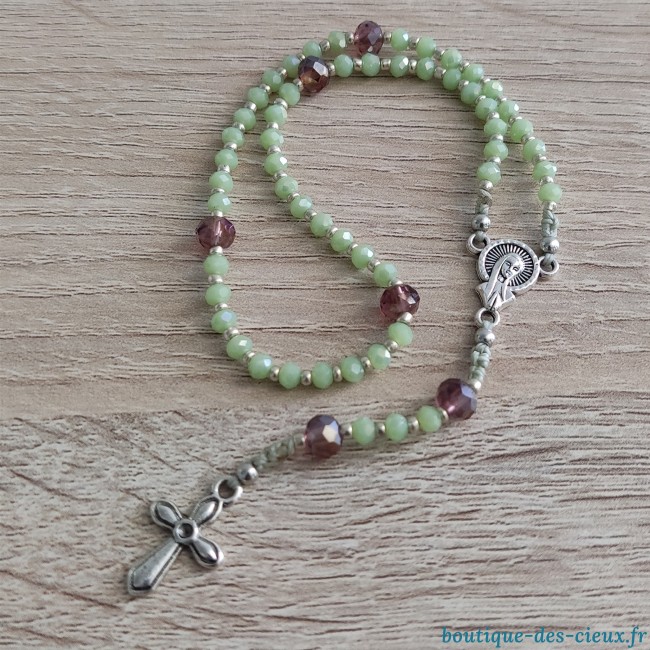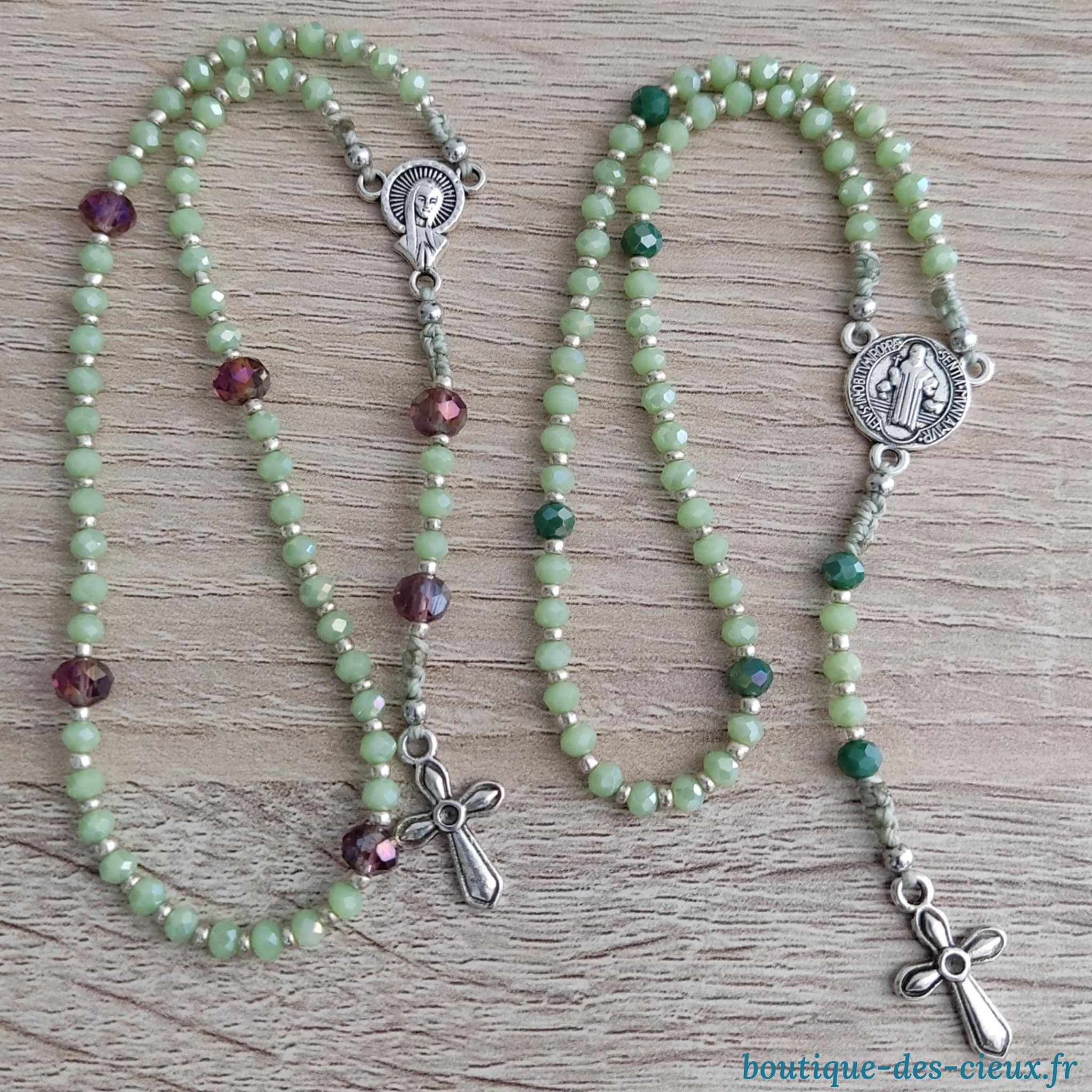 Mini chapelets de poche (ou à accrocher) composés de perles en verre vert. Les grains des dizaines sont facilement discernables grâce aux petites perles qui les séparent, ainsi qu' avec la différence de forme et taille avec les "Notre Père". Vous souhaitez prier le chapelet, mais ne savez pas comment procéder : rendez vous dans les pages à votre disposition. Vous y trouverez des explications et un livret complet téléchargeable en format pdf vous y est offert. |
