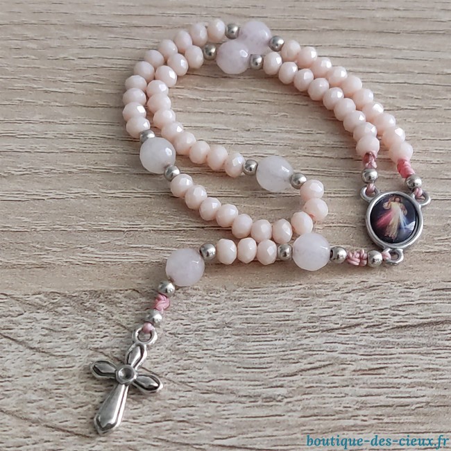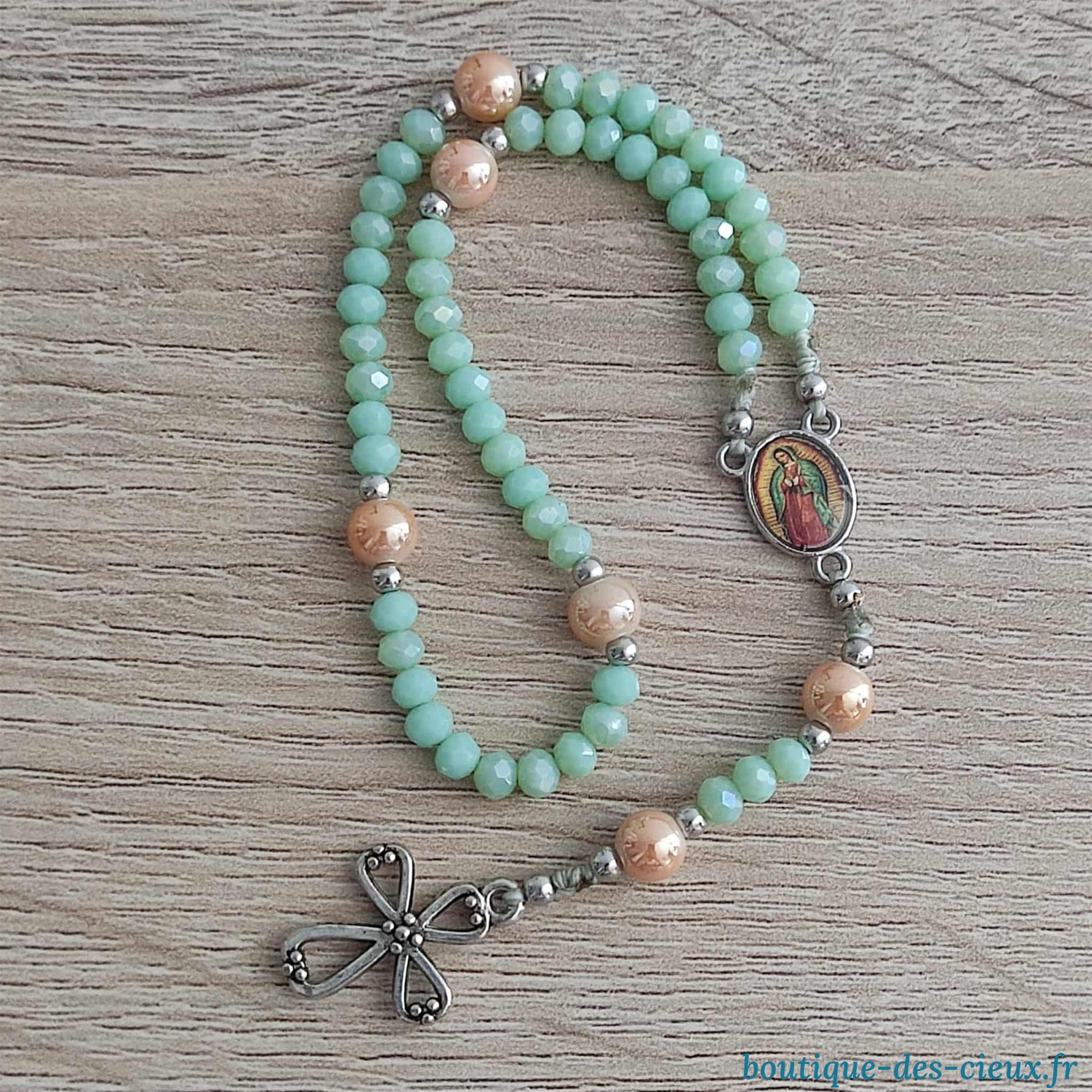 Minis chapelets de poche composés de perles en verre vert ou rose (au choix). Les grains des dizaines sont facilement discernables grâce aux petites perles qui les séparent, ainsi qu' avec la différence de forme et taille avec les "Notre Père". Vous souhaitez prier le chapelet, mais ne savez pas comment procéder : rendez vous dans les pages à votre disposition. Vous y trouverez des explications et un livret complet téléchargeable en format pdf vous y est offert. |
