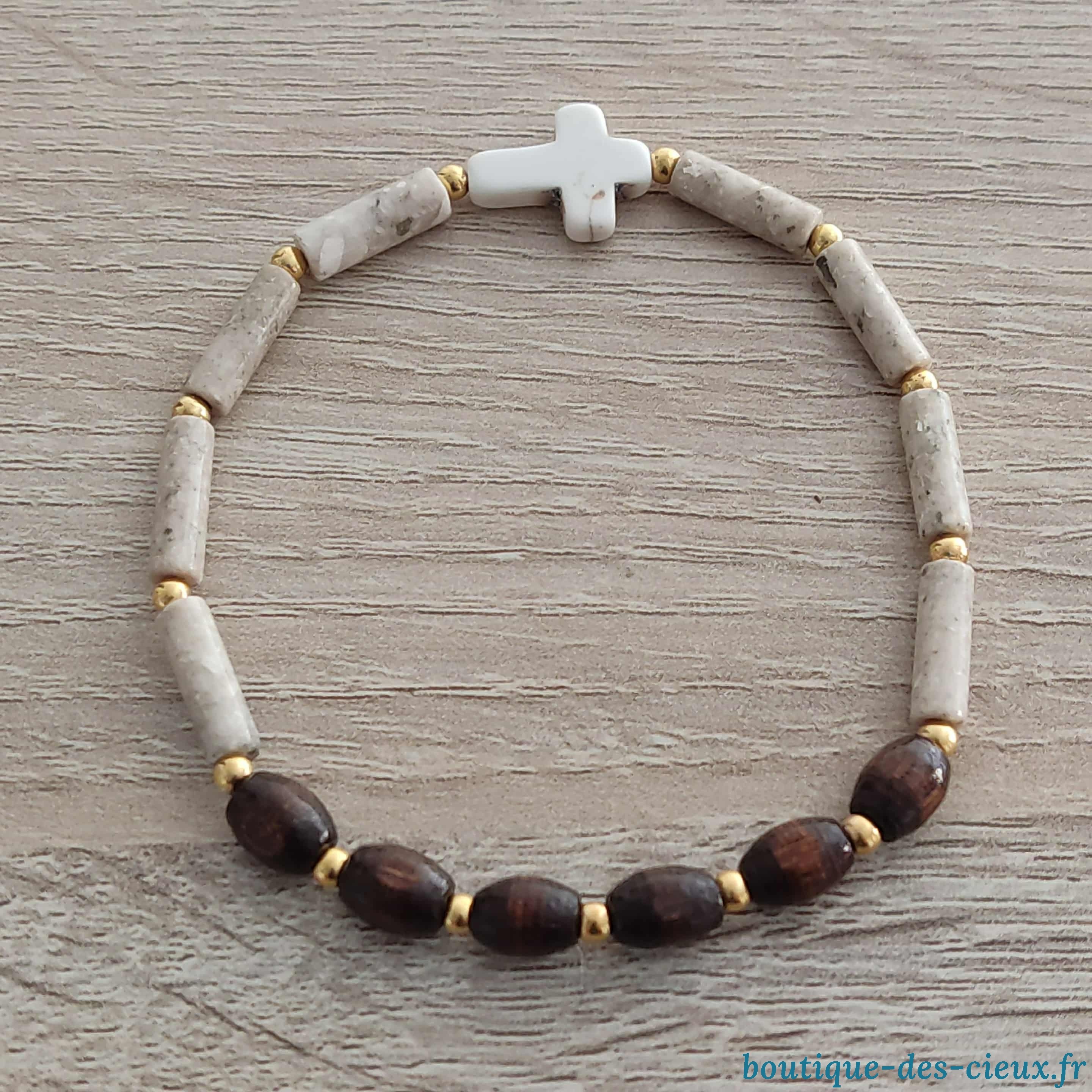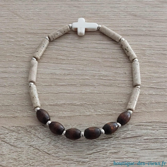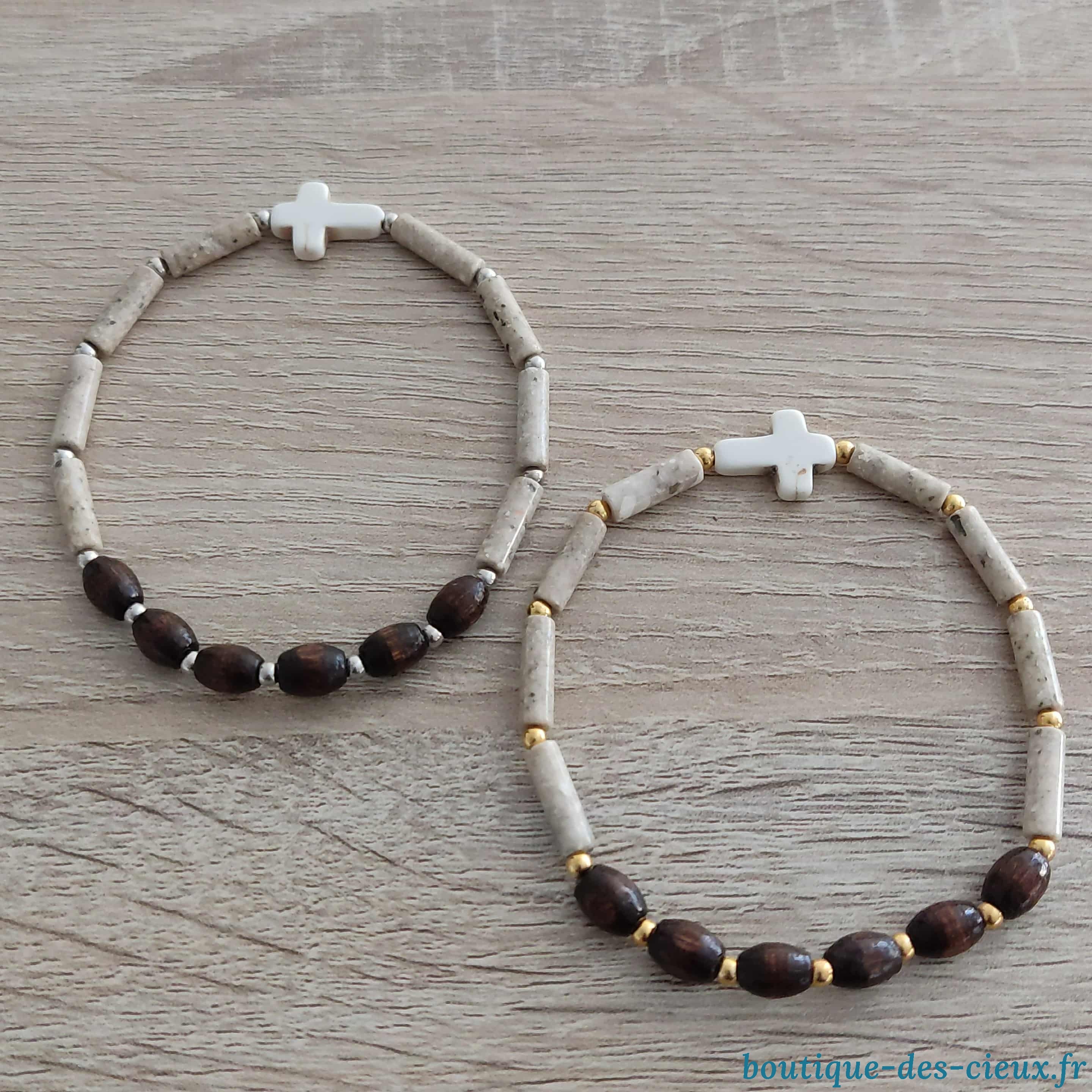 Bracelets pour hommes composés de pierres naturelles, d'une croix synthétique façon howlite et de perles en bois. |