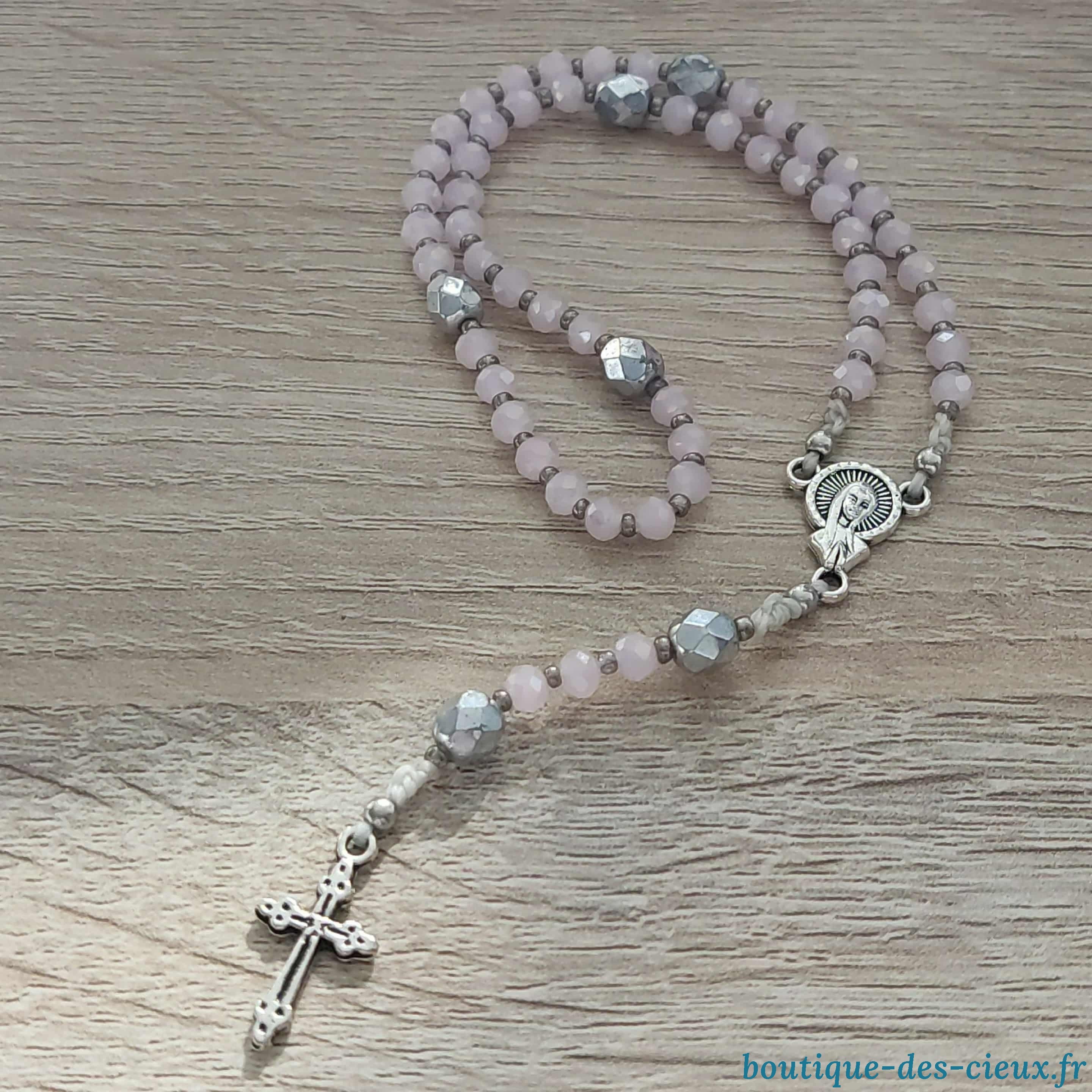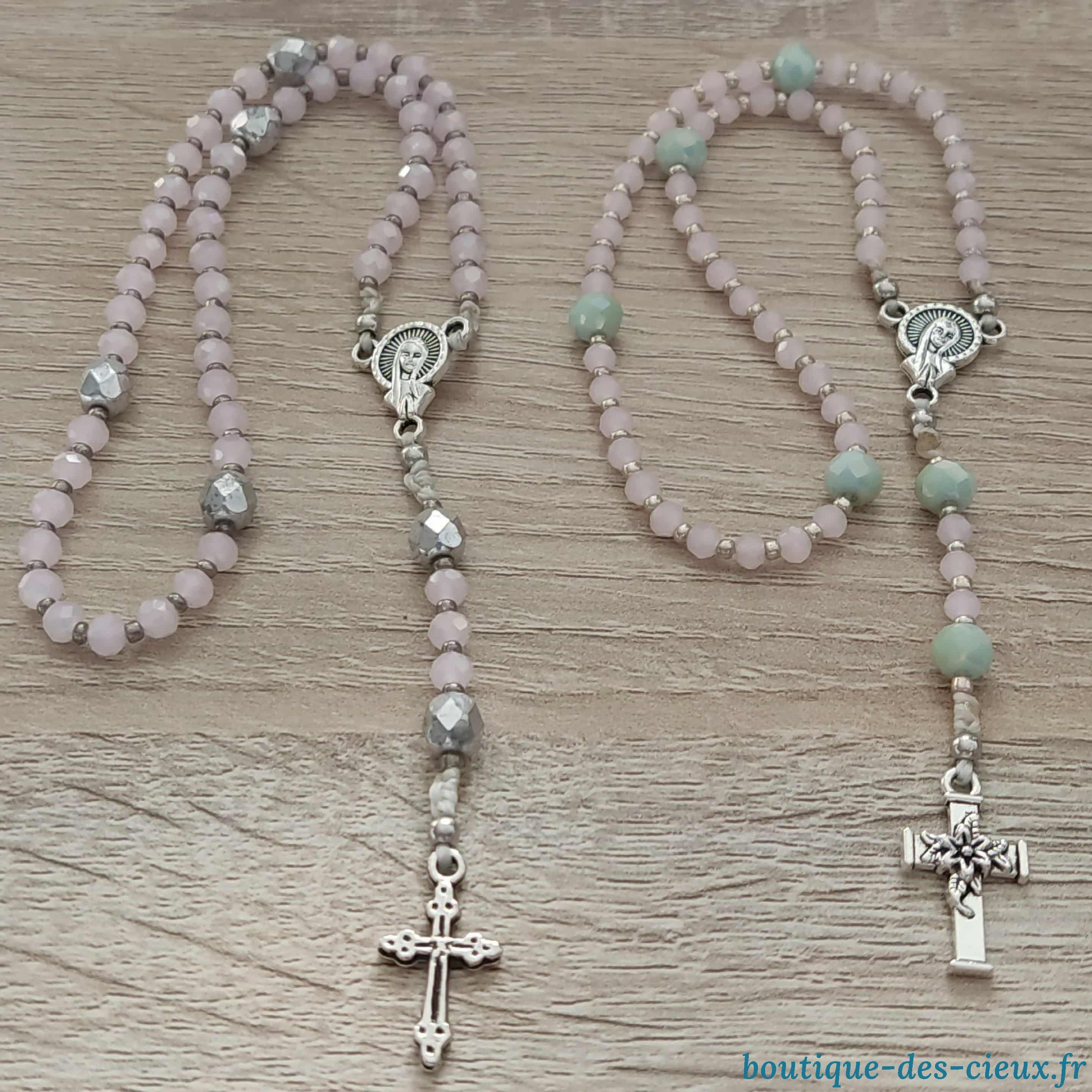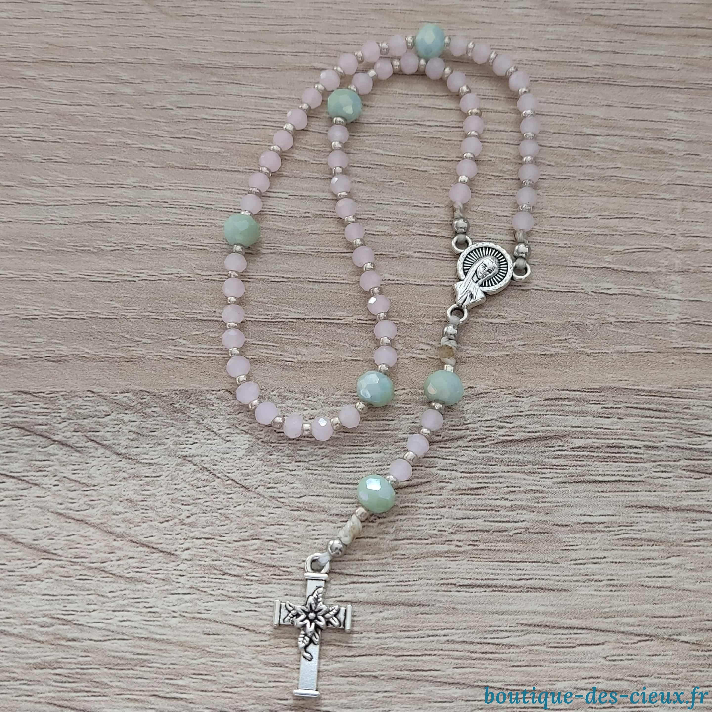Minis chapelets de poche composés de perles en verre rose. Les grains des dizaines ( qui glissent sur le fil) sont facilement discernables grâce aux petites perles qui les séparent, ainsi qu' avec la différence de forme et taille avec les "Notre Père" à choisir (perles argentées ou vertes) . Vous souhaitez prier le chapelet, mais ne savez pas comment procéder : rendez vous dans les pages à votre disposition. Vous y trouverez des explications et un livret complet téléchargeable en format pdf vous y est offert. |