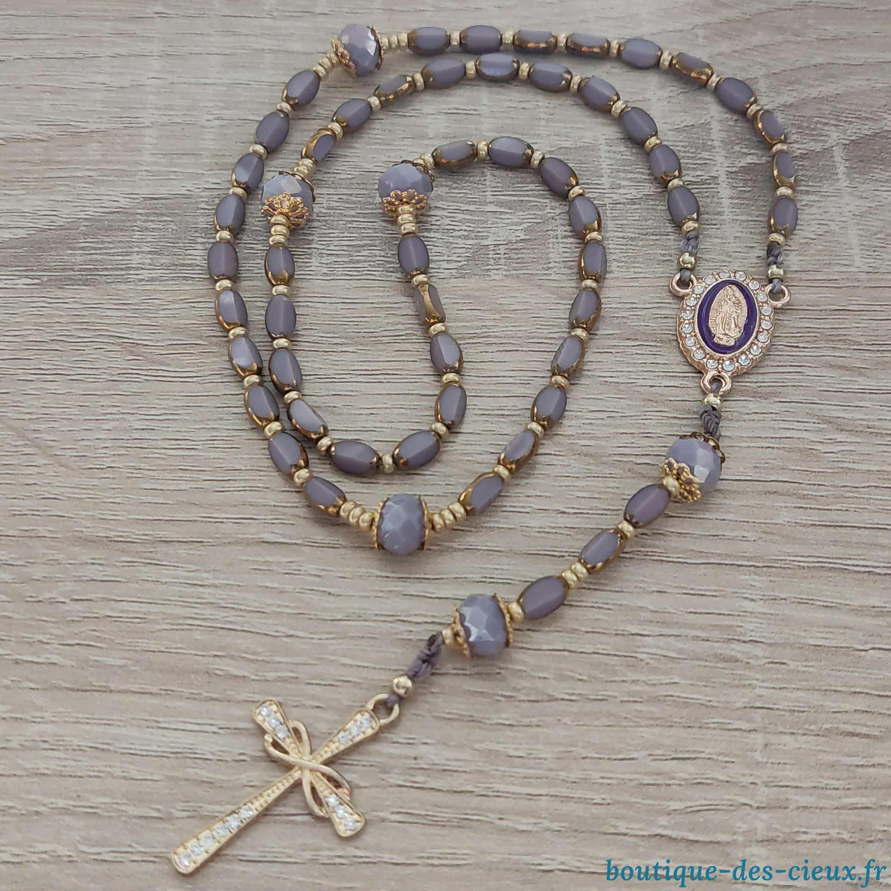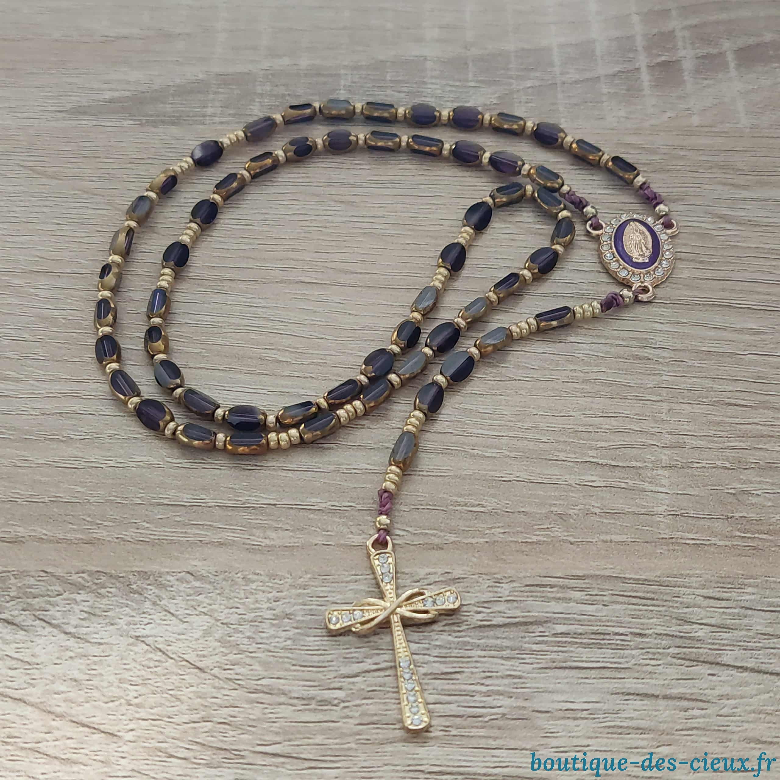 Chapelets en verre forme grain de riz (parme mat ou améthyste transparent au choix) Connecteur violet à strass et croix doré à strass De texture souple, il est facilement glissable dans vos poches. Il peut également être suspendu à vos rétroviseurs sans gêner la visibilité. Vous souhaitez prier le chapelet, mais ne savez pas comment procéder : rendez vous dans les pages à votre disposition. Vous y trouverez des explications et un livret complet téléchargeable en format pdf vous y est offert. |
