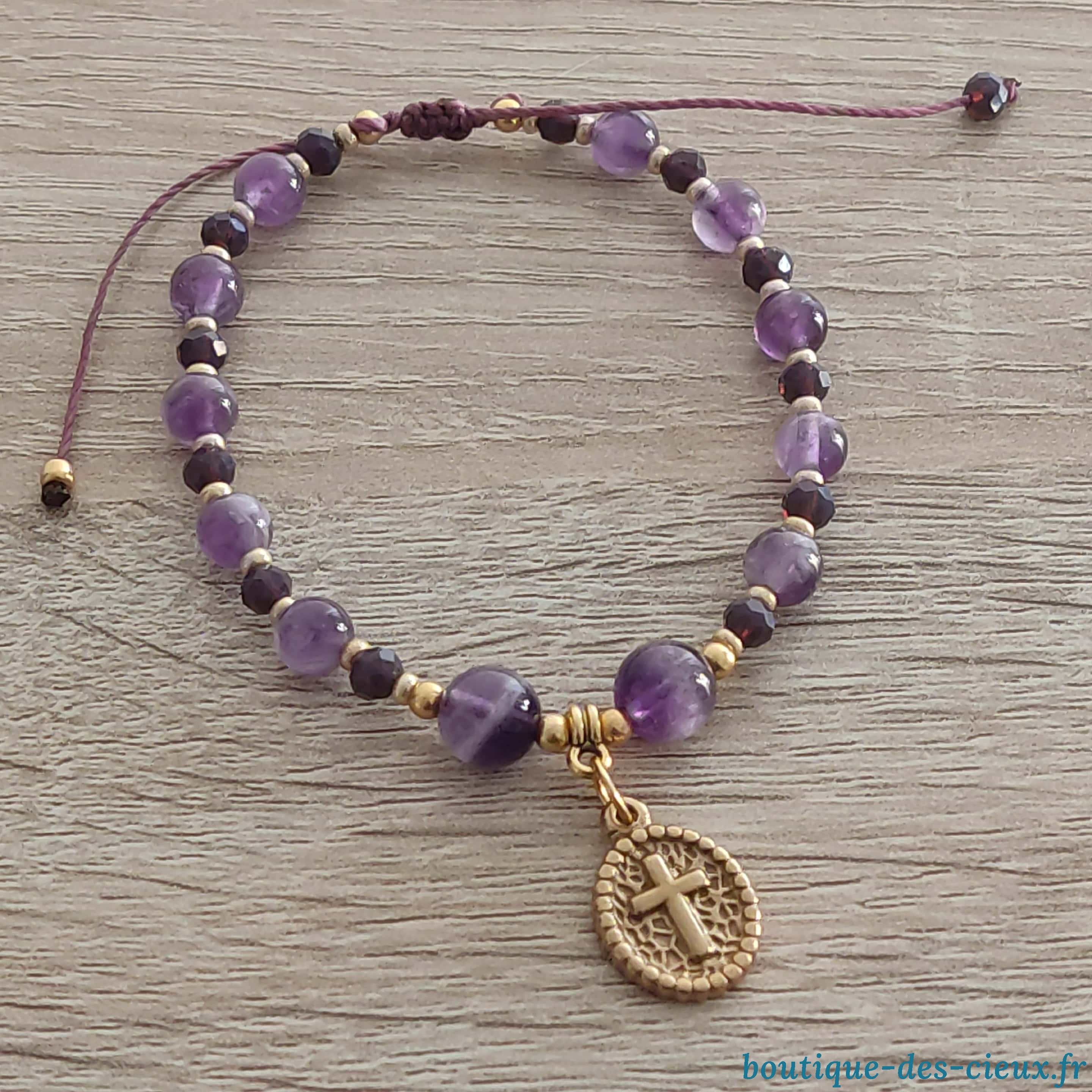 Bracelet en améthyste naturelle, perle en verre sur fil polyester, fermoir gilssant pour un bijou réglable de 18 à 26 cm |