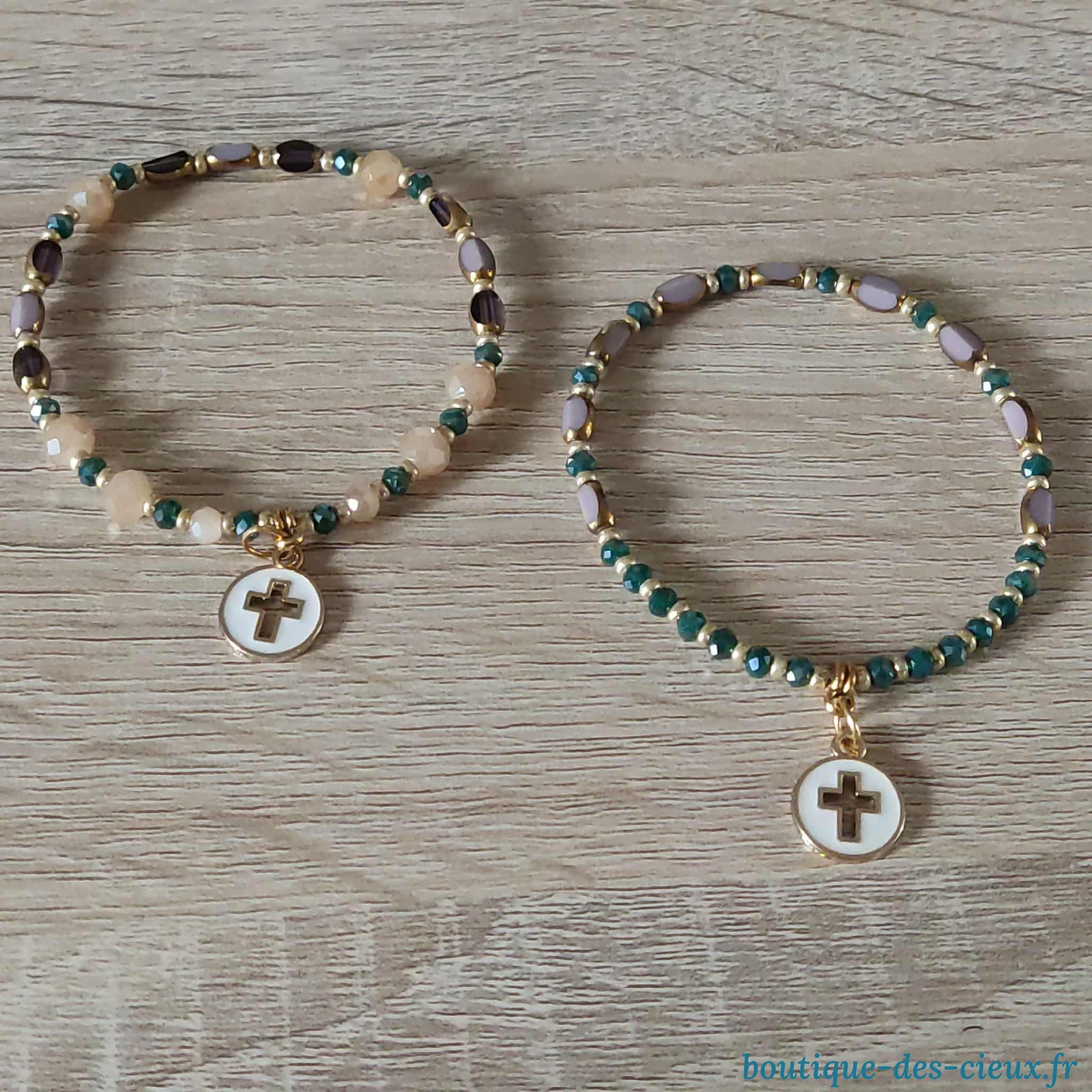 Jolis bracelets pour femmes composés de perles en verre, perles de rocailles et pièces en métal dorées. Entièrement montés à la main sur fil élastique. Modifications possible sur fil polyester avec fermoir glissant pour obtenir un modèle plus grand sur simple demande. Cependant il faudra patienter une petite journée supplémentaire pour l'expédition, le temps de la création. Ces bijoux sont bénis par un prêtre |