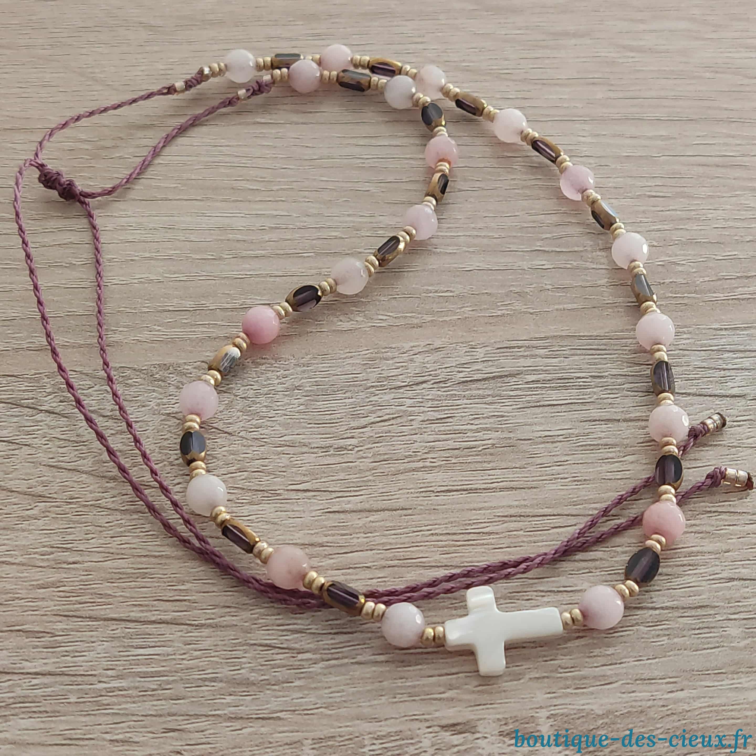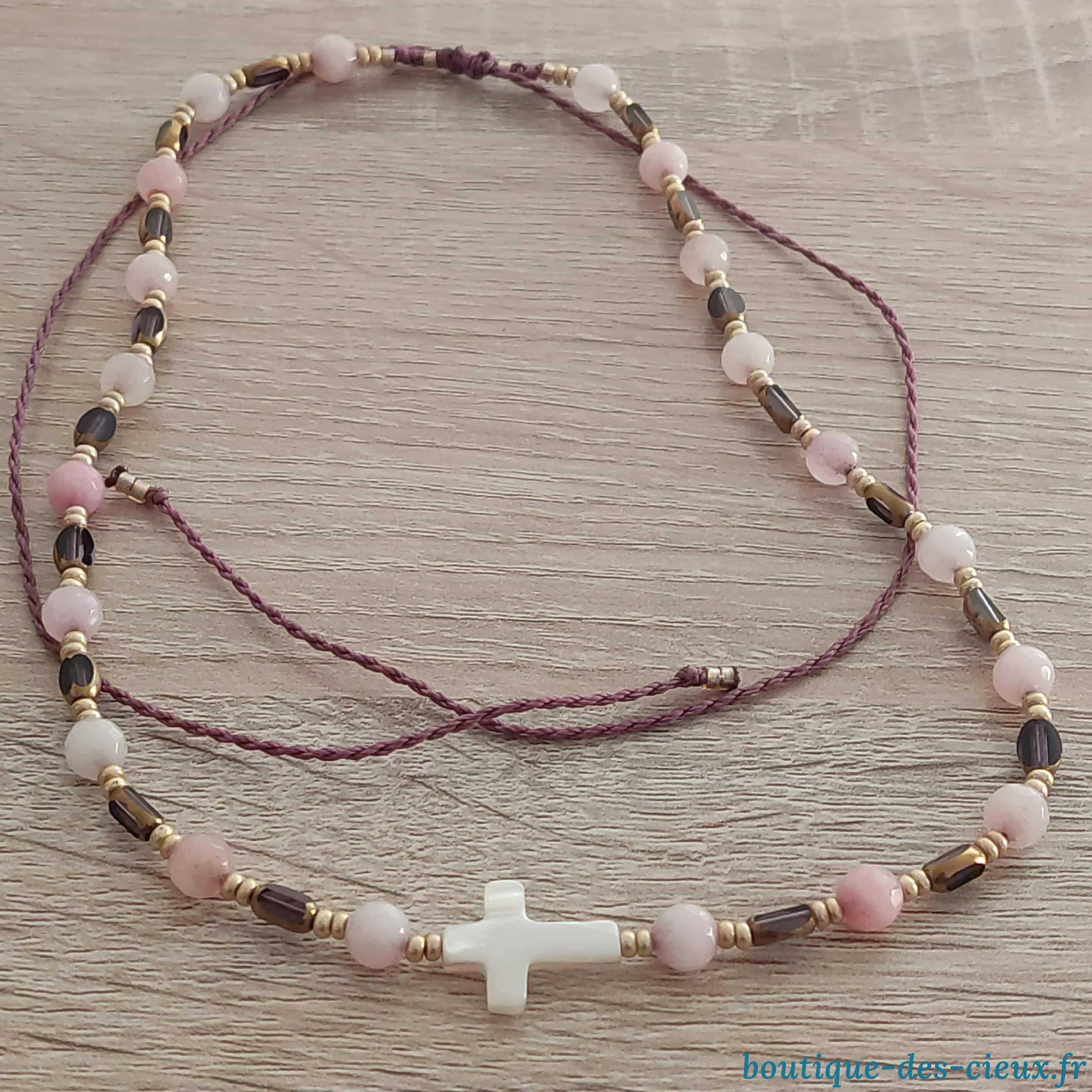 Croix en nacre entourée de quartz rose et grain de riz en verre. Montage sur fil polyester. Longueur réglable. Tous nos bijoux sont pensés et créés avec créativité et originalité pour vous permettre d'exprimer votre foi en douceur tout en vous sublimant, comme le ferait tout bijou sans vocation chrétienne Ce bijou sera béni par un prêtre. |