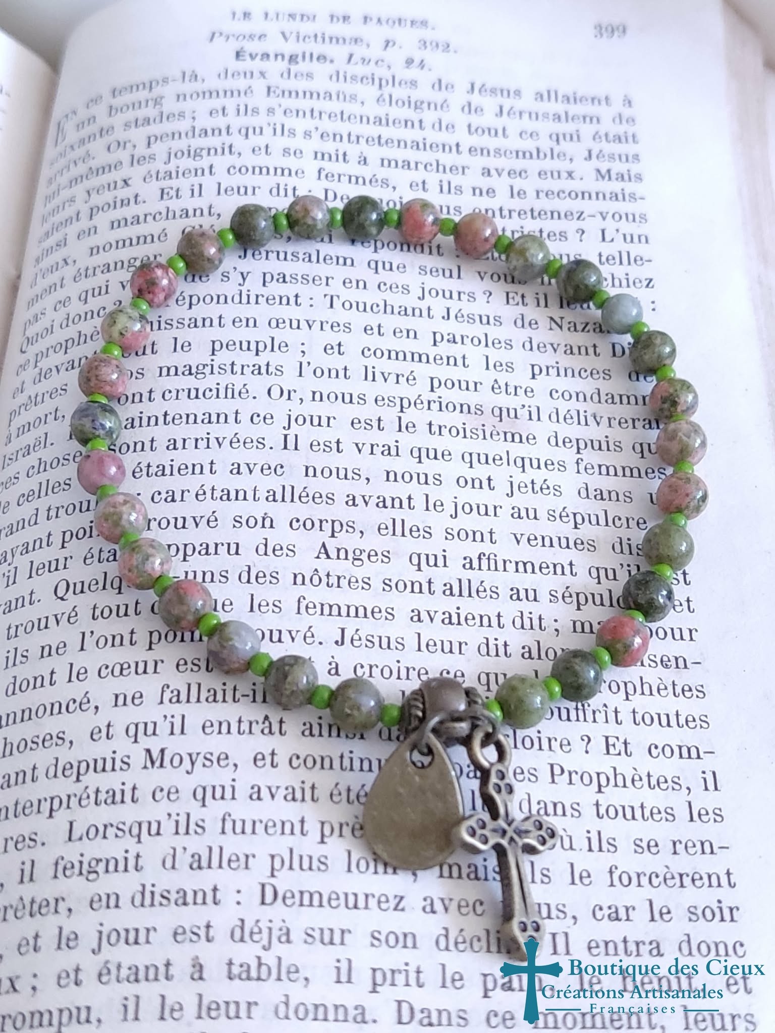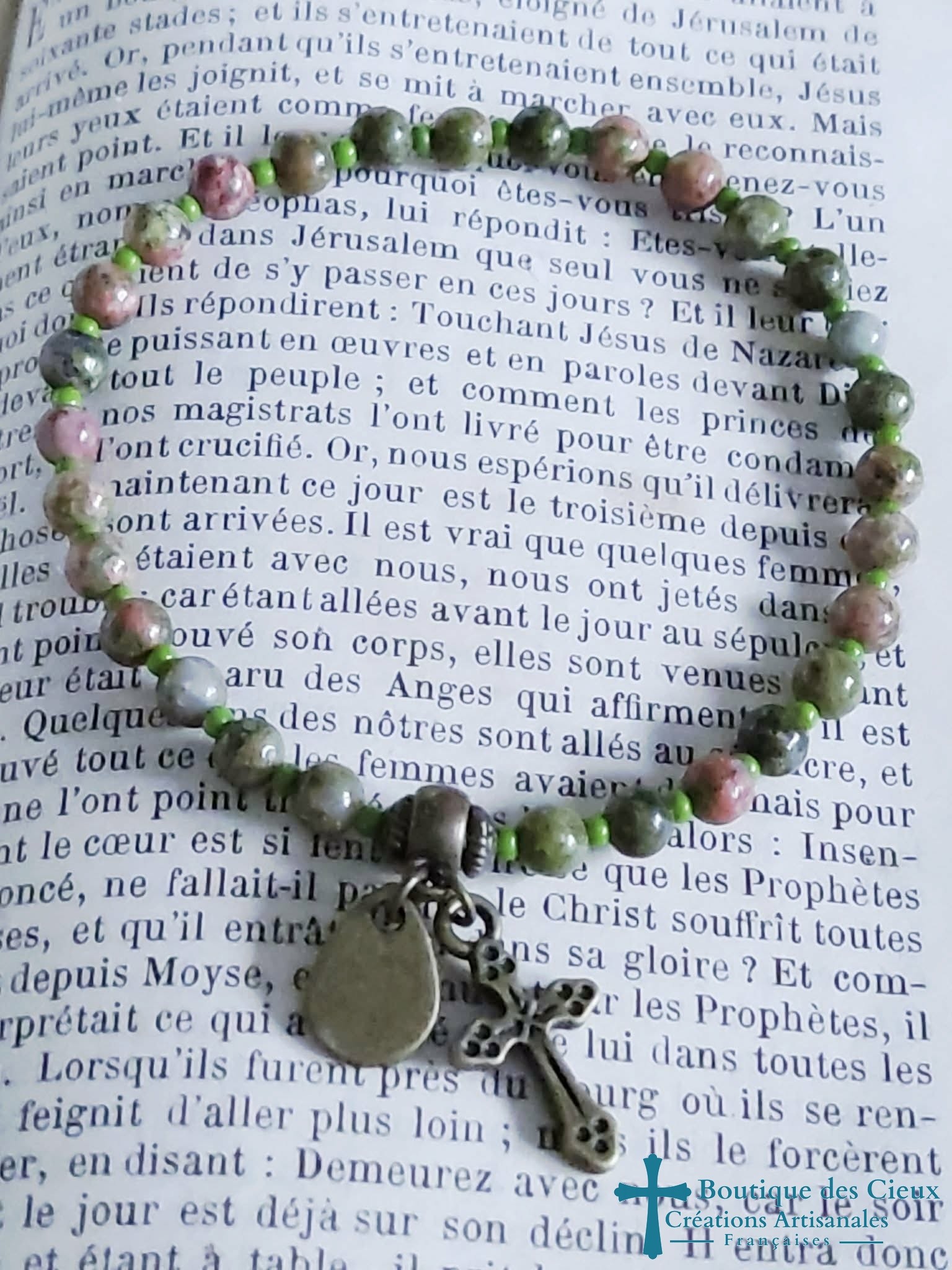 Joli bracelet style ethnique pour femmes composé d' unakite et breloque croix bronze. Entièrement monté à la main sur fil élastique. Ce bijou sera béni par un prêtre |