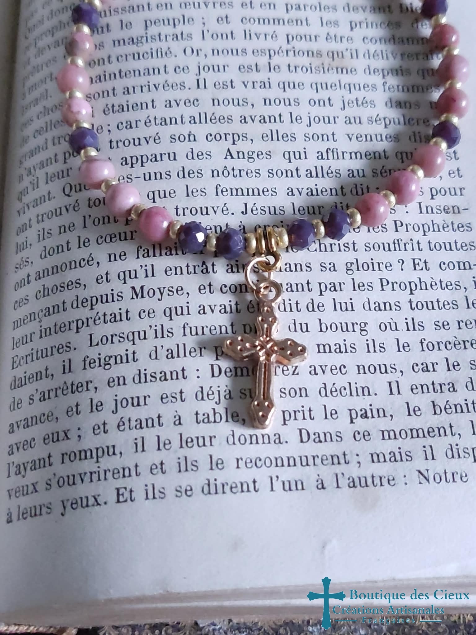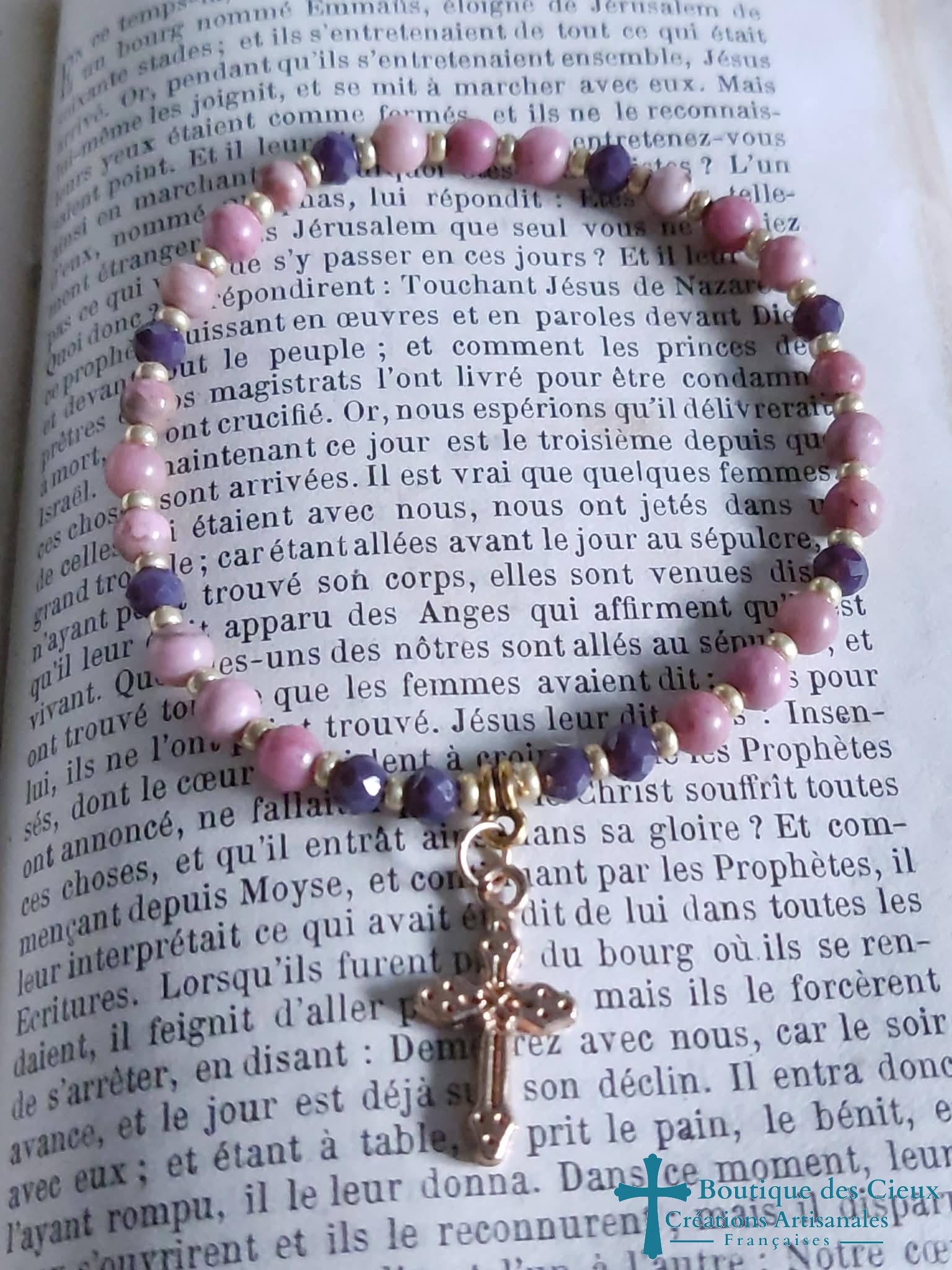 Bracelet pour femmes composé de rhodonite et jolie croix doré Entièrement monté à la main sur fil élastique. Ce bijou bien qu'il ne soit pas destiné à la prière sera béni par un prêtre |