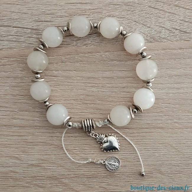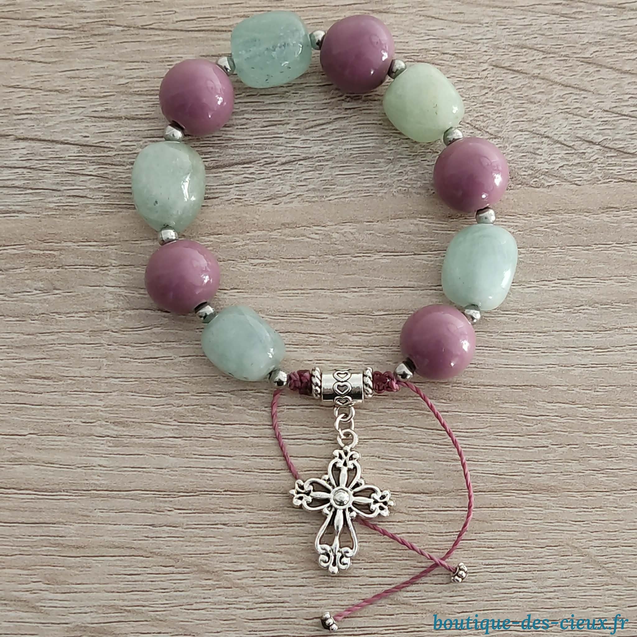 Dizainiers pour femmes, grands poignets, composés d'aigue marine et porcelaine ou jade blanc Véritable bijoux modernes, ces dizainiers ont été créés pour avoir l'apparence de bracelets ordinaires tout en respectant les étapes de la prière. Entièrement montés sur du fil polyester ciré, ils sont réglables grâce à leurs fermoirs coulissant. Vous souhaitez prier le dizainier, mais ne savez pas comment procéder : rendez vous dans les pages à votre disposition. Vous y trouverez des explications et un livret complet téléchargeable en format pdf vous y est offert. |