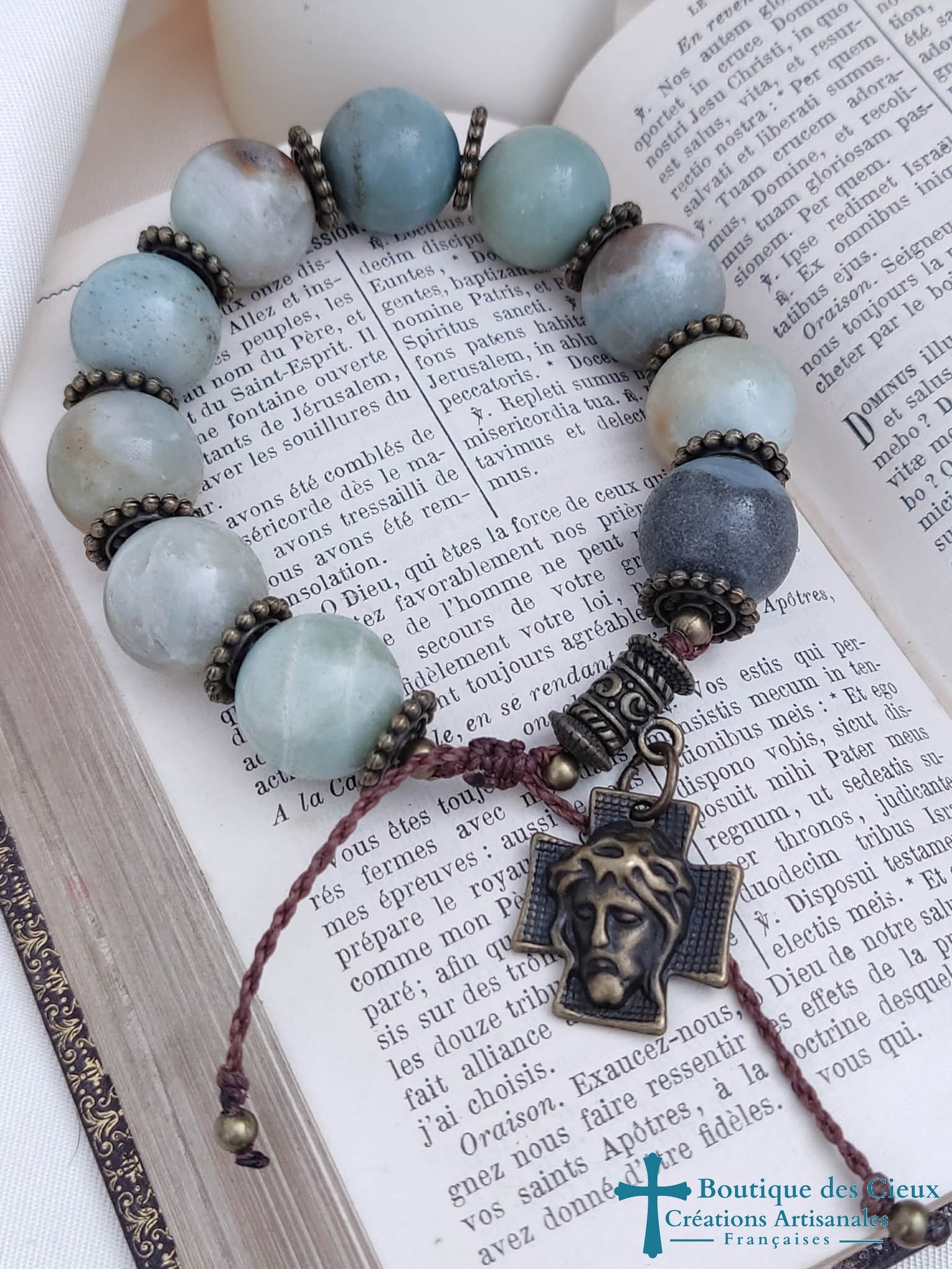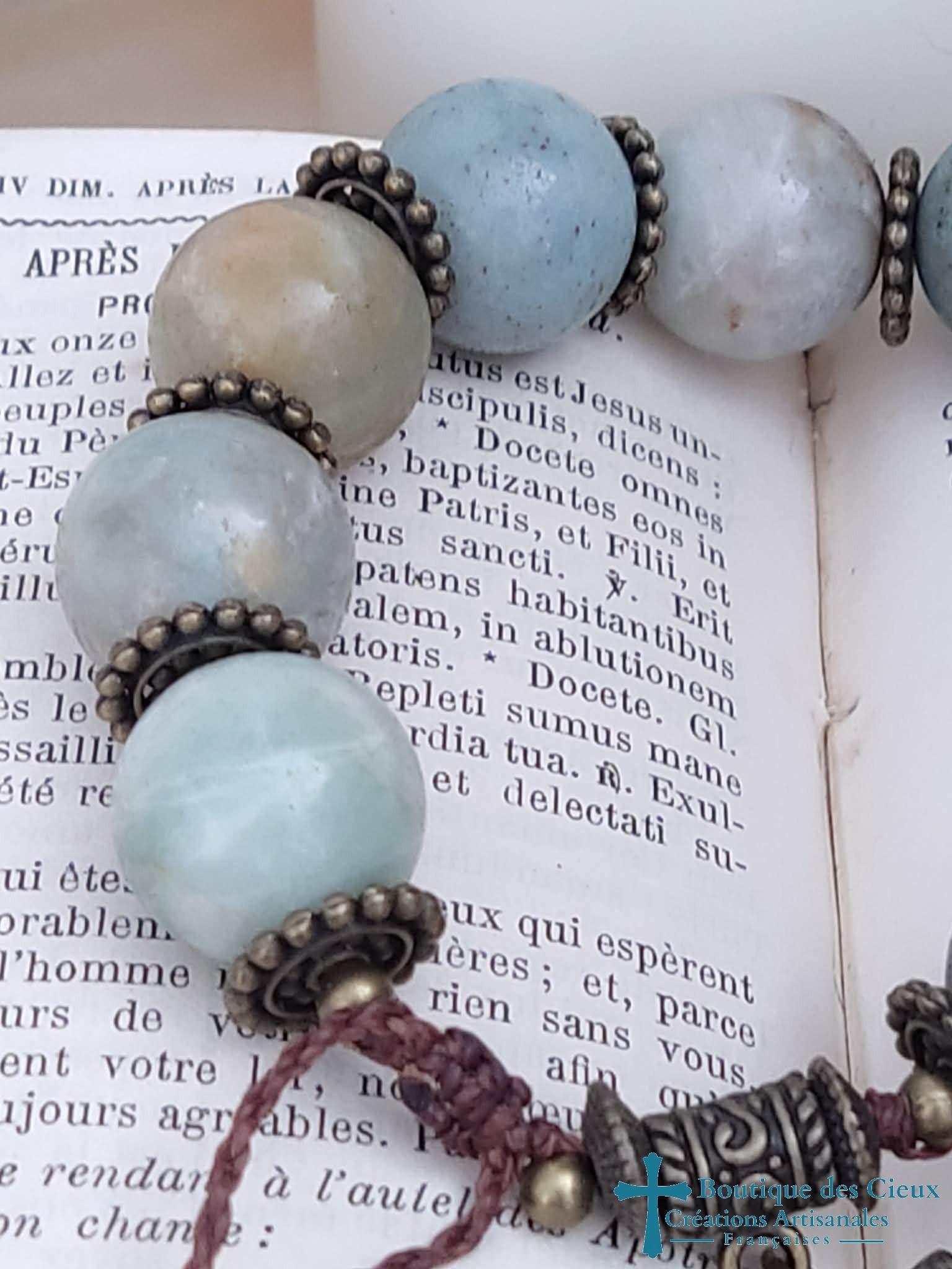Les grosses perles font de ce dizainier le bijou de prière parfait pour les poignets forts*. Créé pour paraître comme un bracelet ordinaire de style ethnique, ce dizainier en amazonite (aide à dissiper les énergies et pensées négatives)  vous permettra de prier discrétement où que vous soyez.