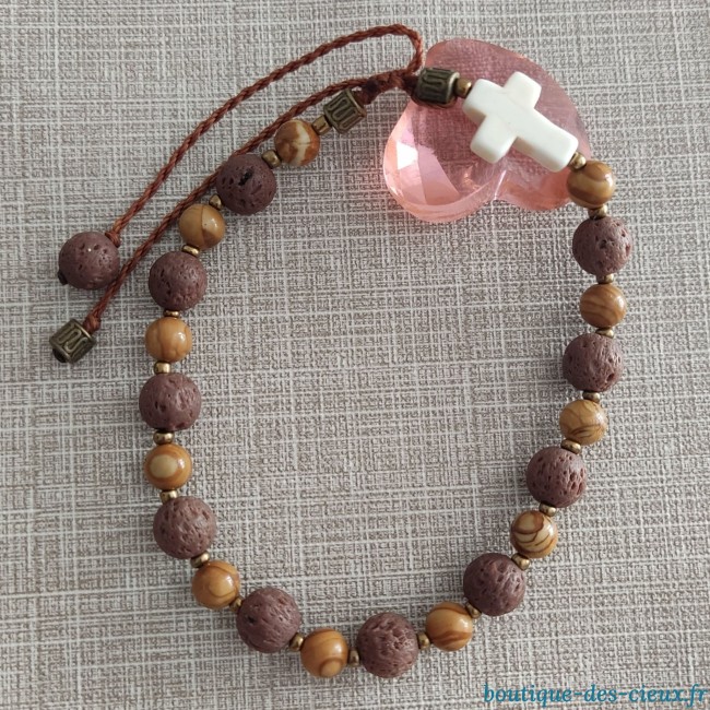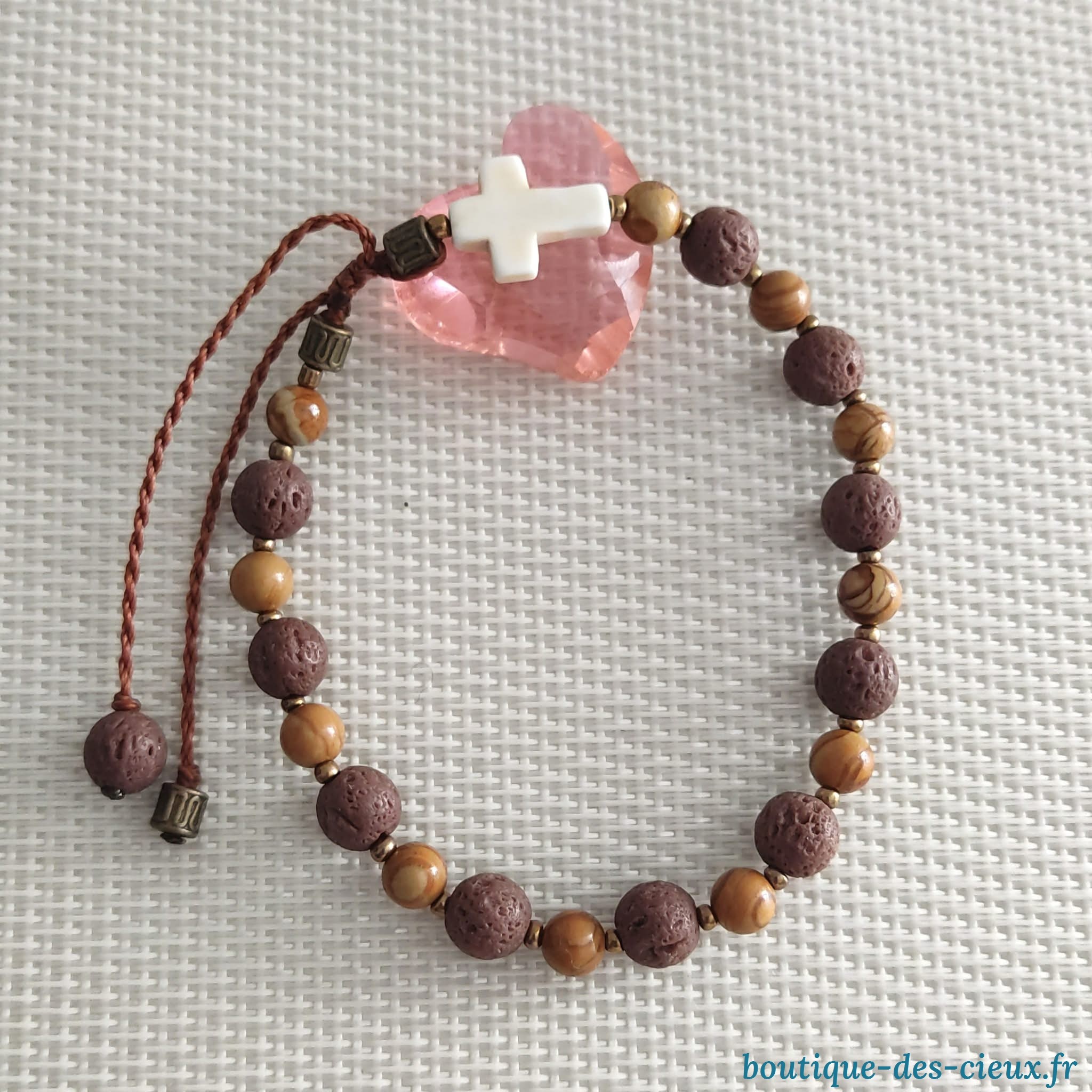 Bracelets dizainiers pour hommes composés de pierres naturelles : Pierre de lave ou jaspe paysage. Véritables bijoux modernes, ces dizainiers sont créés pour avoir l'apparence de bracelets ordinaires tout en respectant les étapes de la prière. Les grains sont facilement discernables et la croix marque la fin et début de la méditation. Entièrement montés à la main sur du fil polyester à macramé, ils sont réglables grâce à leurs fermoirs coulissants Vous souhaitez prier le dizainier, mais ne savez pas comment procéder : rendez vous dans les pages à votre disposition. Vous y trouverez des explications et un livret complet téléchargeable en format pdf vous y est offert. |