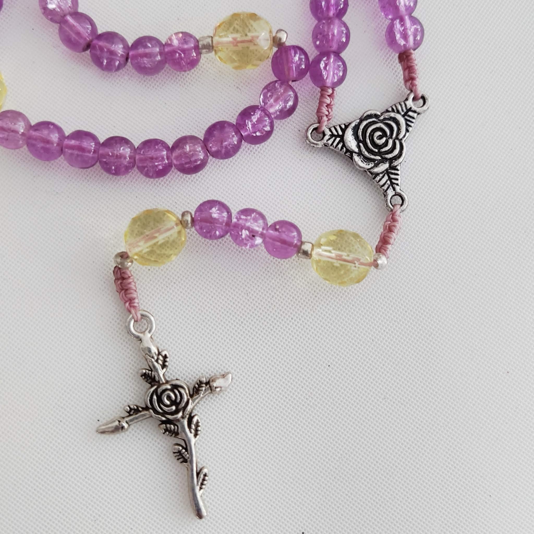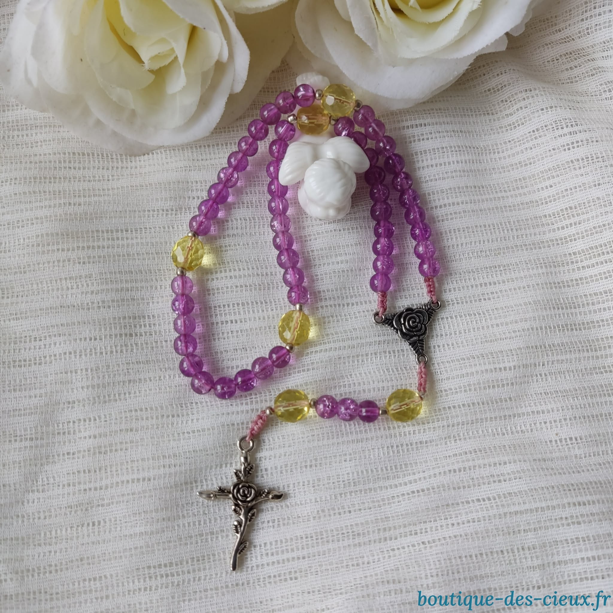 Chapelets composés de perles en verre effet craquelé rose ou bleu (au choix), perles jaunes et métal argenté ou bronze (au choix) . Les grains des dizaines glissent facilement sur le fil pour savoir où vous en êtes, les "Notre Père" sont facilement distinguables grâce à leur différence de taille et forme. Vous souhaitez prier le chapelet, mais ne savez pas comment procéder : rendez vous dans les pages à votre disposition. Vous y trouverez des explications et un livret complet téléchargeable en format pdf vous y est offert. |