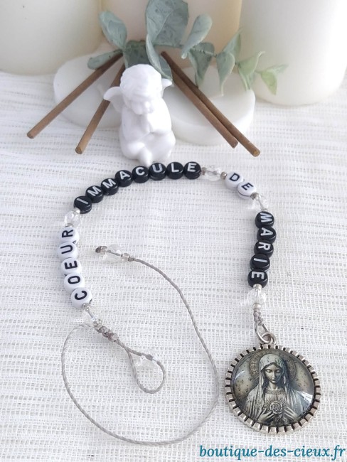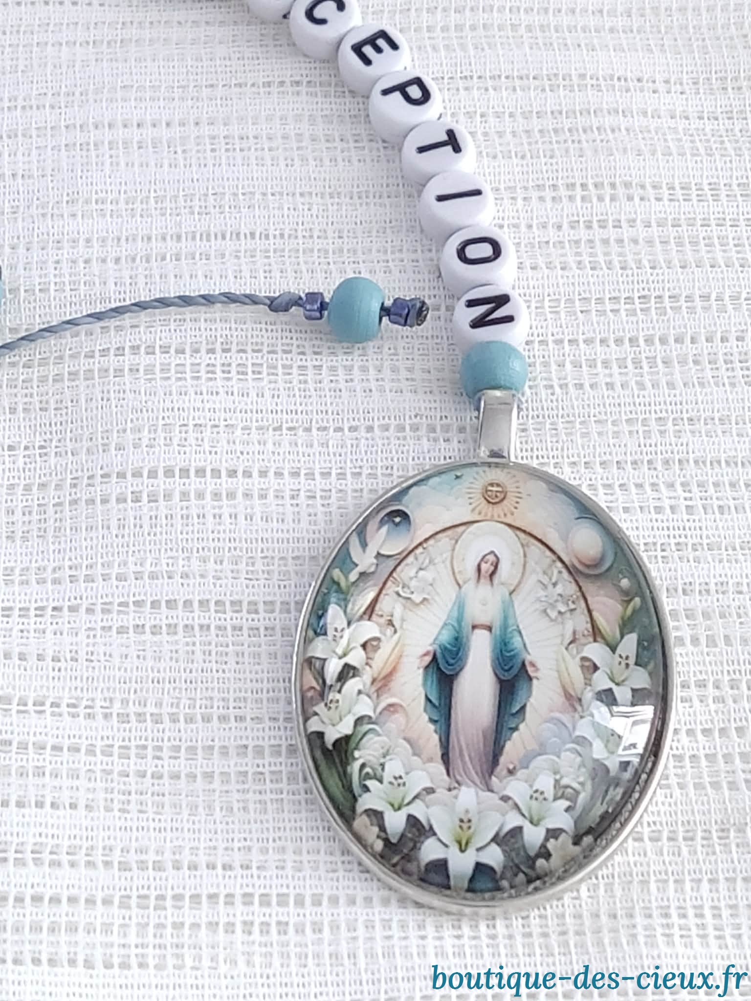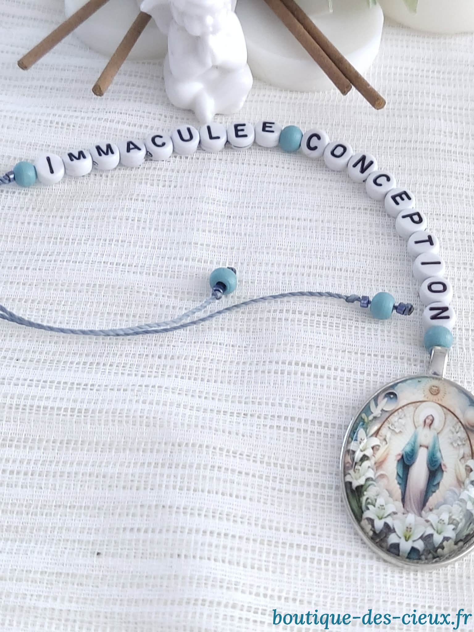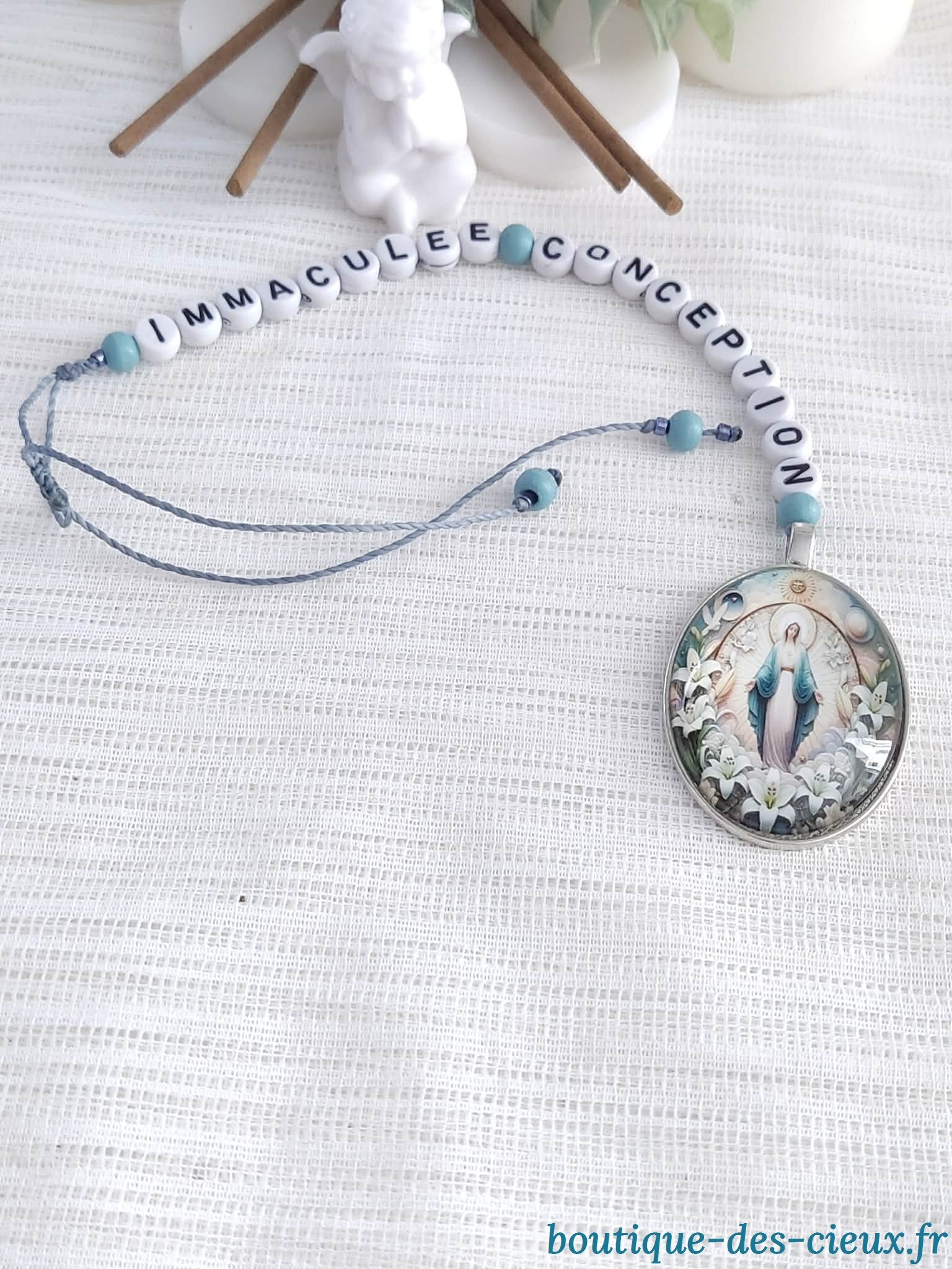 Suspension décorative Sainte Marie et messages : Immaculée Conception en perles lettres synthétiques.Cette création peut par exemple servir de décoration de rétroviseurCe bijou sera béni par un prêtre. |