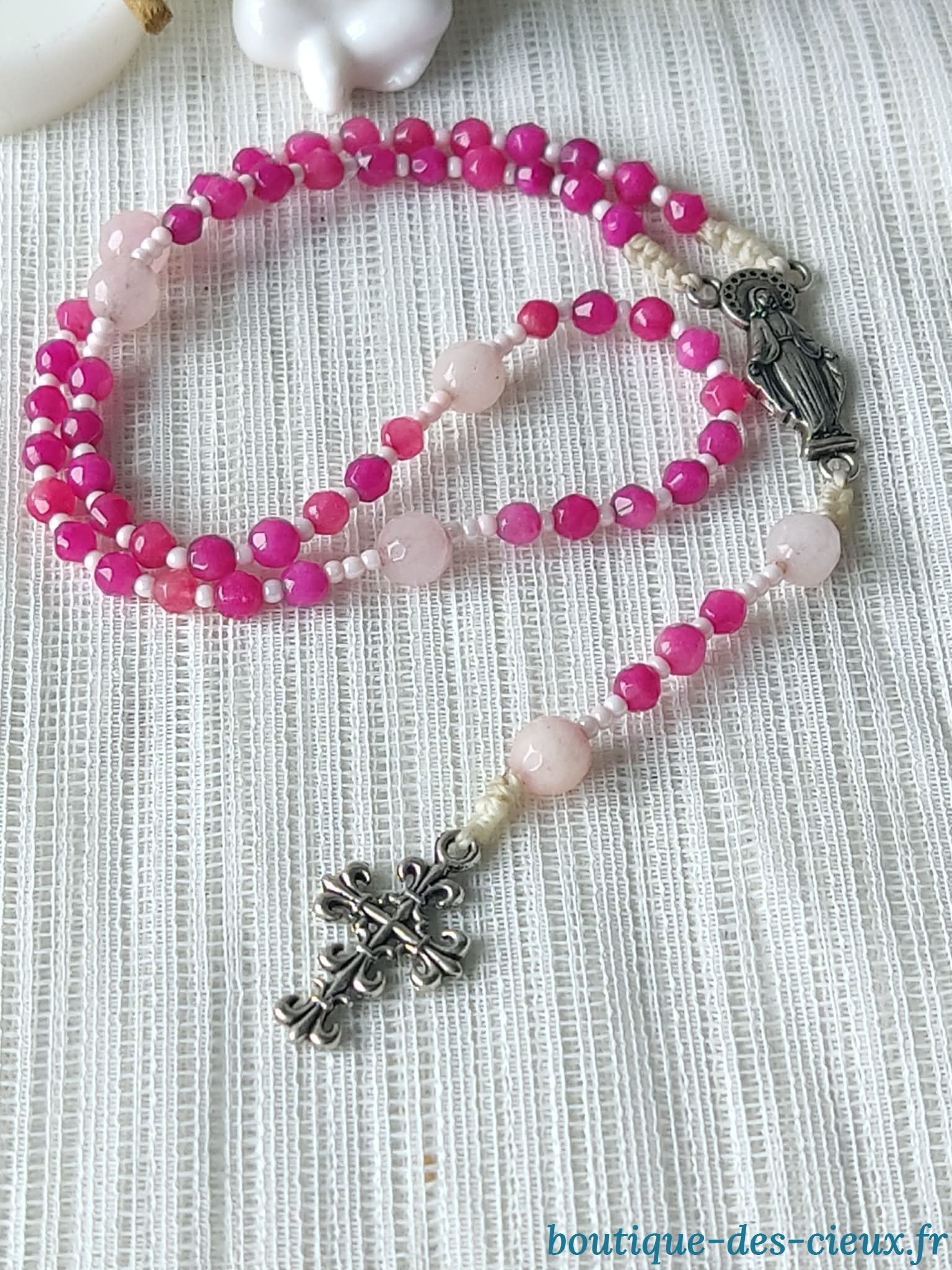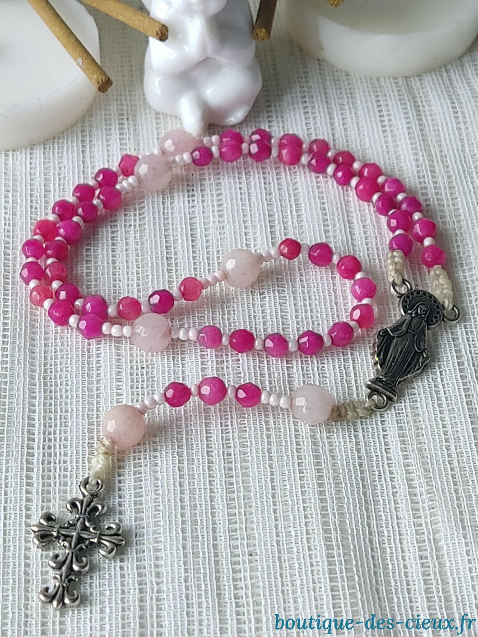 Petit chapelet composé de perles en pierres naturelles jade teinté fuchsia ( permet la relaxation) et quartz rose (ouvre l'esprit) facetté.