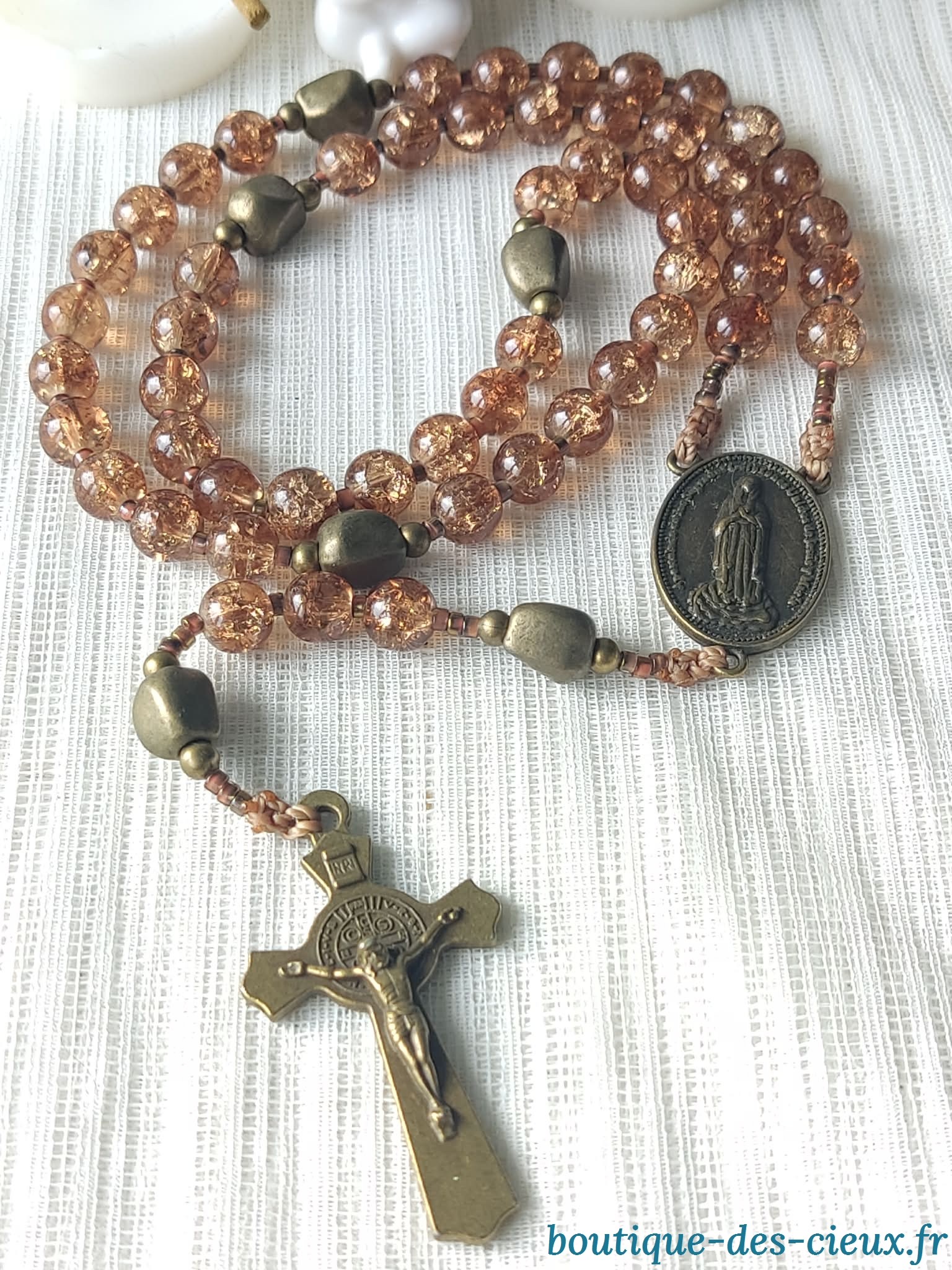 Chapelet pour homme composé de perles en verre lisse effet craquelé marron et de pièces en métal bronze.