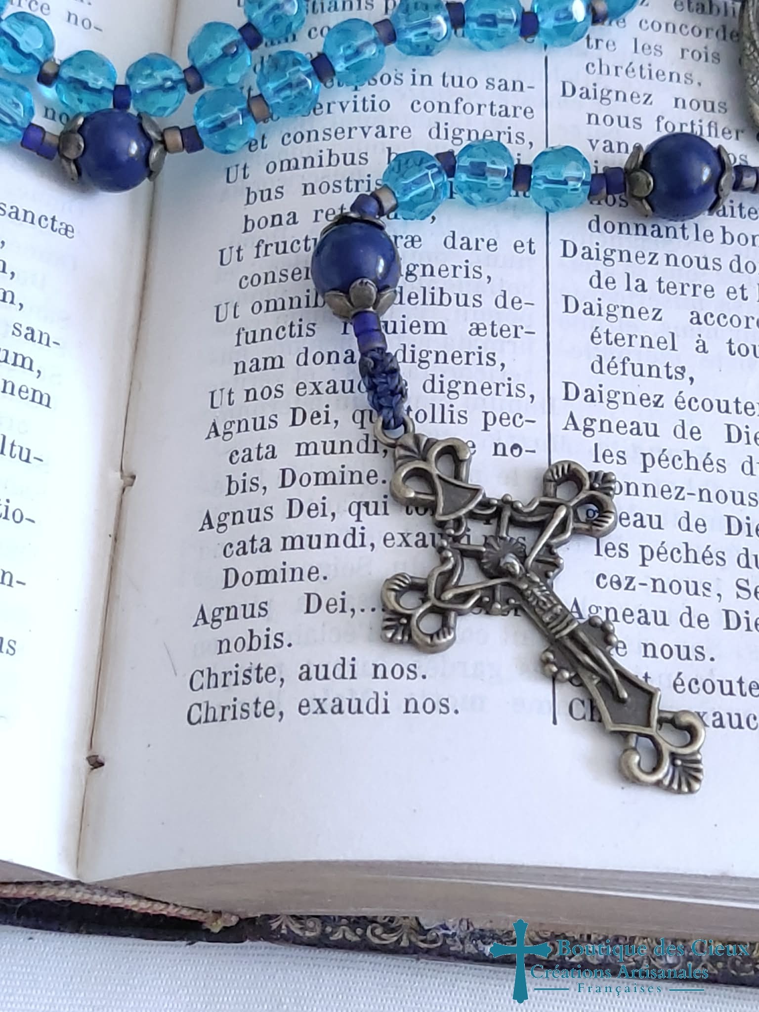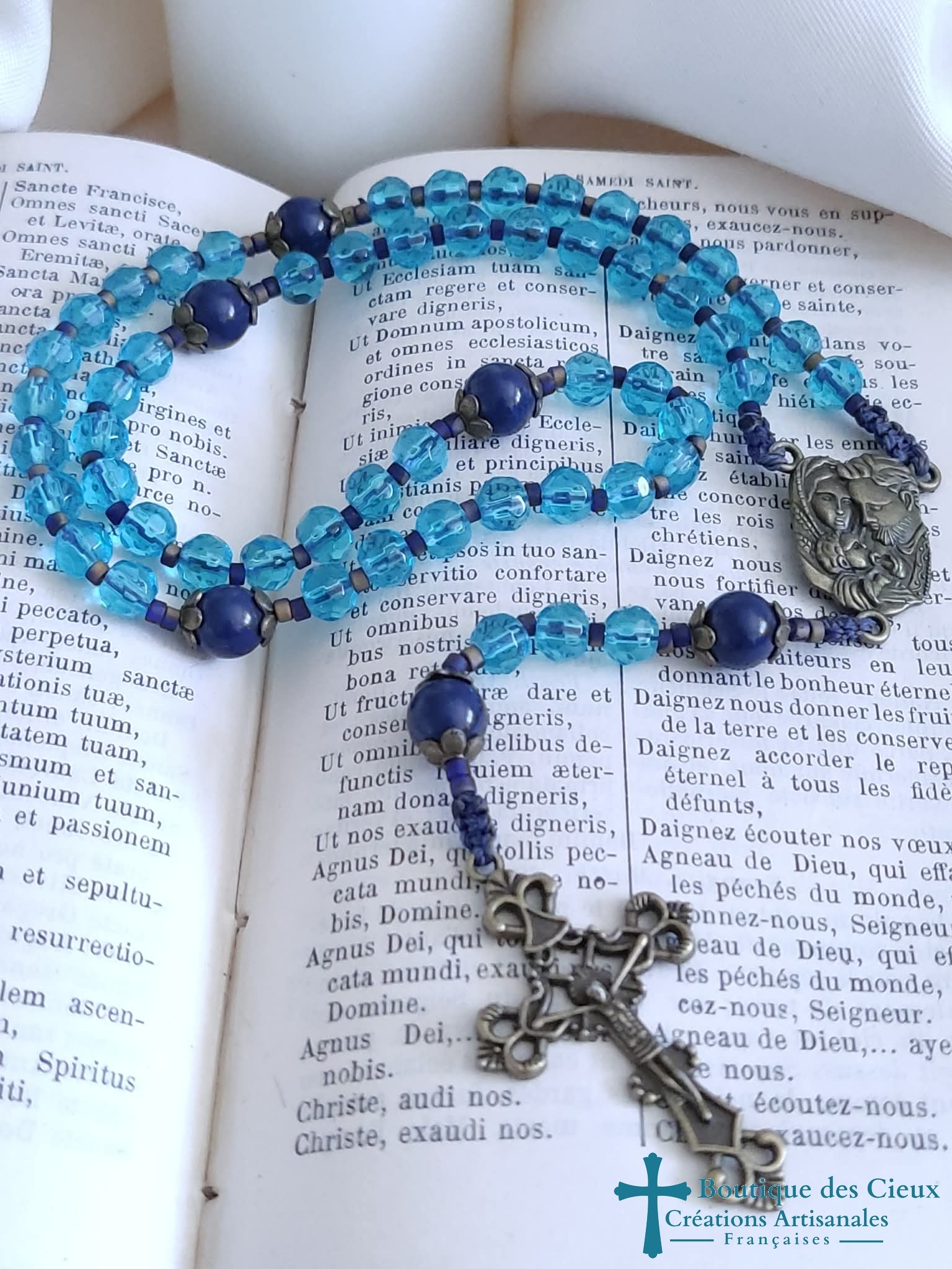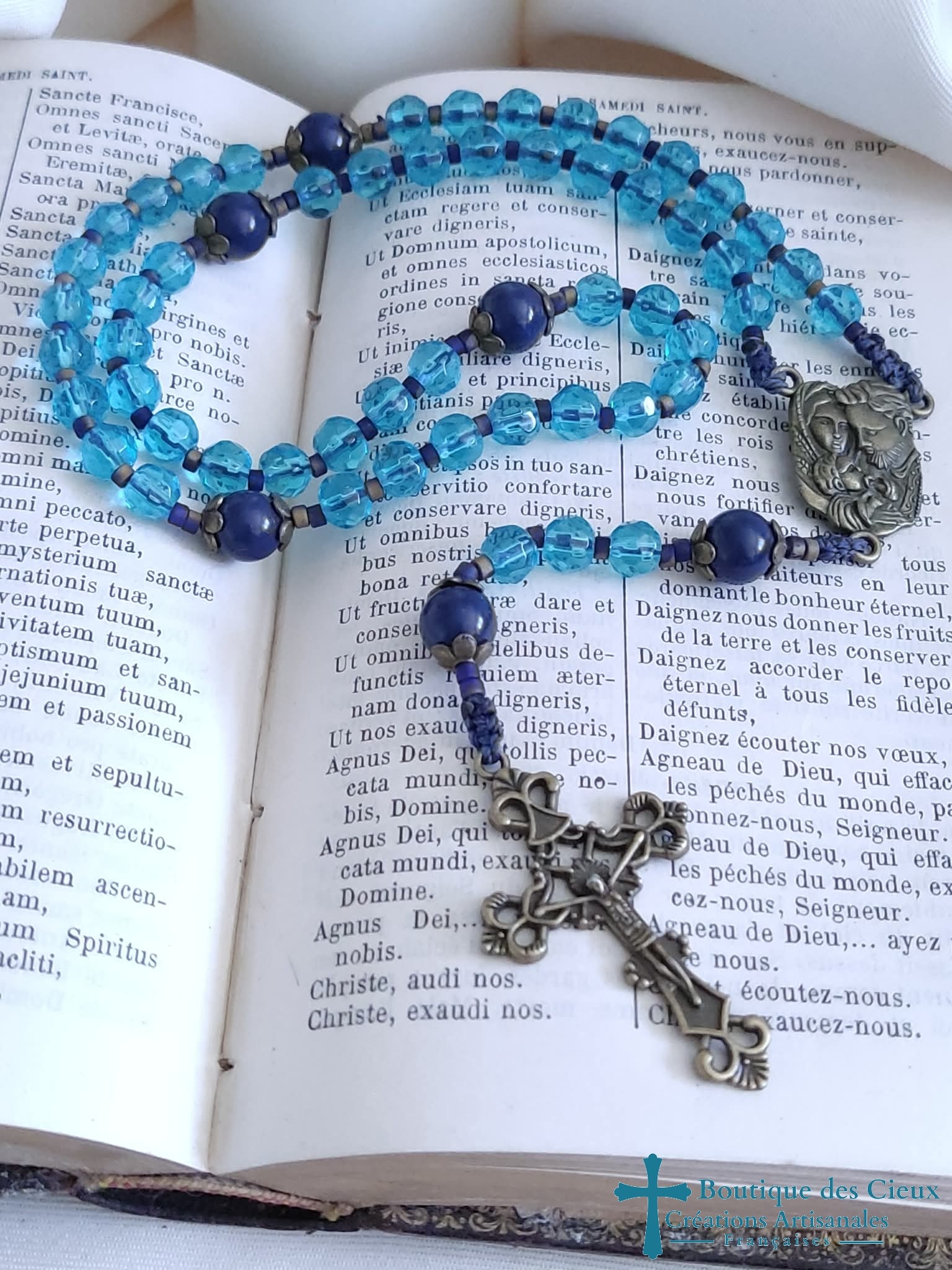 Chapelet pour femme composé de perles en verre bleu avec centre de rosaitre Sainte Famille en métal bronze.Les grains des dizaines sont facilement discernables grâce aux petites perles qui les séparent, ainsi qu' avec la différence de forme et taille avec les "Notre Père".