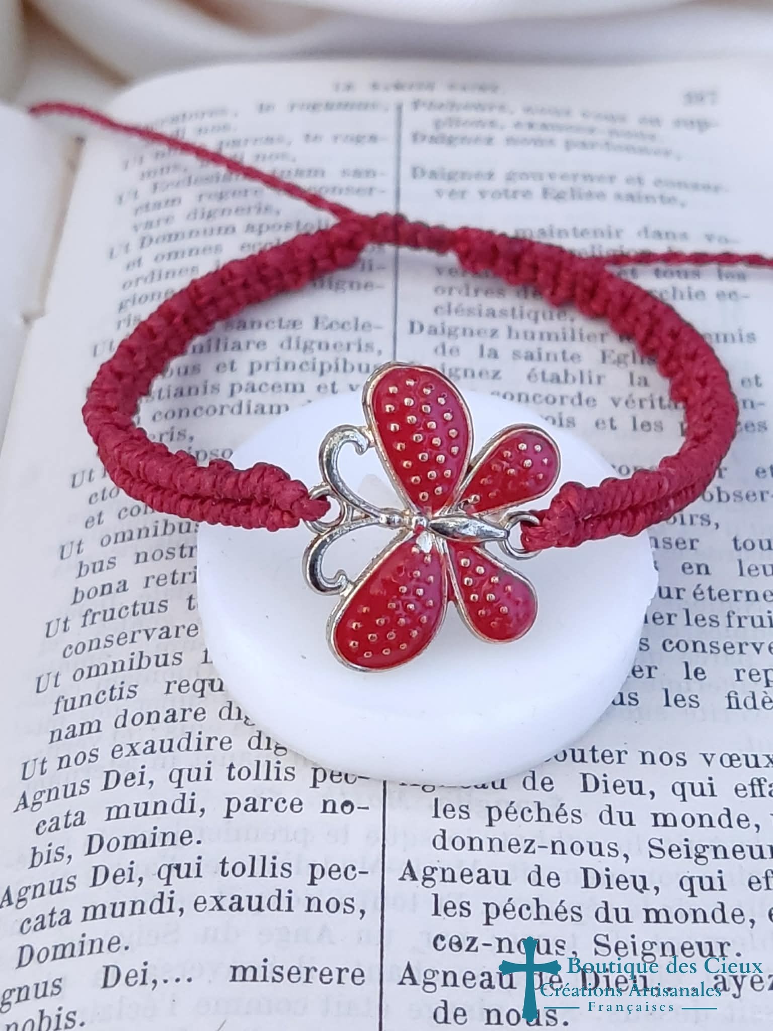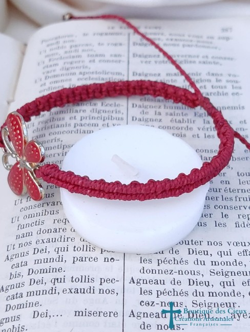 Exprimez votre transformation avec ce connecteur papillon rouge monté sur tissage en fil polyester rouge Ce bracelet sera béni par un prêtre. |