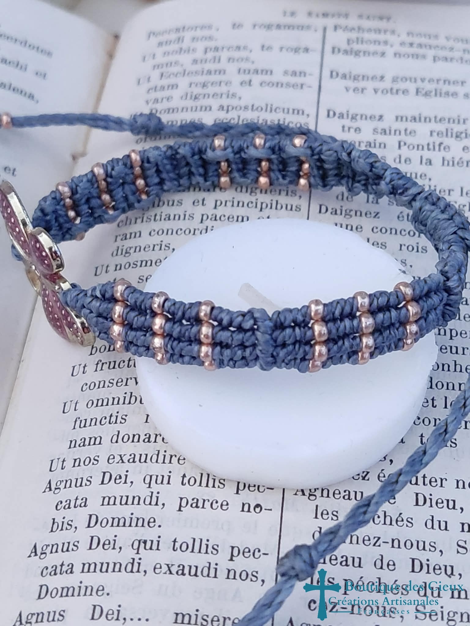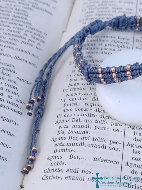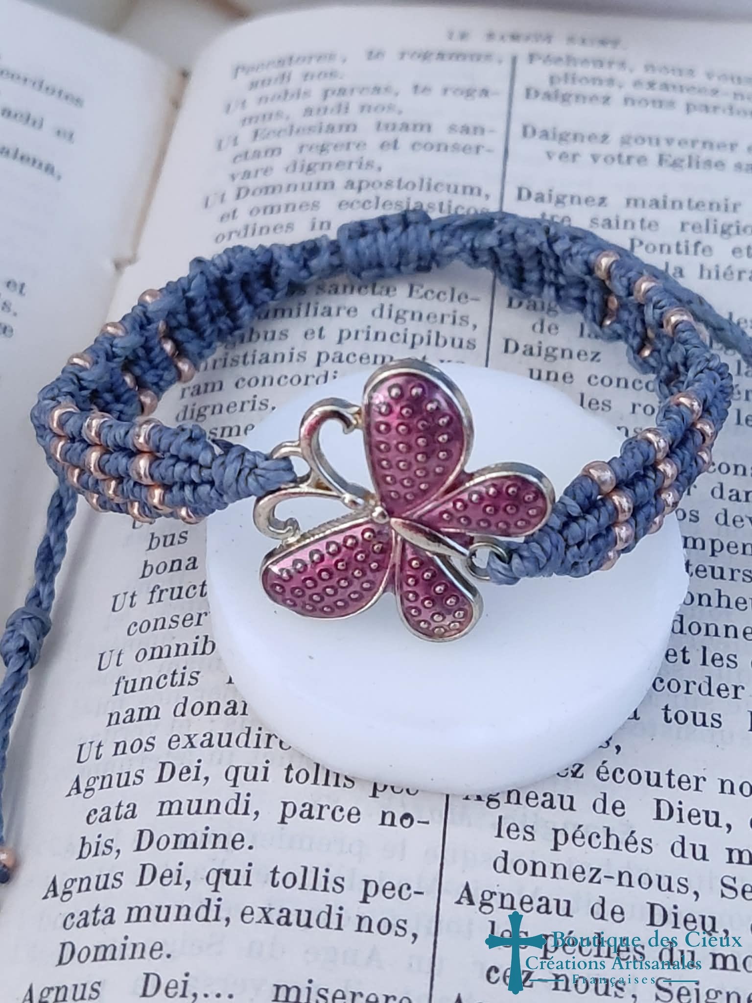 Bracelet symbolisant la transformation avec ce très beau connecteur papillon violet et tissage bleu et perles de rocailles dorées Ce bijou sera béni par un prêtre. |