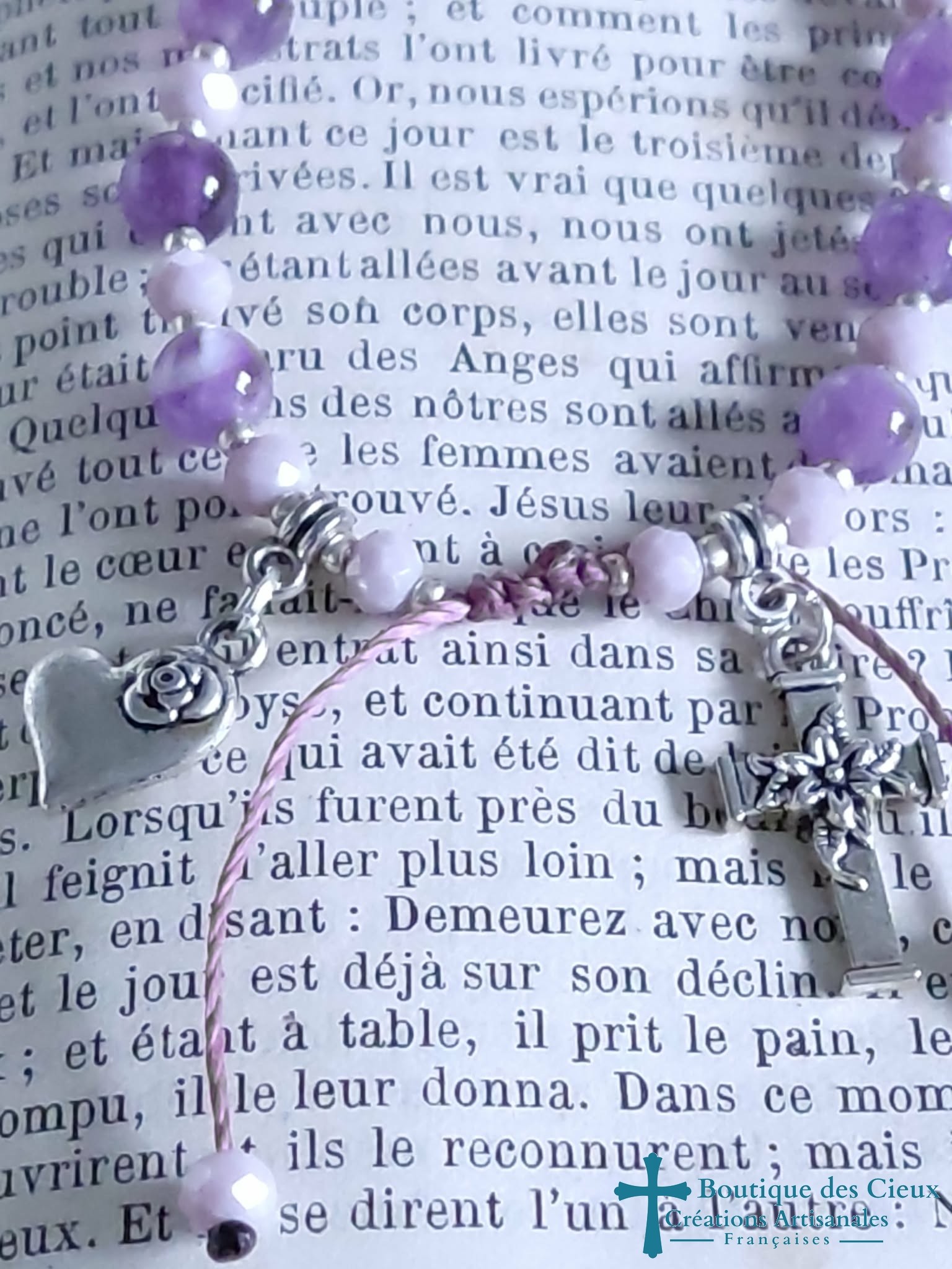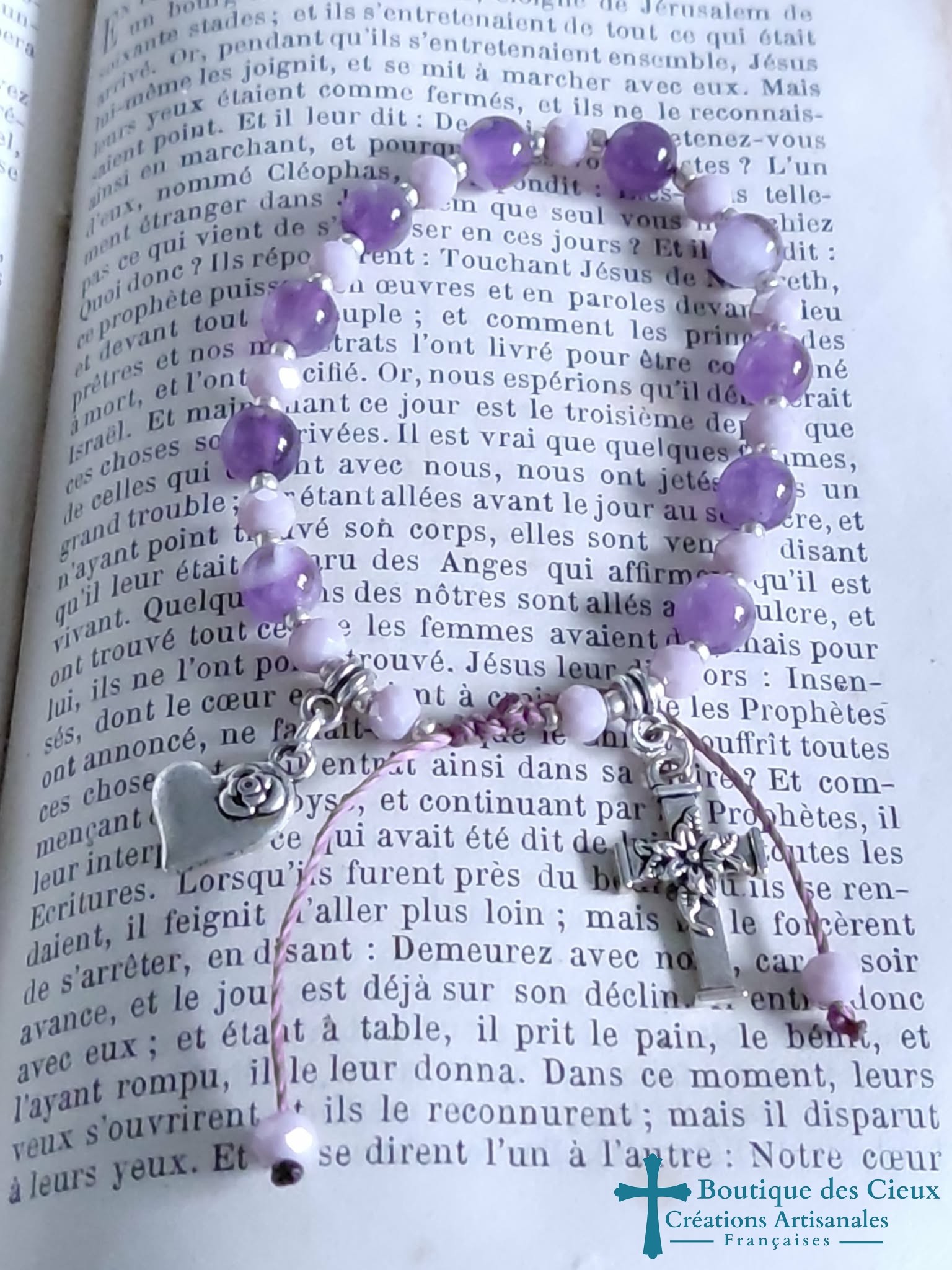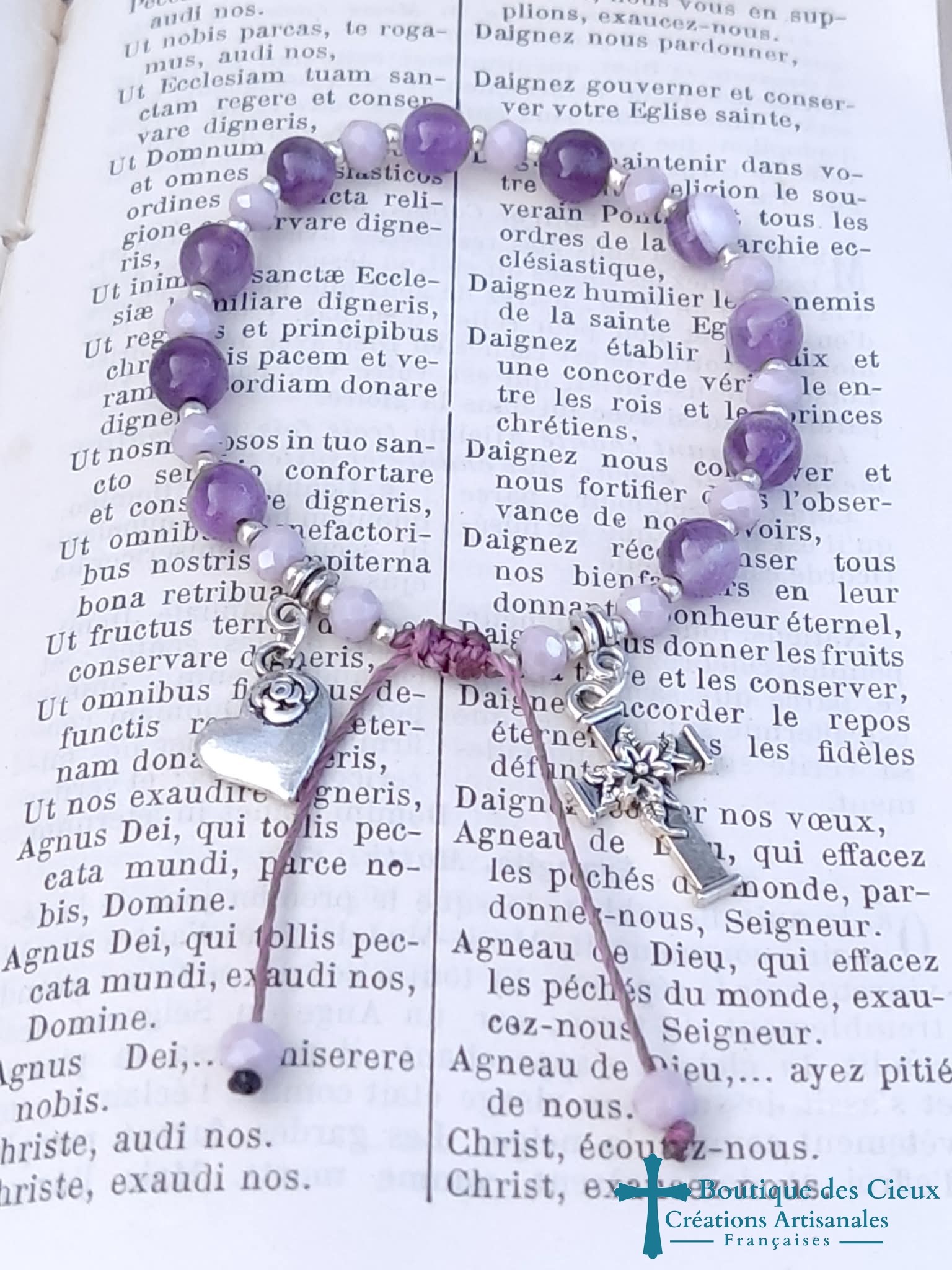 Bracelet dizainier pour femmes composé d'améthyste (pierre d'équilibre) et de perles en verre facetté parme.Véritable bijou, ce dizainier a été créé pour avoir l'apparence d'un bracelet ordinaire tout en respectant les étapes de la prière, avec ces 10 grains facilement discernables et ses breloques marquant le début de la méditation.Entièrement montés à la main sur du fil polyester (solidité et souplesse), il s'adapte aux poignets. |