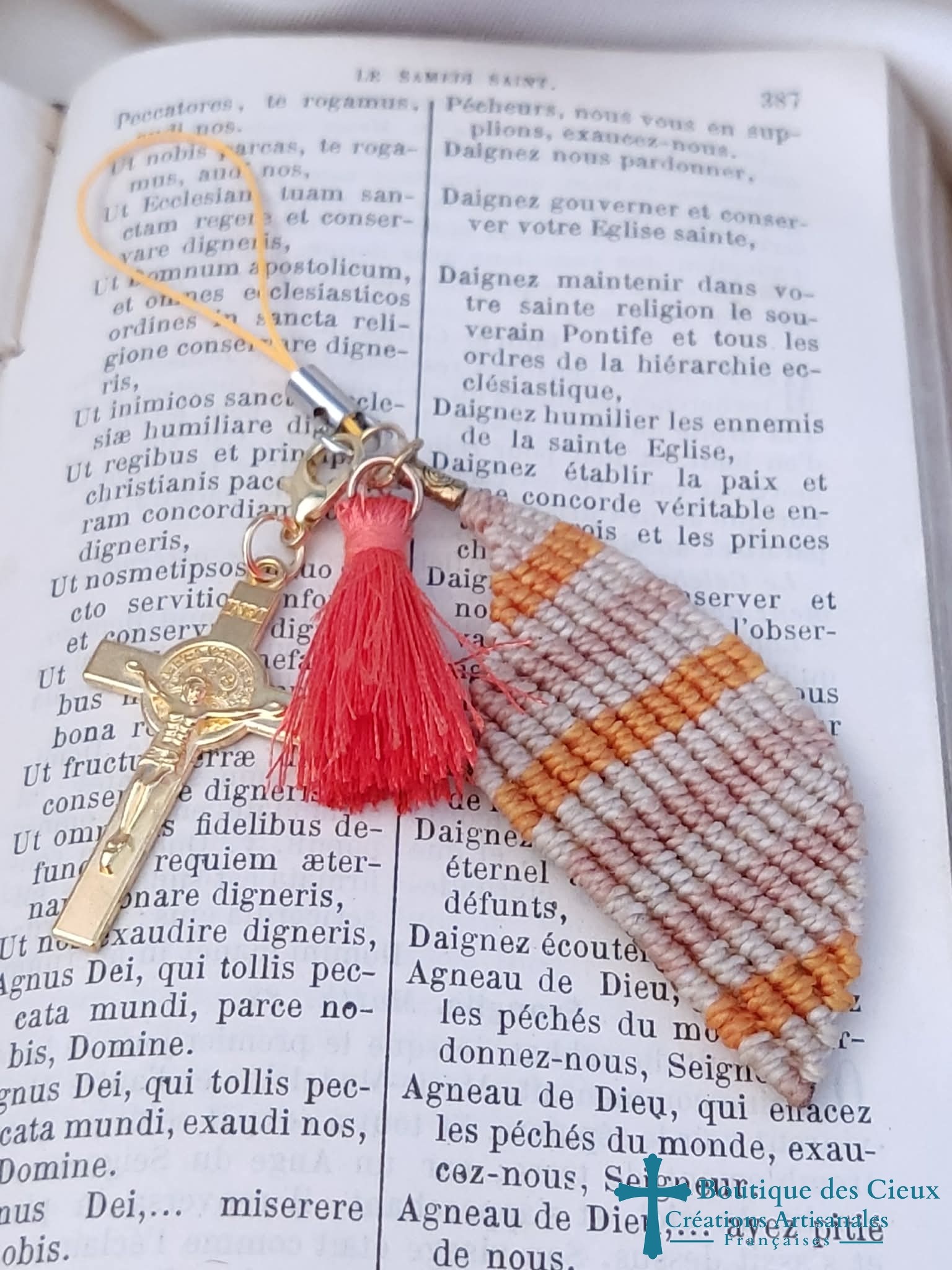 Bijoux pour téléphone ou clés usb : tissage forme aile, pompon orange et belle croix en métal doré Ce bijou sera béni par un prêtre. |
