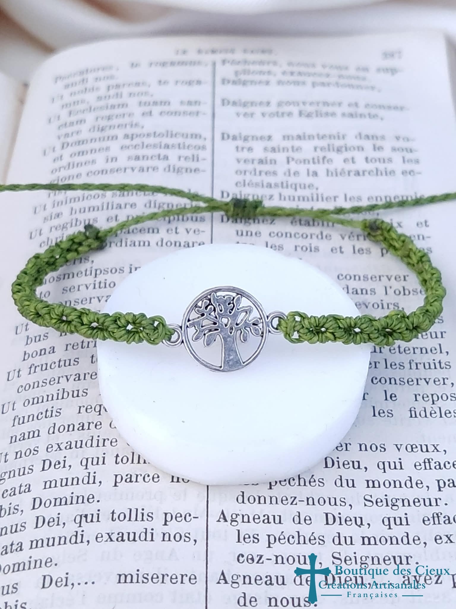 Bracelet petit connecteur arbre de vie argenté sur tissage en macramé vert olive. Ce bijou sera béni par un prêtre. |