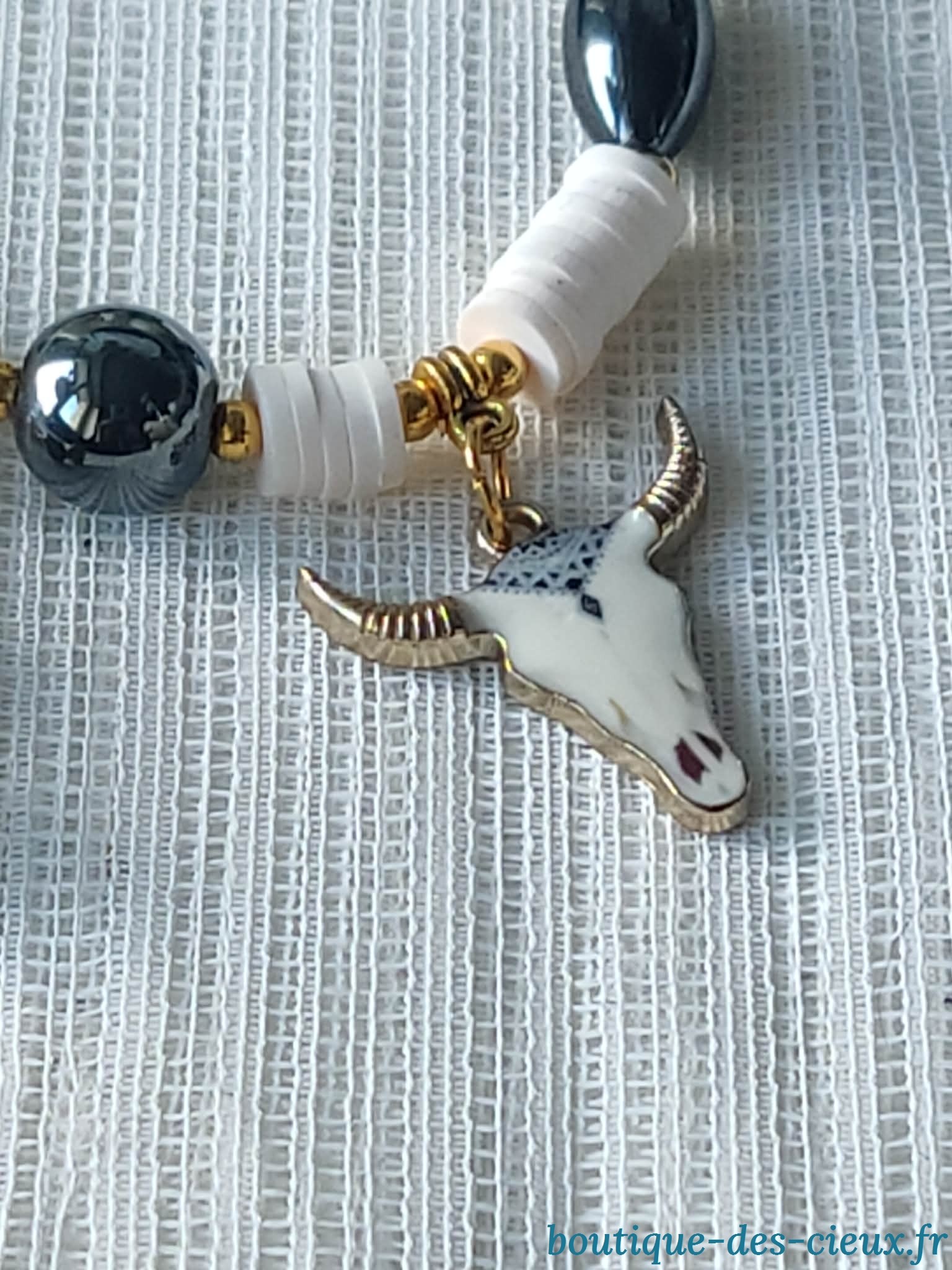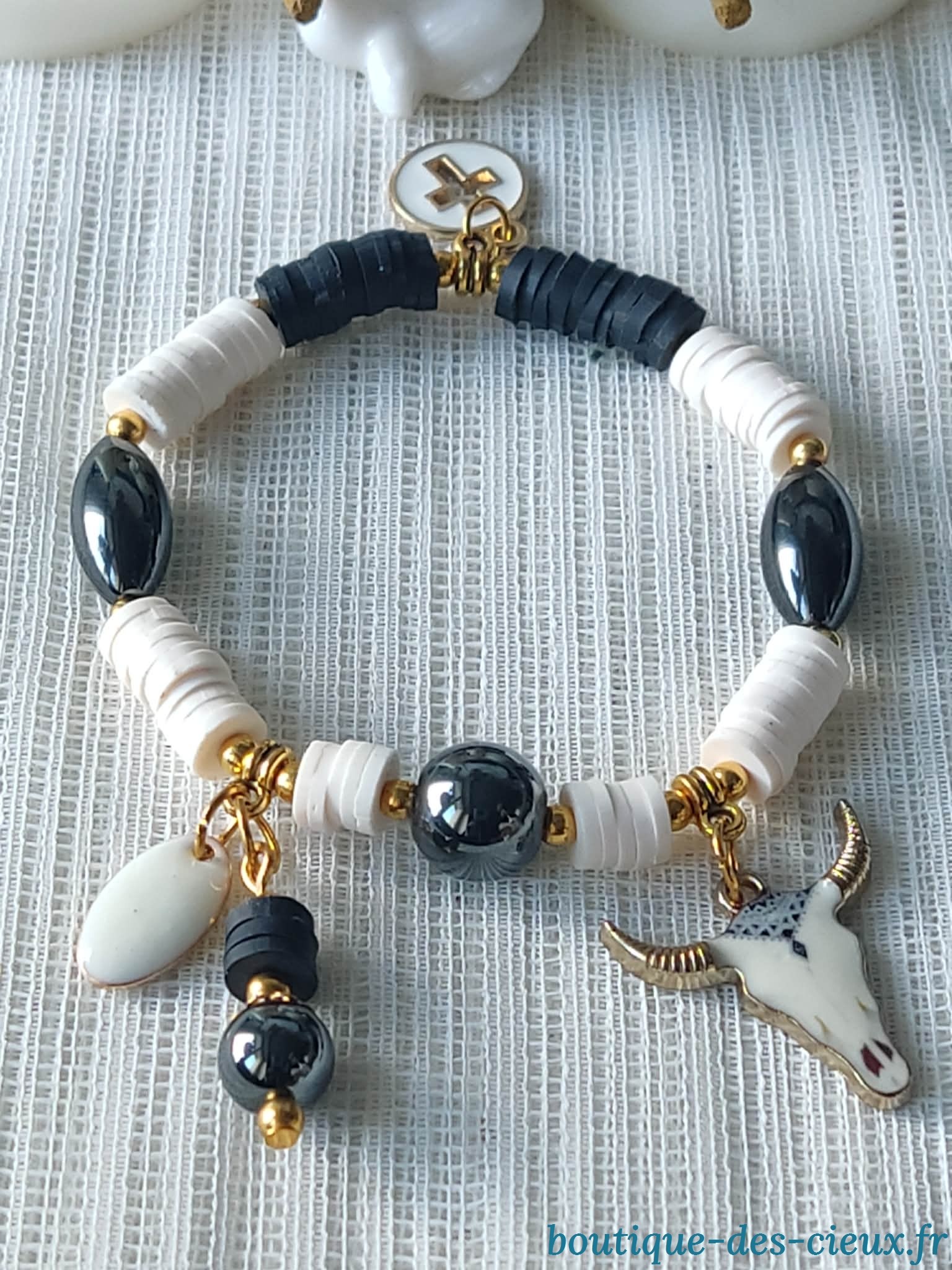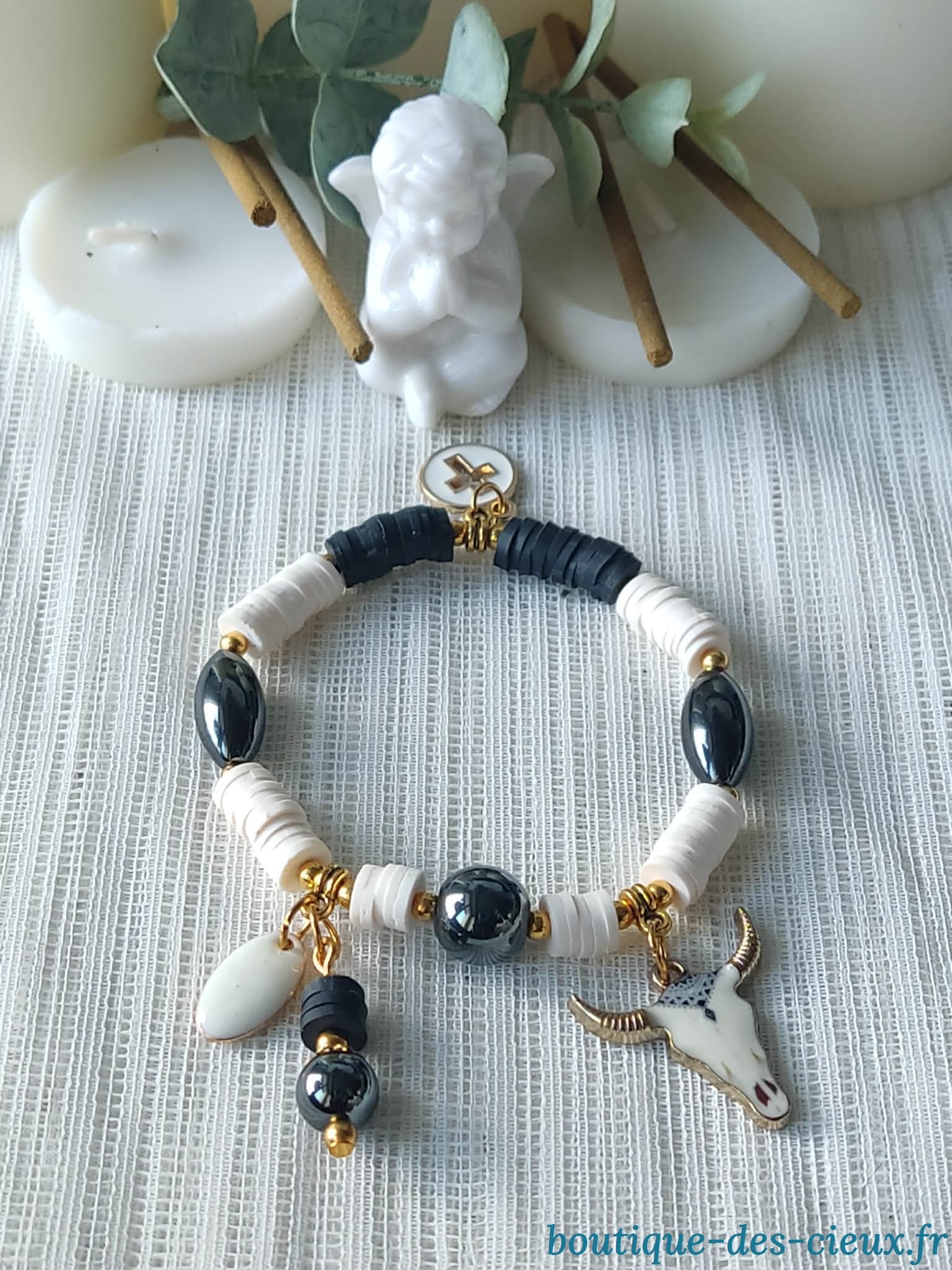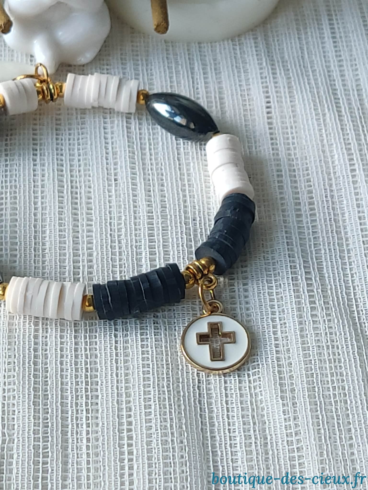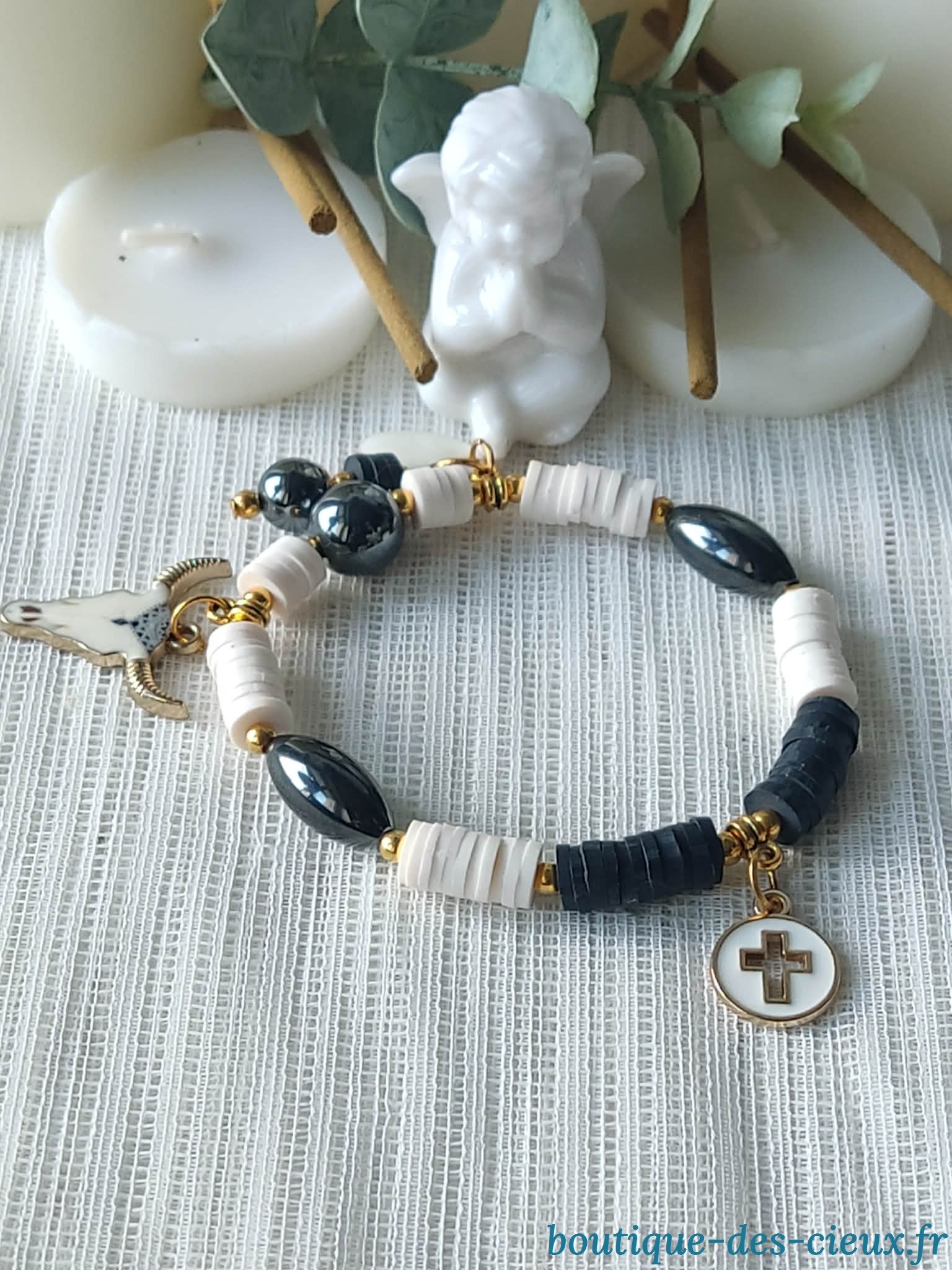 Bracelet pour femme a évocation religieuse avec sa médaille croix. Tendance il est composé de perles heishis synthétiques, d'un pendentif tête de buffle et diverses breloques. Ce bijou bien que n'étant pas conçu pour la prière sera béni |