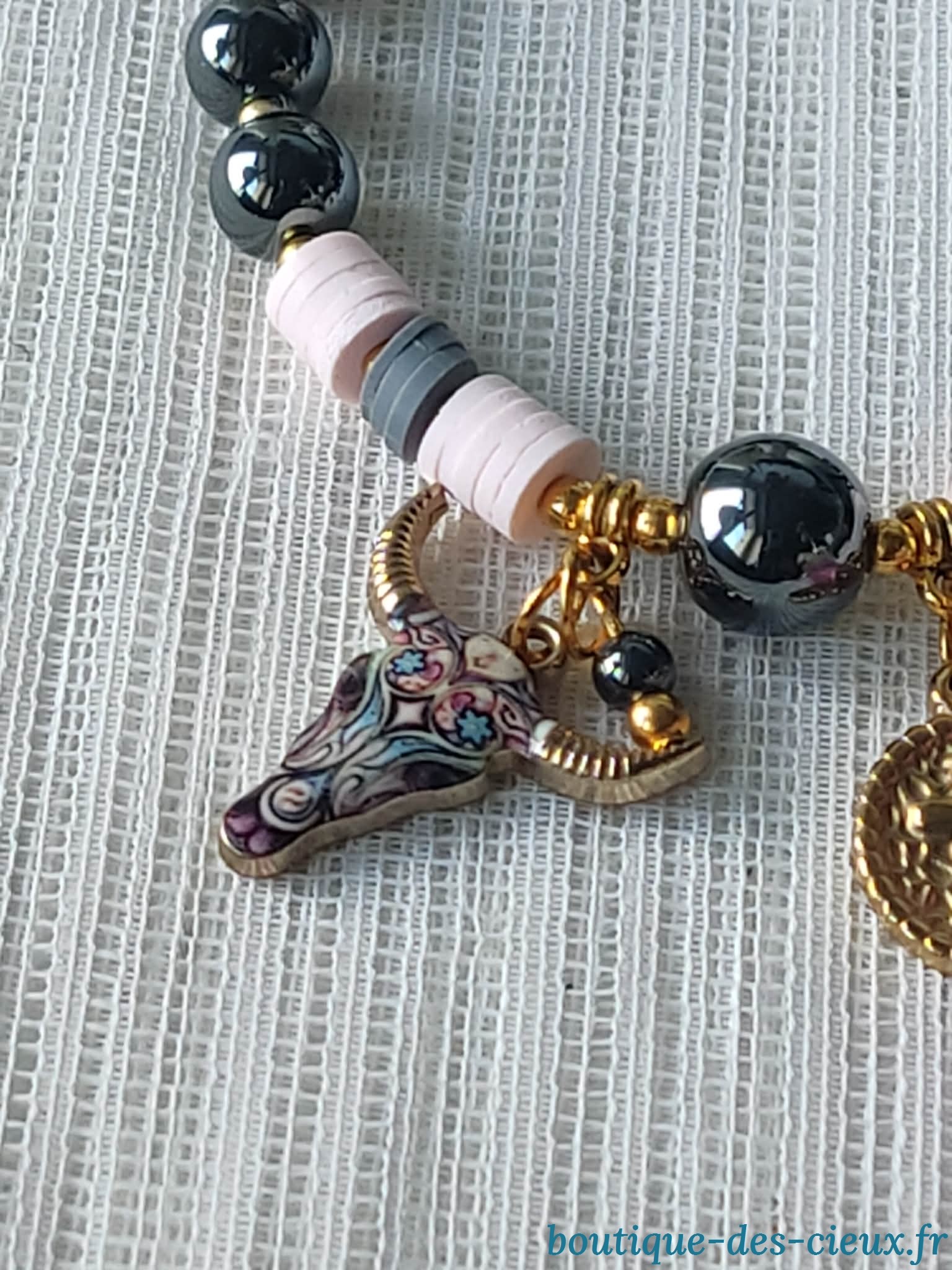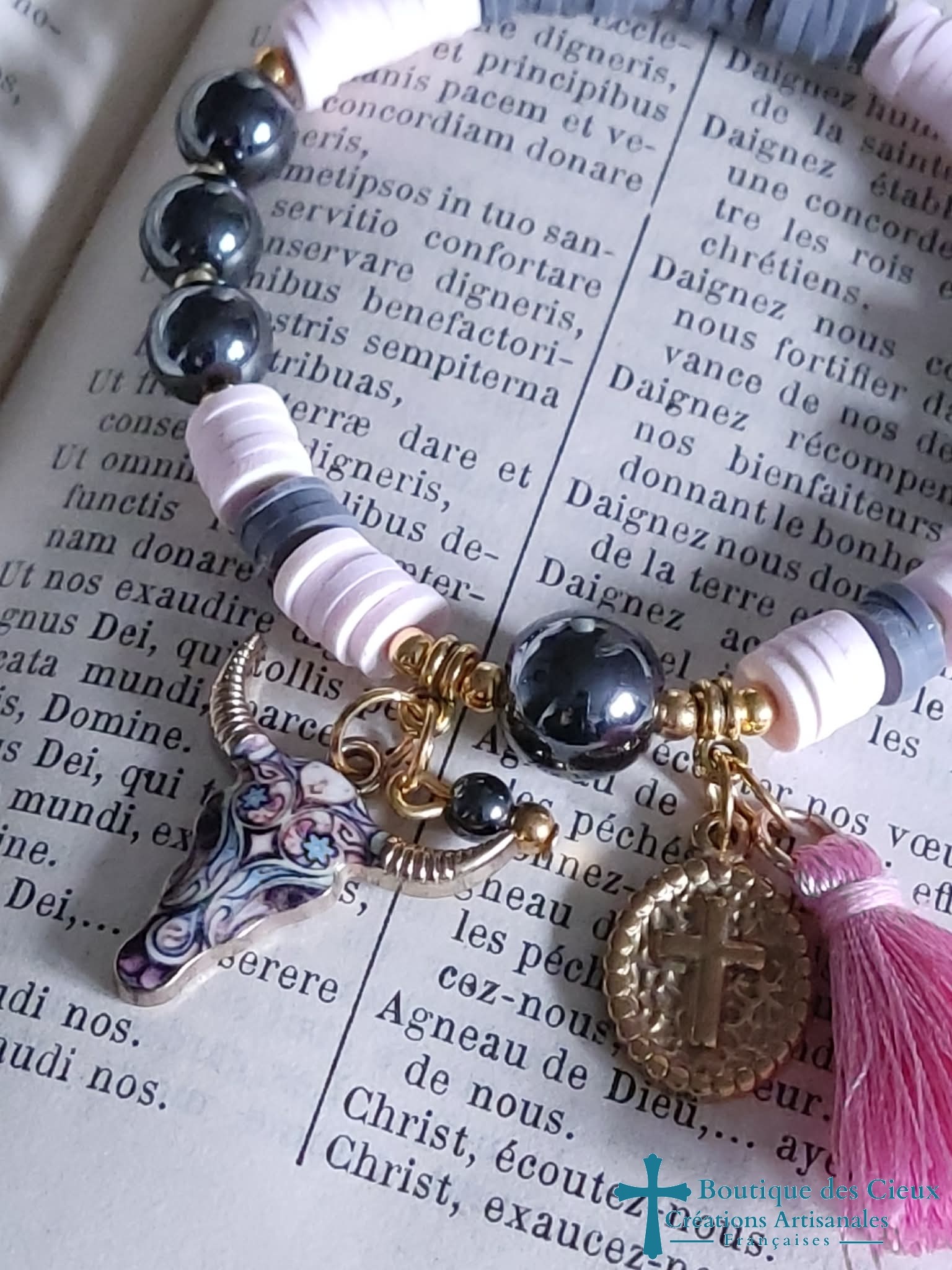 Bracelet pour femme composé de perles heishis synthétiques gris et rose , pendentif tête de buffle, diverses breloques et pendentifs religieux. Ces bijoux ont été créés pour être modernes et à tendances.Ces bijoux bien que n'étant pas conçus pour la prière seront bénis |
