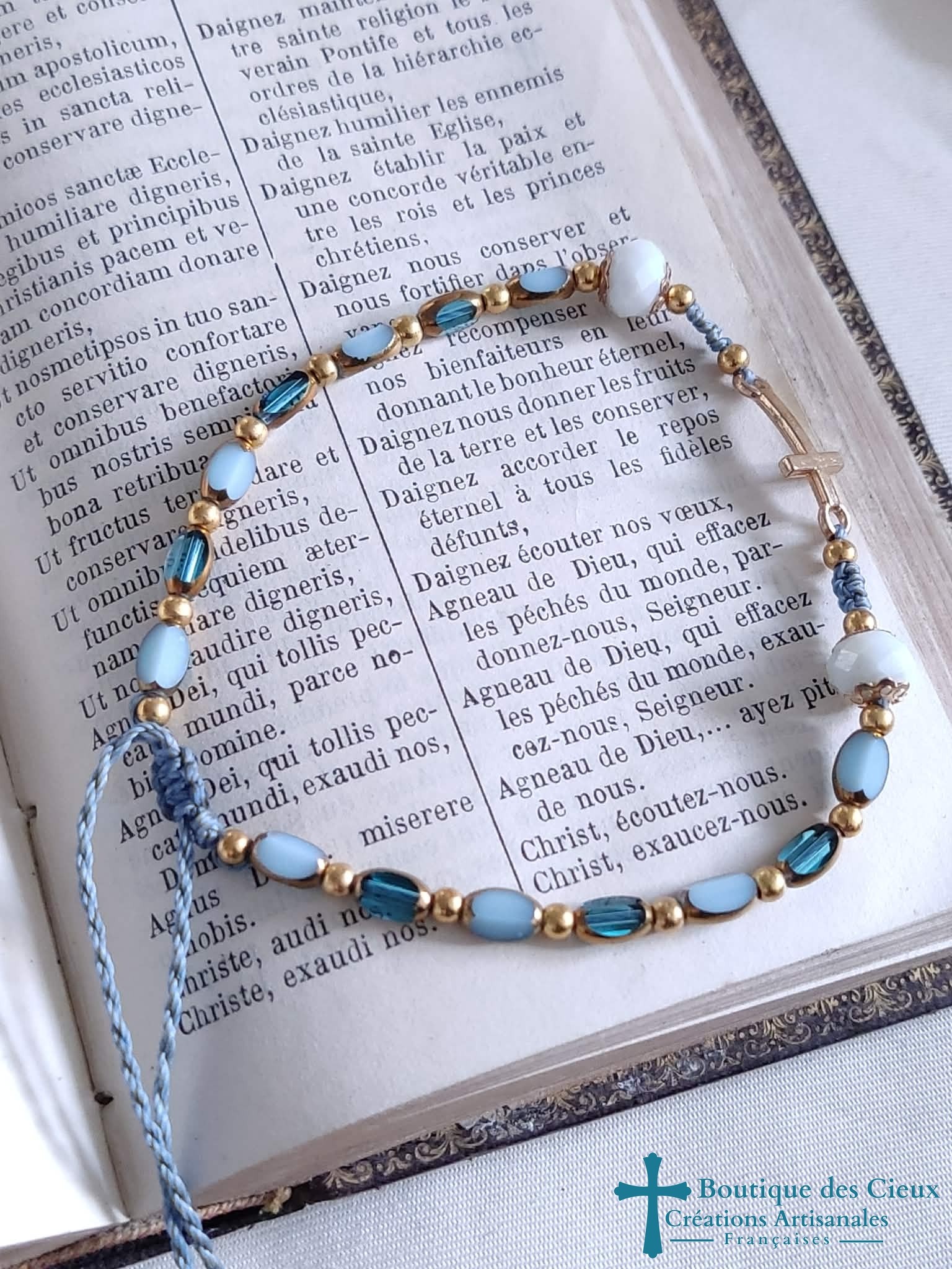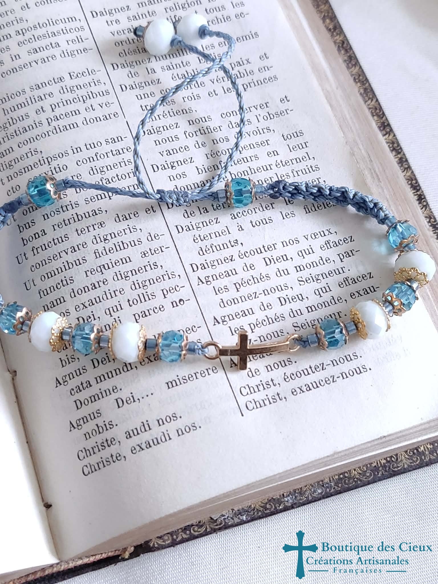 Superbe bracelet brillant avec connecteur croix doré en acier inoxydable et perles en verre montées sur fil en polyester. Ce bijou sera béni par un prêtre. |