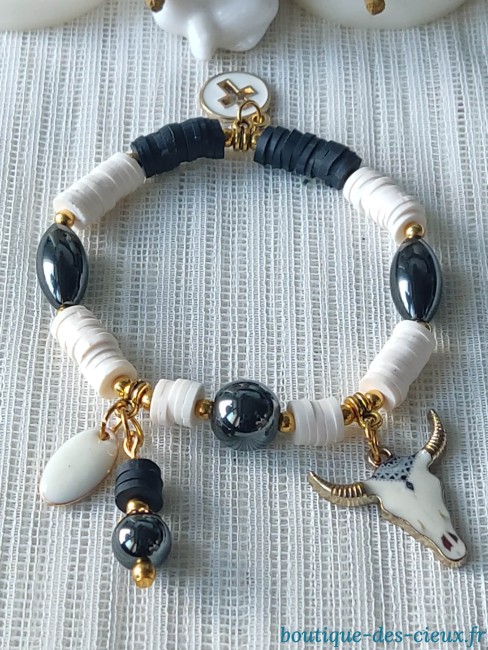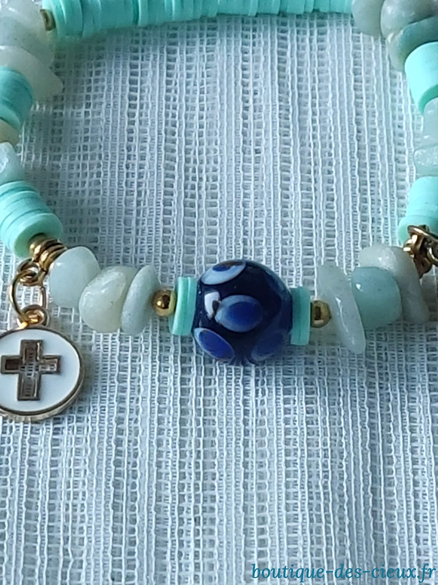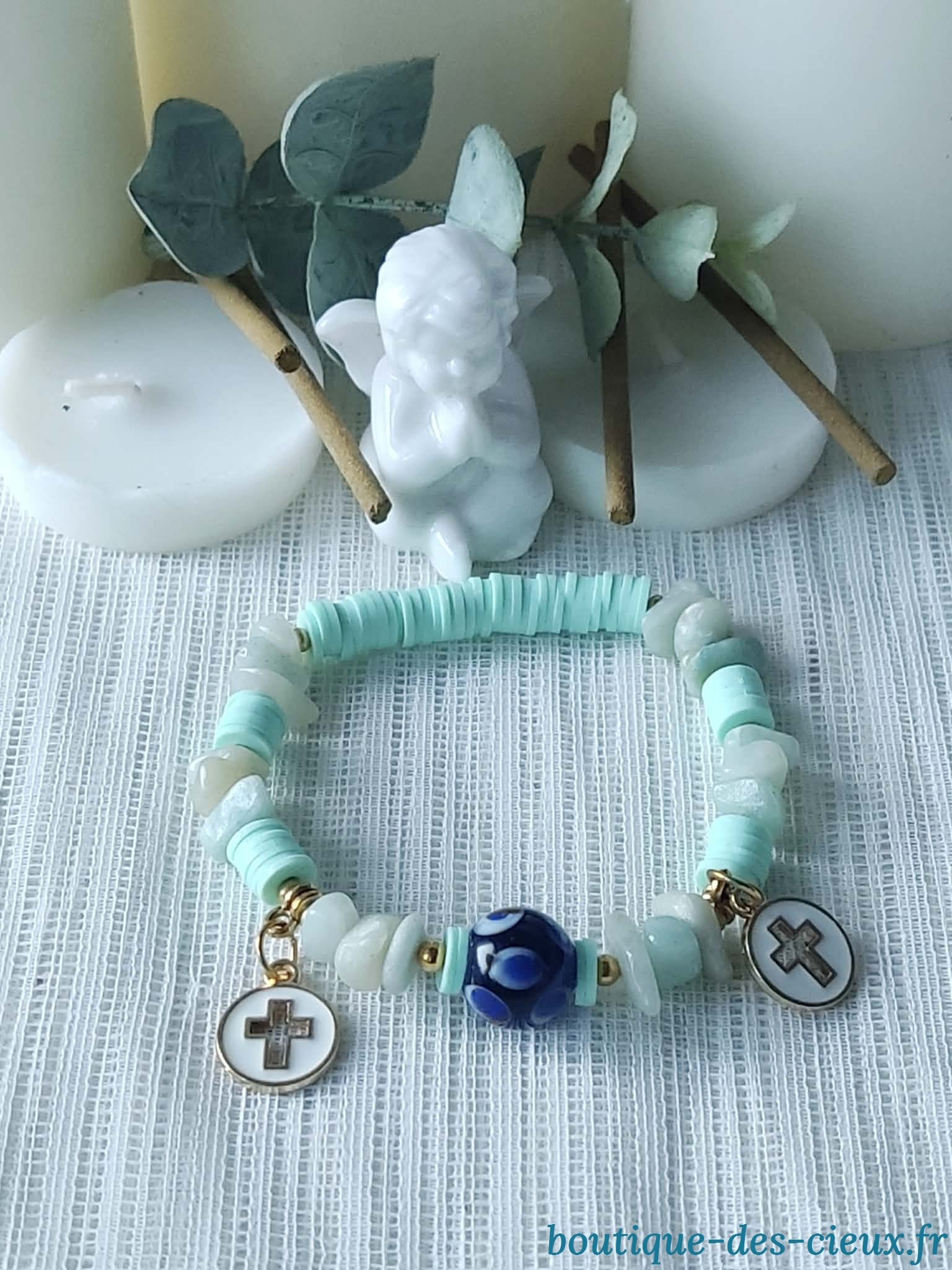 Bracelet chrétien pour femme en amazonite, perles heishi synthétiques vert tendre, d' une superbe perle en porcelaine et jolies breloque croix en métal émaillé. Bien que n'étant pas conçu pour la prière, ce bracelet sera béni |