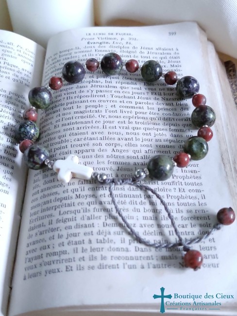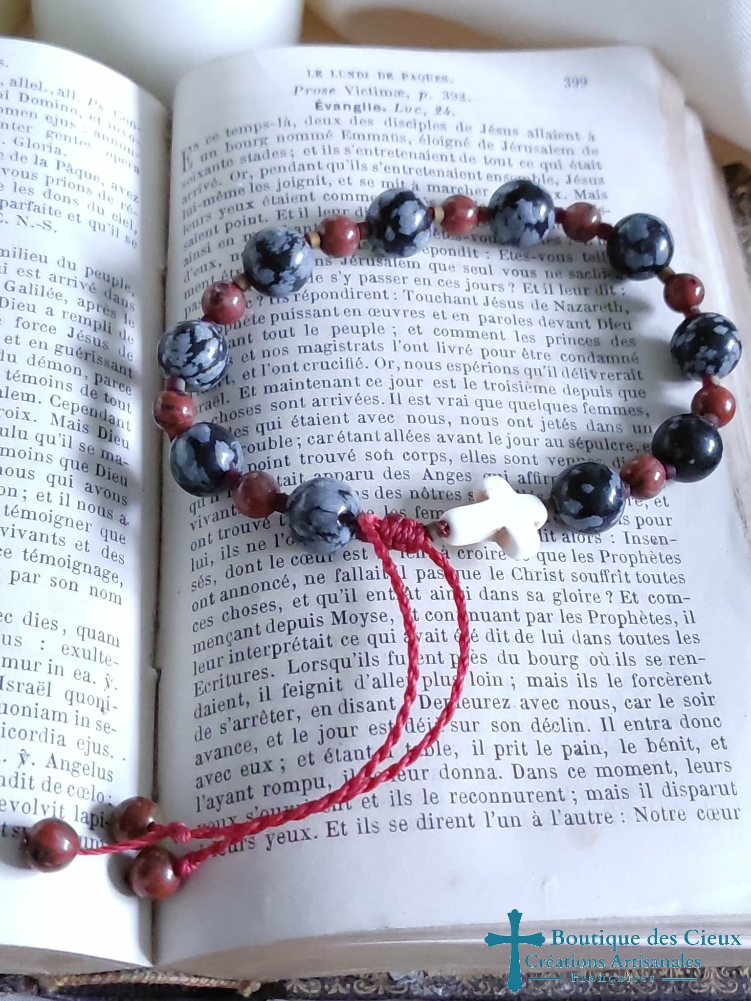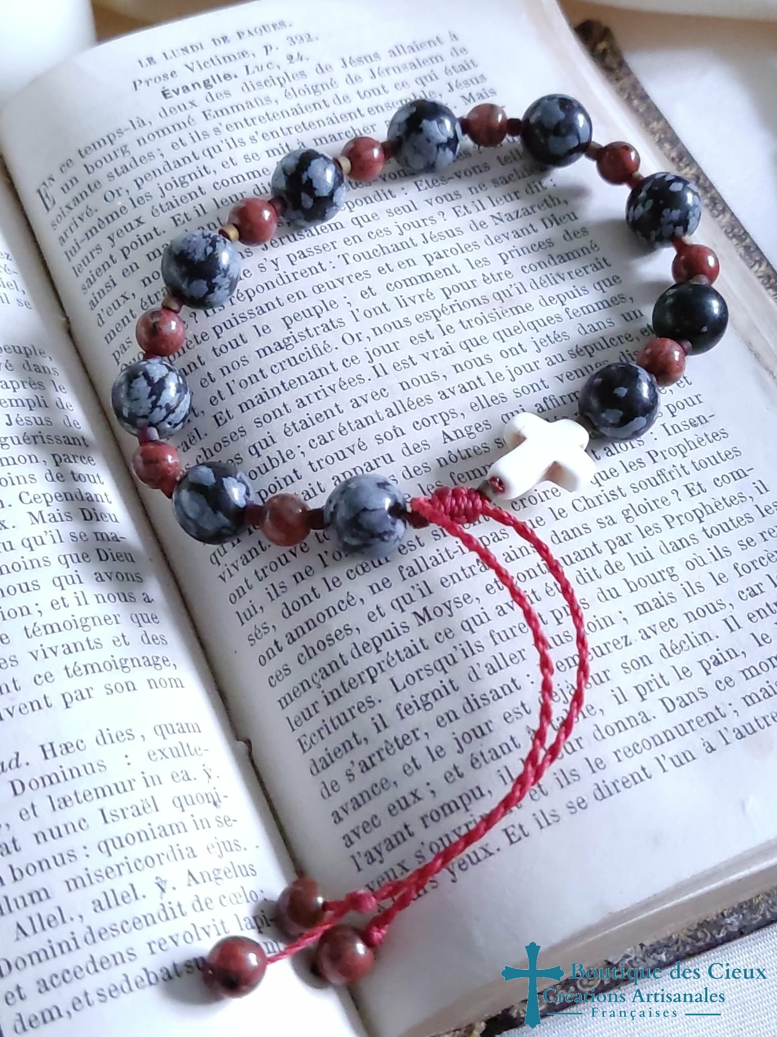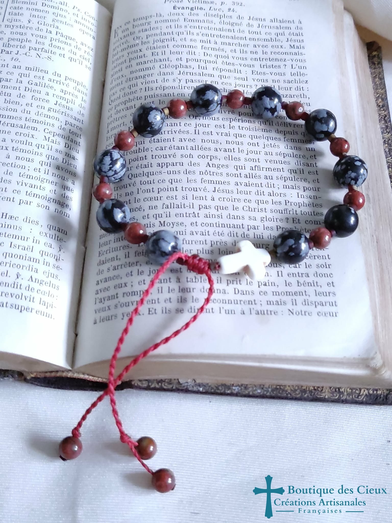 Bracelet dizainier pour homme composé d'obsidienne mouchetée (idéal pour la méditation) et jaspe rouge (renforce l'énergie vitale).Véritable bijou, ce dizainier à été créé pour avoir l'apparence d'un bracelet ordinaire tout en respectant les étapes de la prière. Les grains de prière sont facilement discernables grâce à la différence de taille des perles qui les séparent. La croix synthétique façon howlite marque le début et la fin de la méditation.Entièrement monté à la main sur du fil polyester à macramé, ce bijou est réglable grâce à son fermoir coulissant, est très solide. |