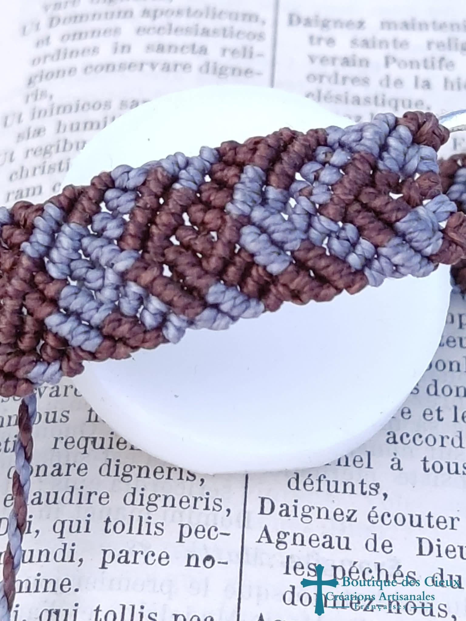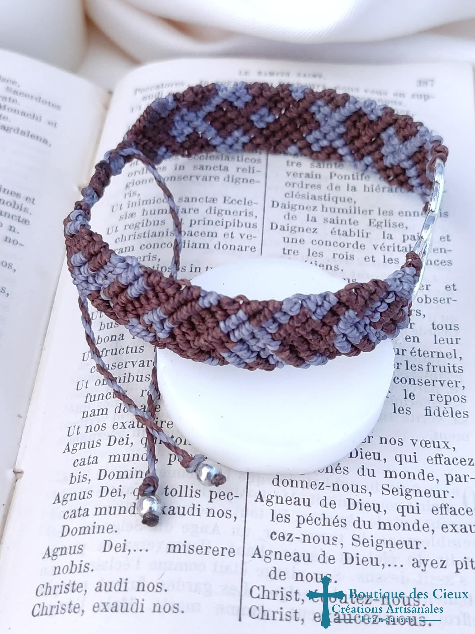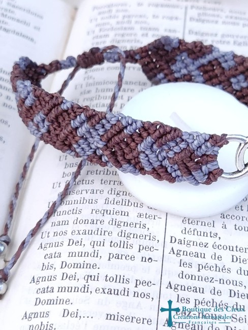 Bracelet connecteur double infini argenté sur tissage macramé marron et bleu gris. Ce bijou sera béni par un prêtre. |