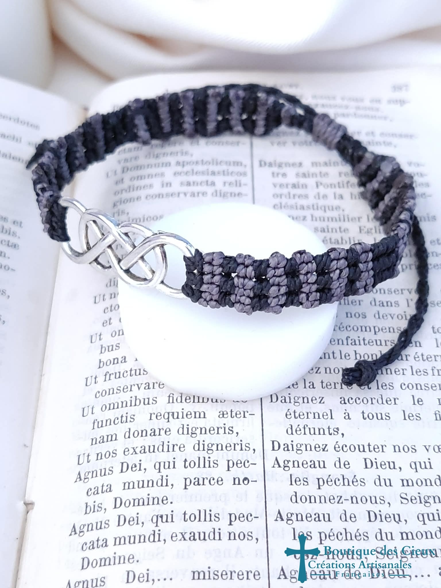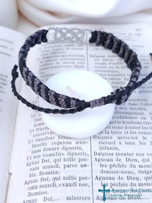 Bracelet pour homme connecteur double infini argenté sur tissage macramé noir et gris. Ce bijou sera béni par un prêtre. |