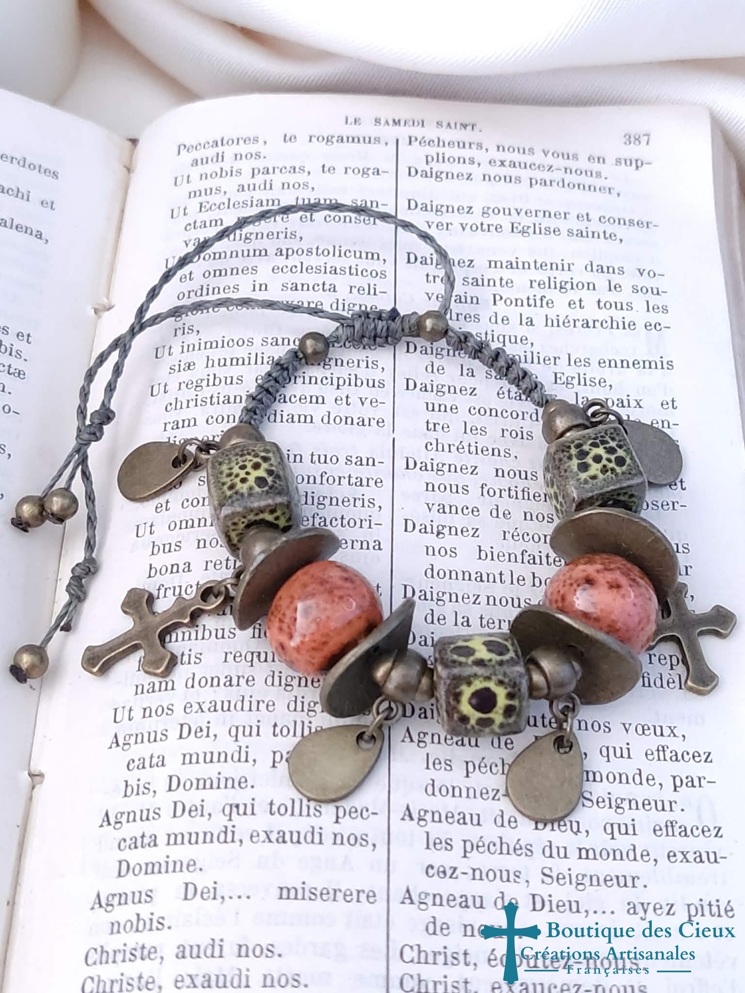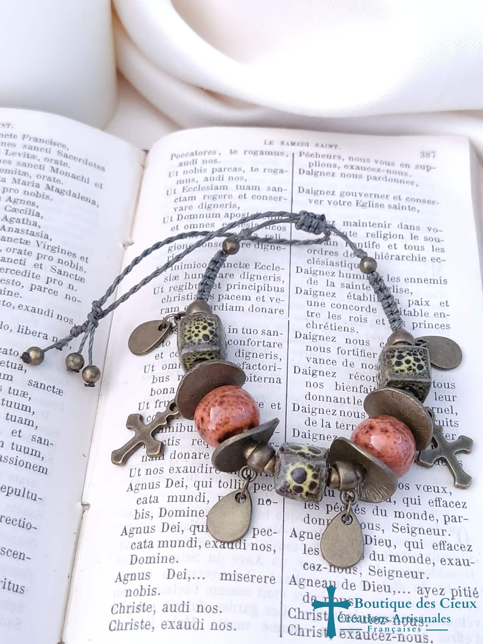 Bracelet pour femmes de style ethnique à symbole religieux avec ces breloques croix composé de perles en céramique et pièces en métal bronze.Entièrement montés à la main sur du fil polyester, ils s'adaptent à votre poignet grâce au fermoir coulissant et les cordons de rallongement.