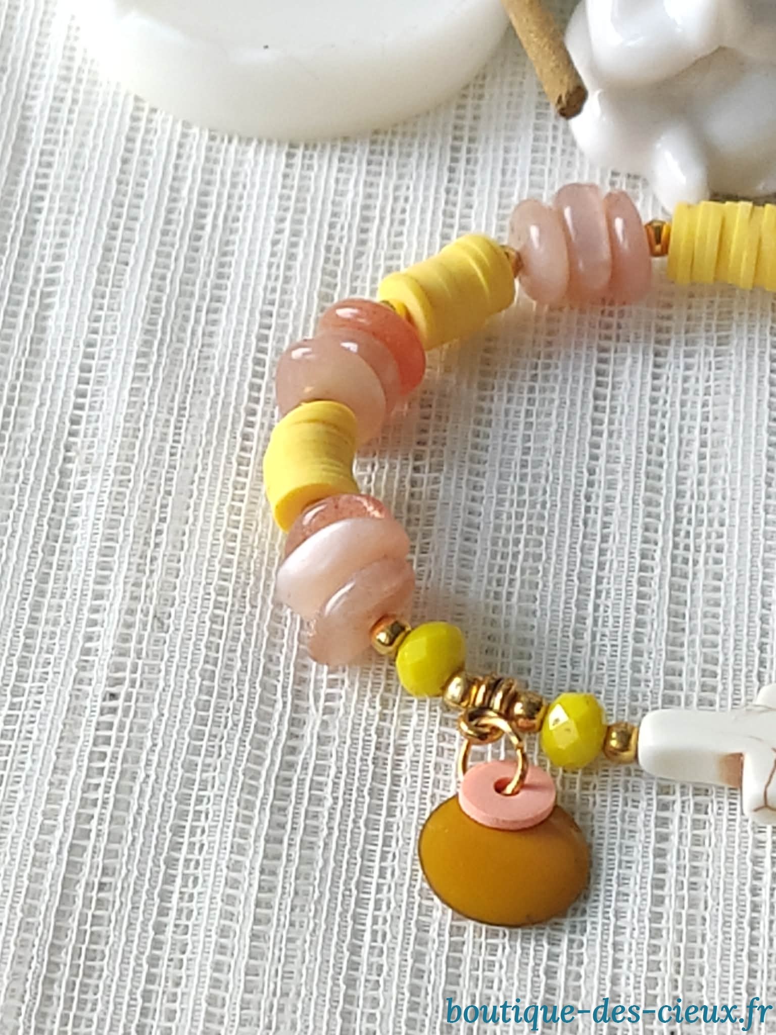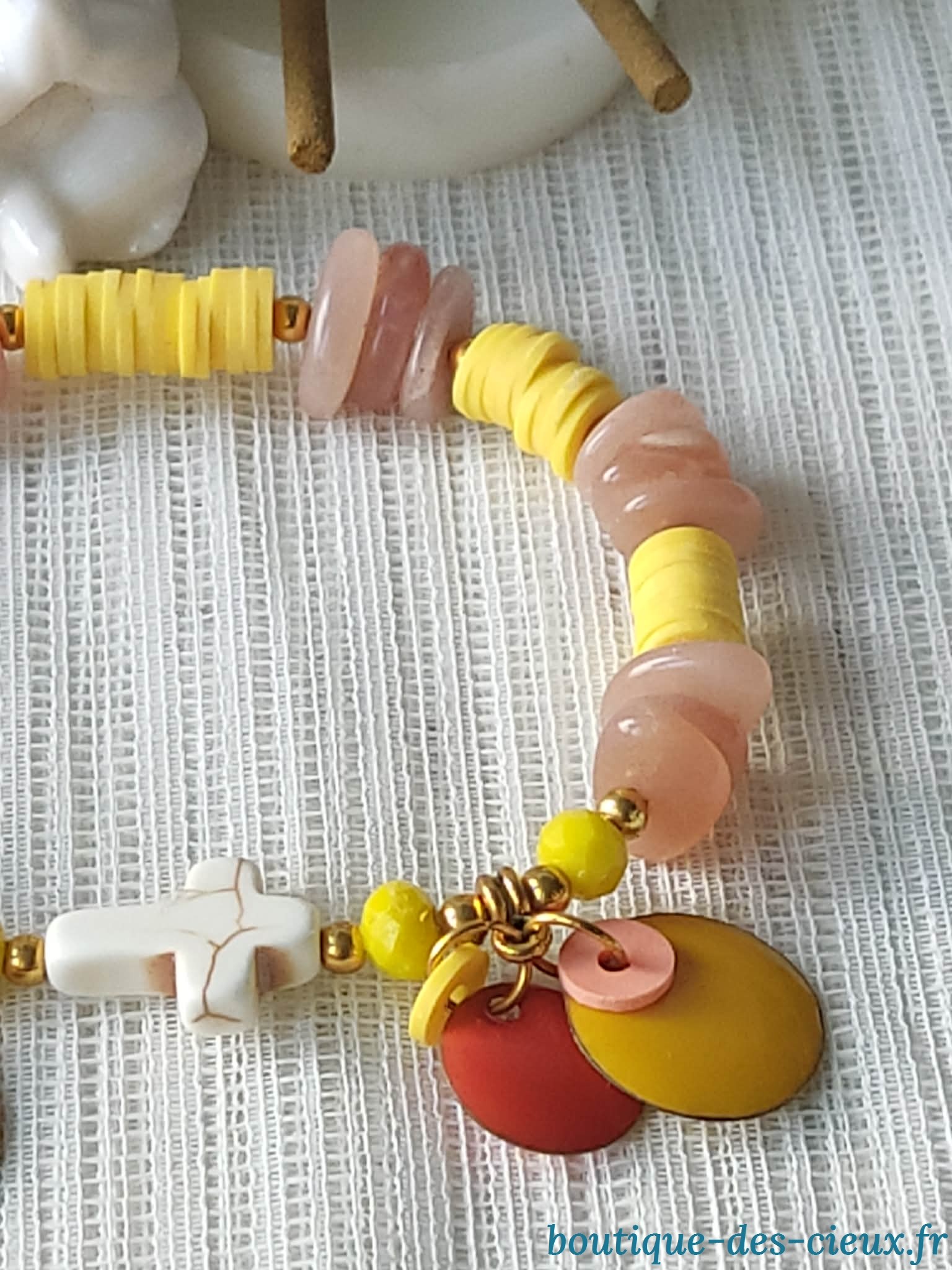 Bracelet estival pour femme composé de chip's de pierre du soleil, perles heishi synthétique, et jolie croix synthétique façon howlite. Véritable bijou pétillant et gorgé de soleilCe bijou bien que n'étant pas conçu pour la prière sera béni |