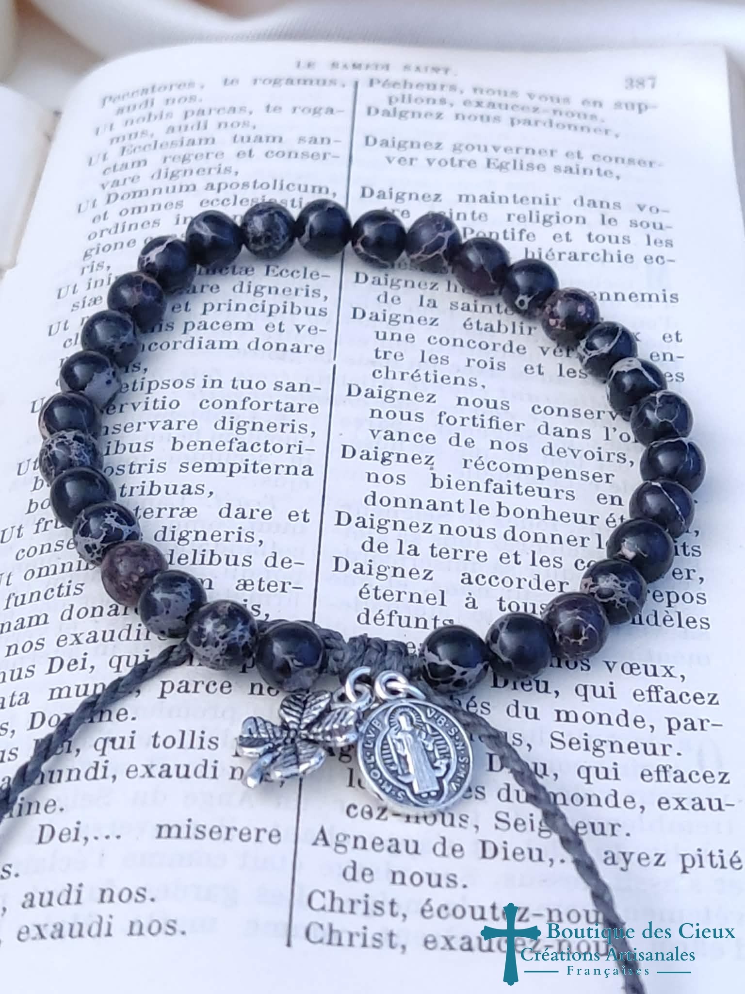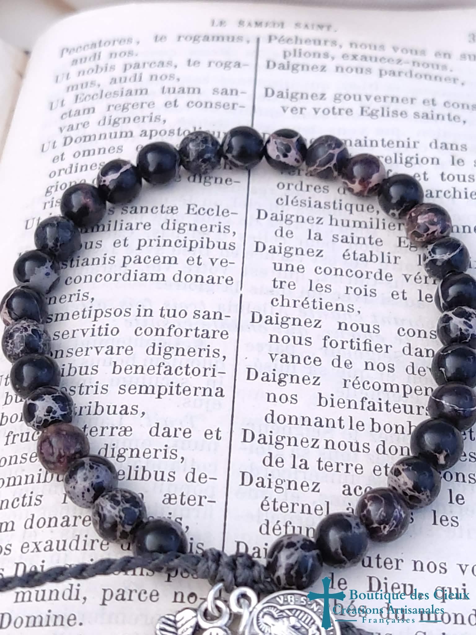 Bracelet pour hommes composé de perles de jaspe impérial teinté noir Breloque trèfle à 4 feuilles et Médaille Saint Benoît. Entièrement montés à la main sur du fil polyester, il est réglable grâce à son fermoir coulissant. |