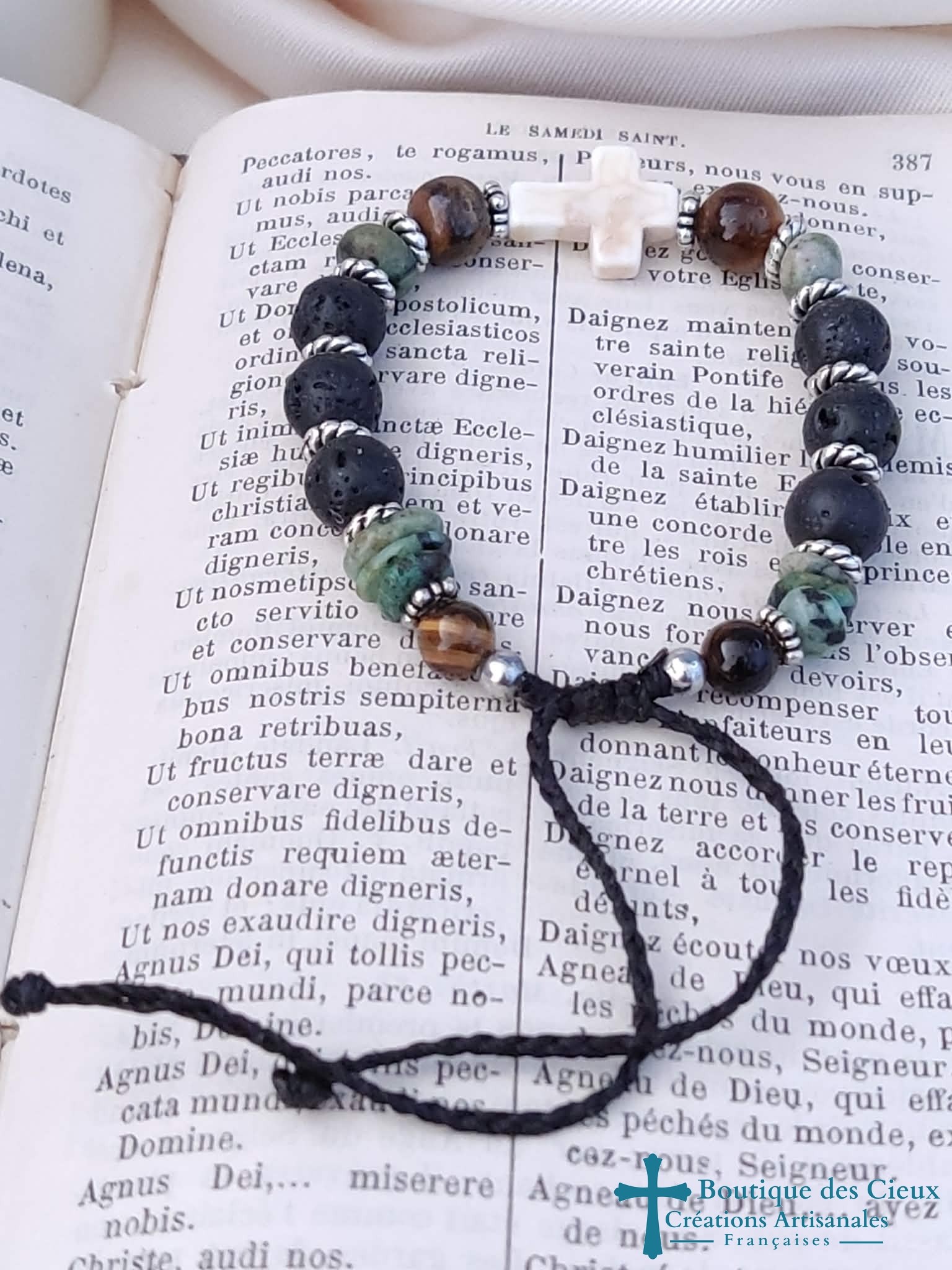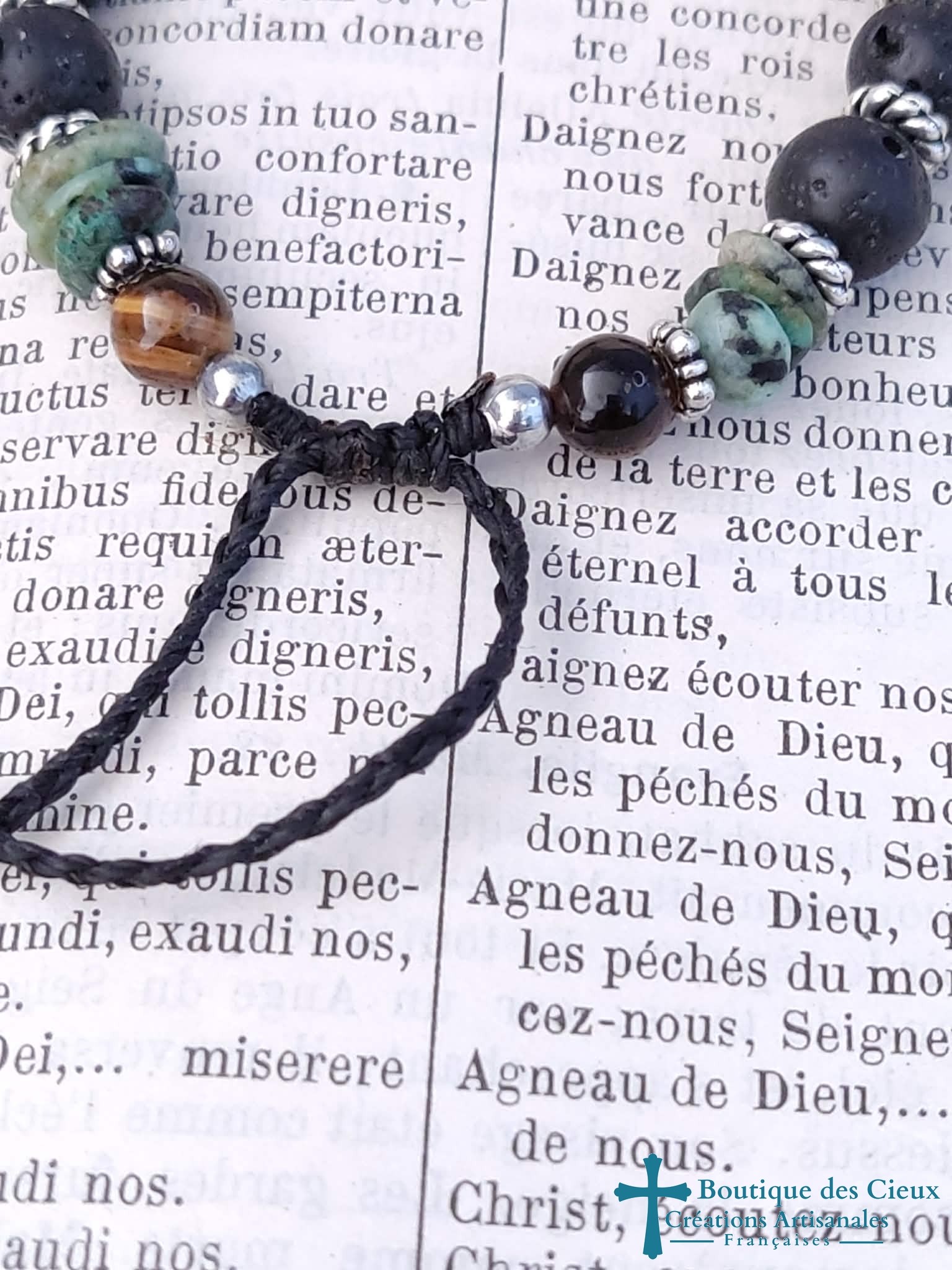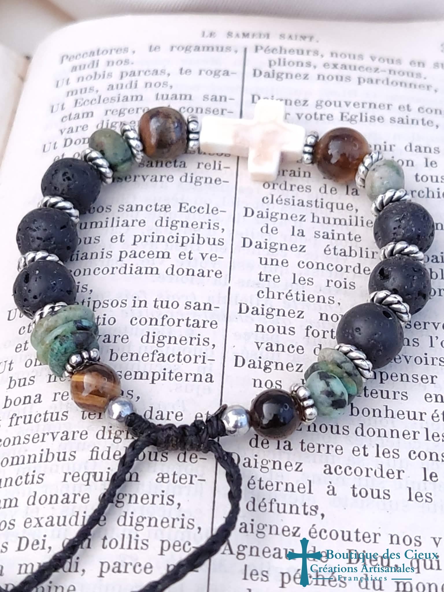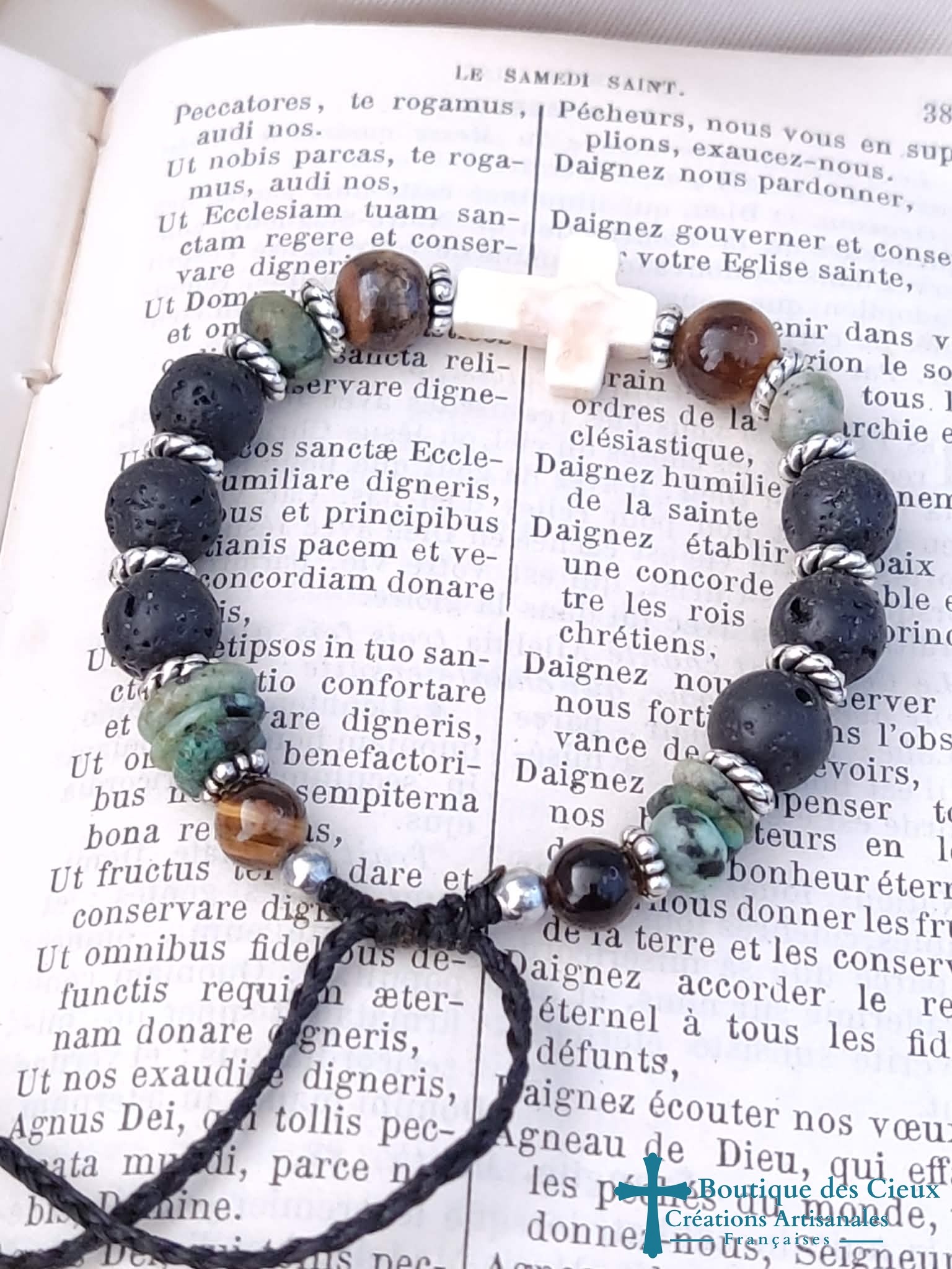 Bracelet pour hommes composé de pierre de lave, turquoise et oeil de tigre. Croix synthétique façon howlite. Entièrement montés à la main sur du fil polyester, il est réglable grâce à son fermoir coulissant. |