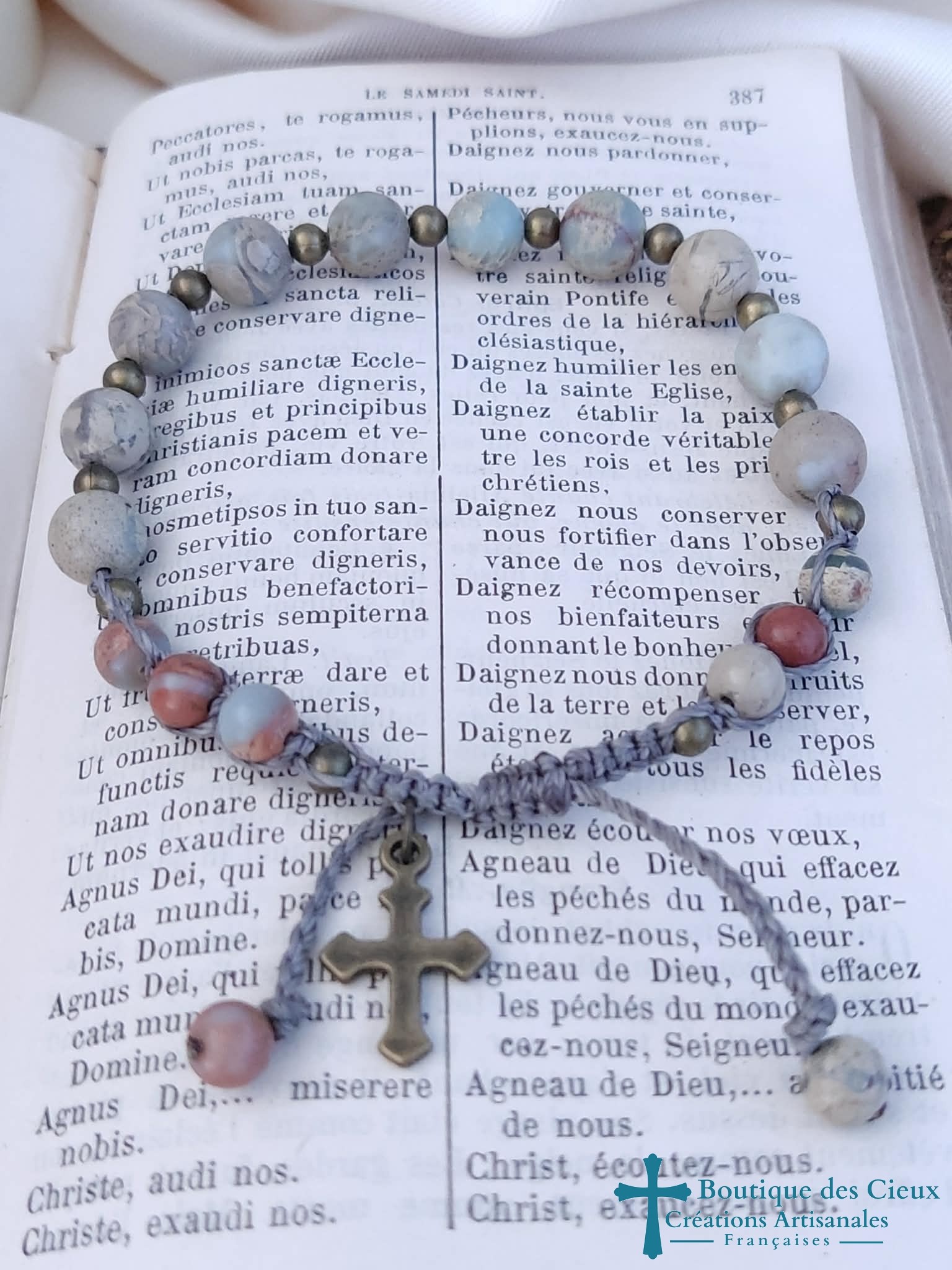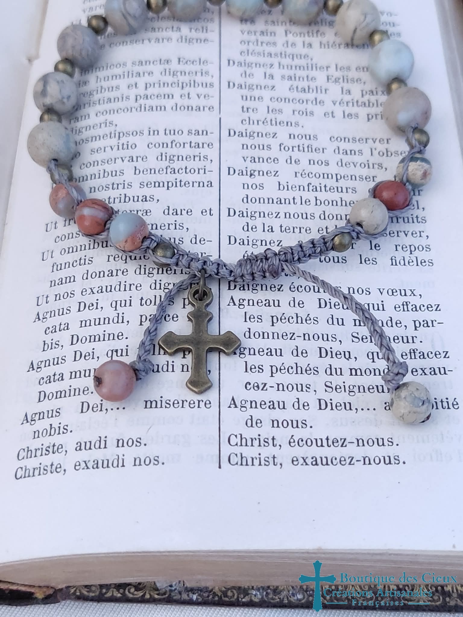 Bracelet pour hommes composé de perles de jaspe impérial et d'une croix en métal bronze. Entièrement montés à la main sur du fil polyester, il est réglable grâce à son fermoir coulissant. |