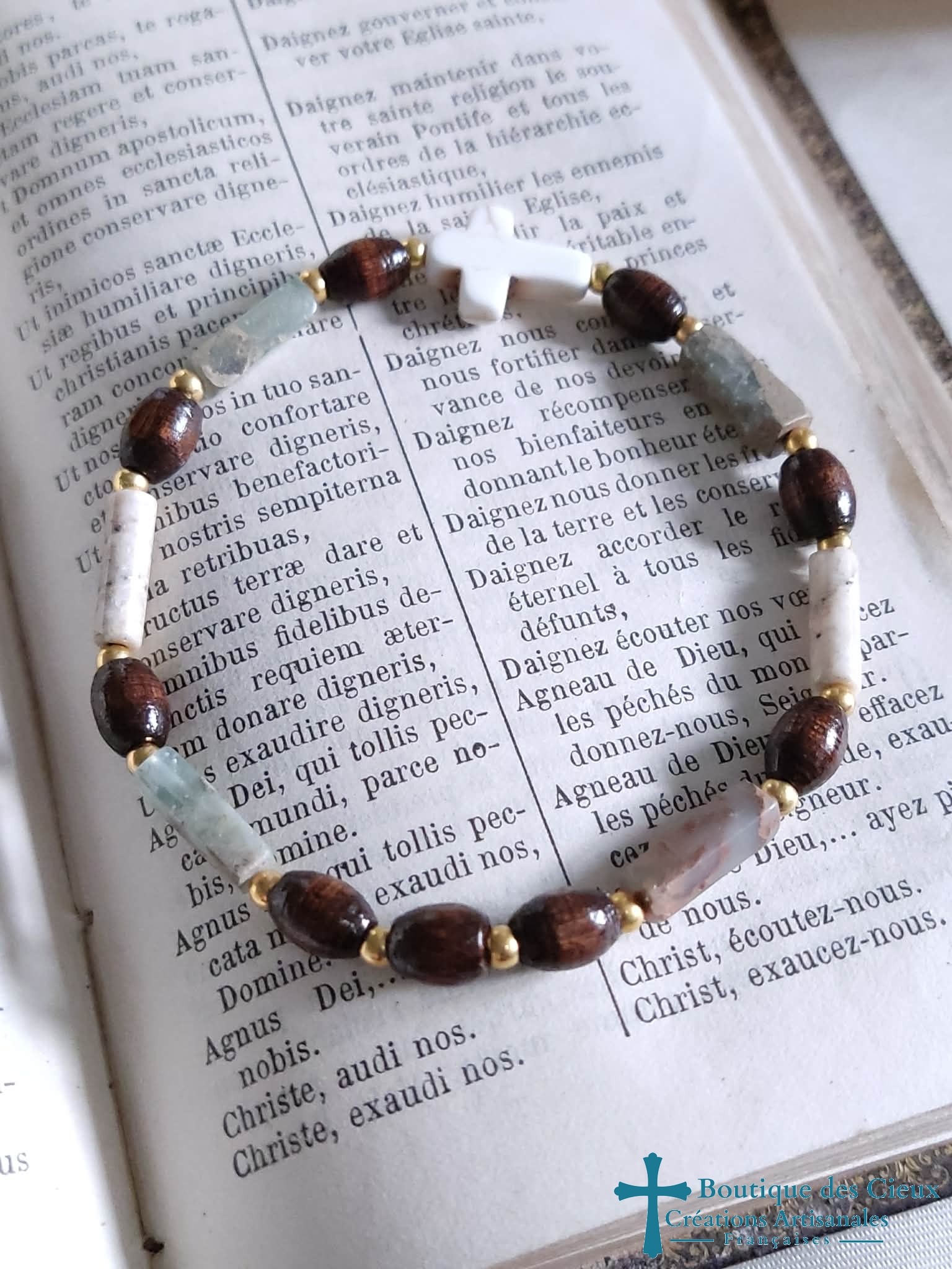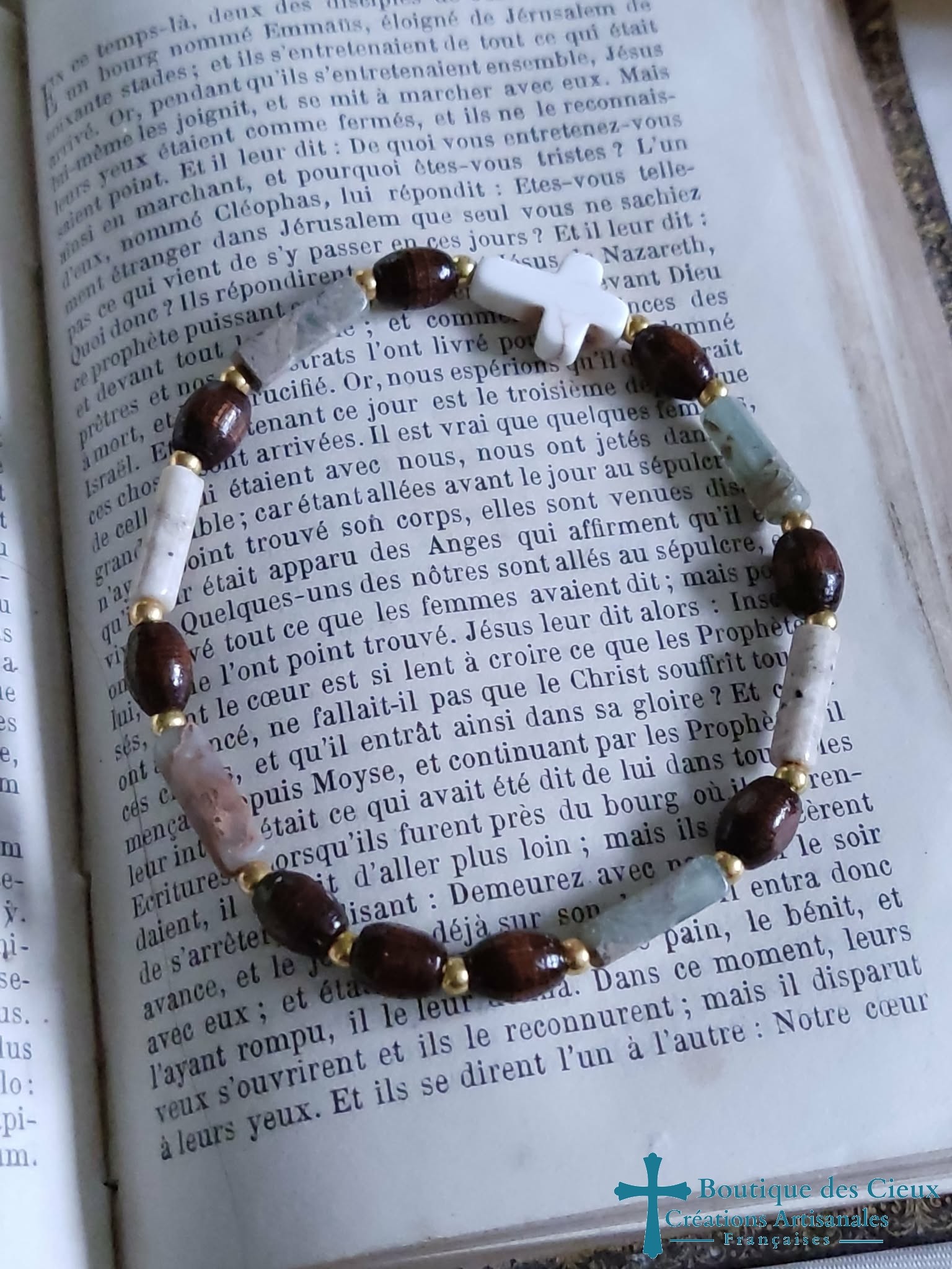 Bracelet pour hommes composé de pierres naturelles , d'une croix synthétique façon howlite et d'olive en bois. |