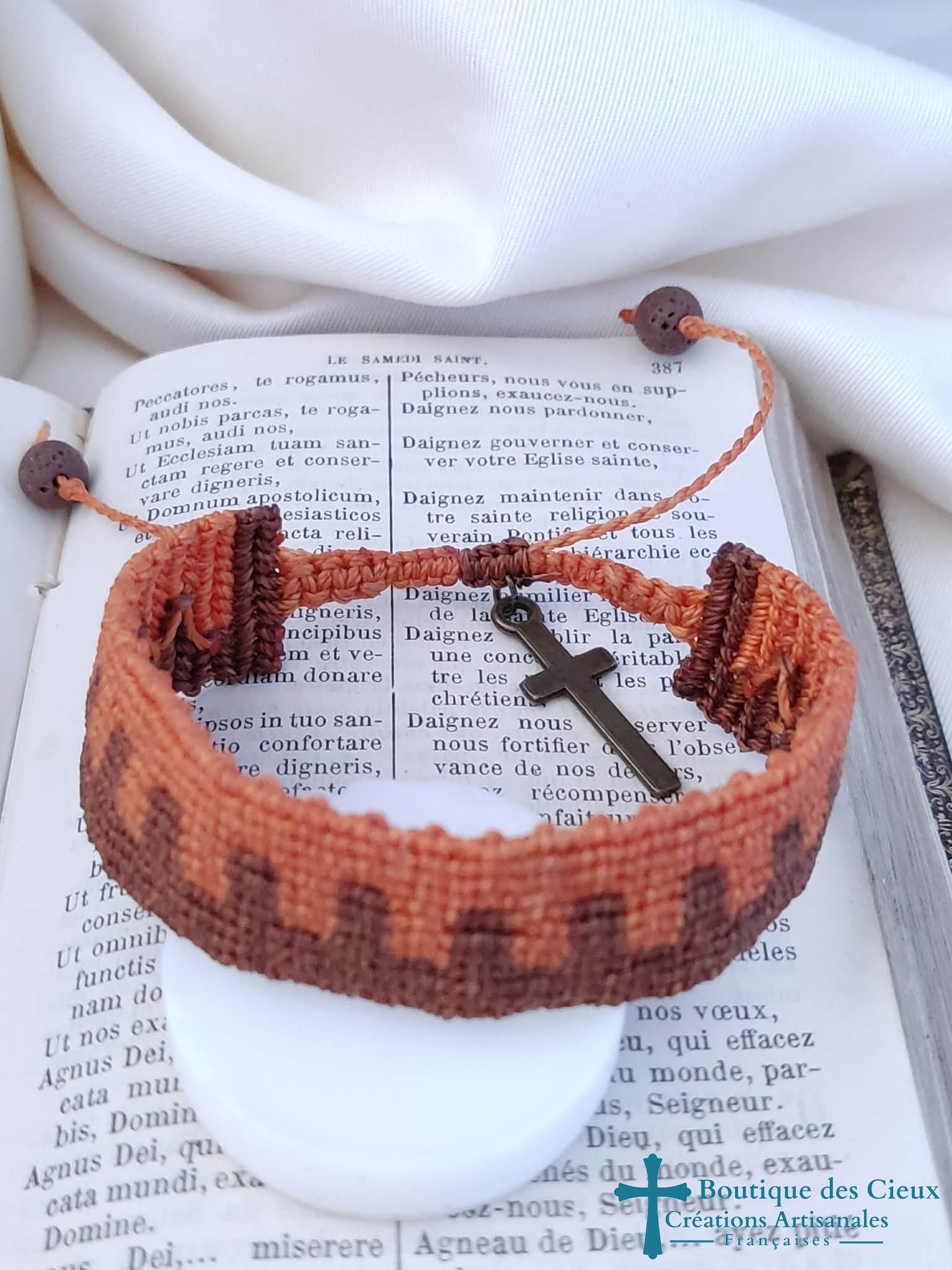 Bracelet large de 20 mm pour homme en tissage macramé marron et orange, et grande croix en métal bronze Ce bijou sera béni par un prêtre. |