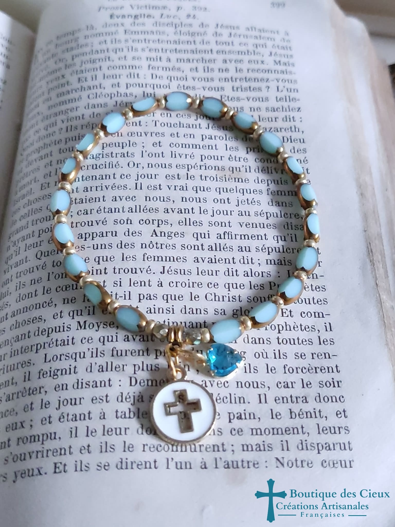 Joli bracelet pour femmes composé de grain de riz en verre turquoise, perles de rocailles, médaille croix émaillée et petit coeurEntièrement monté à la main sur fil élastique.Ce bijou bien que pas destiné à la prière sera bénis par un prêtre |