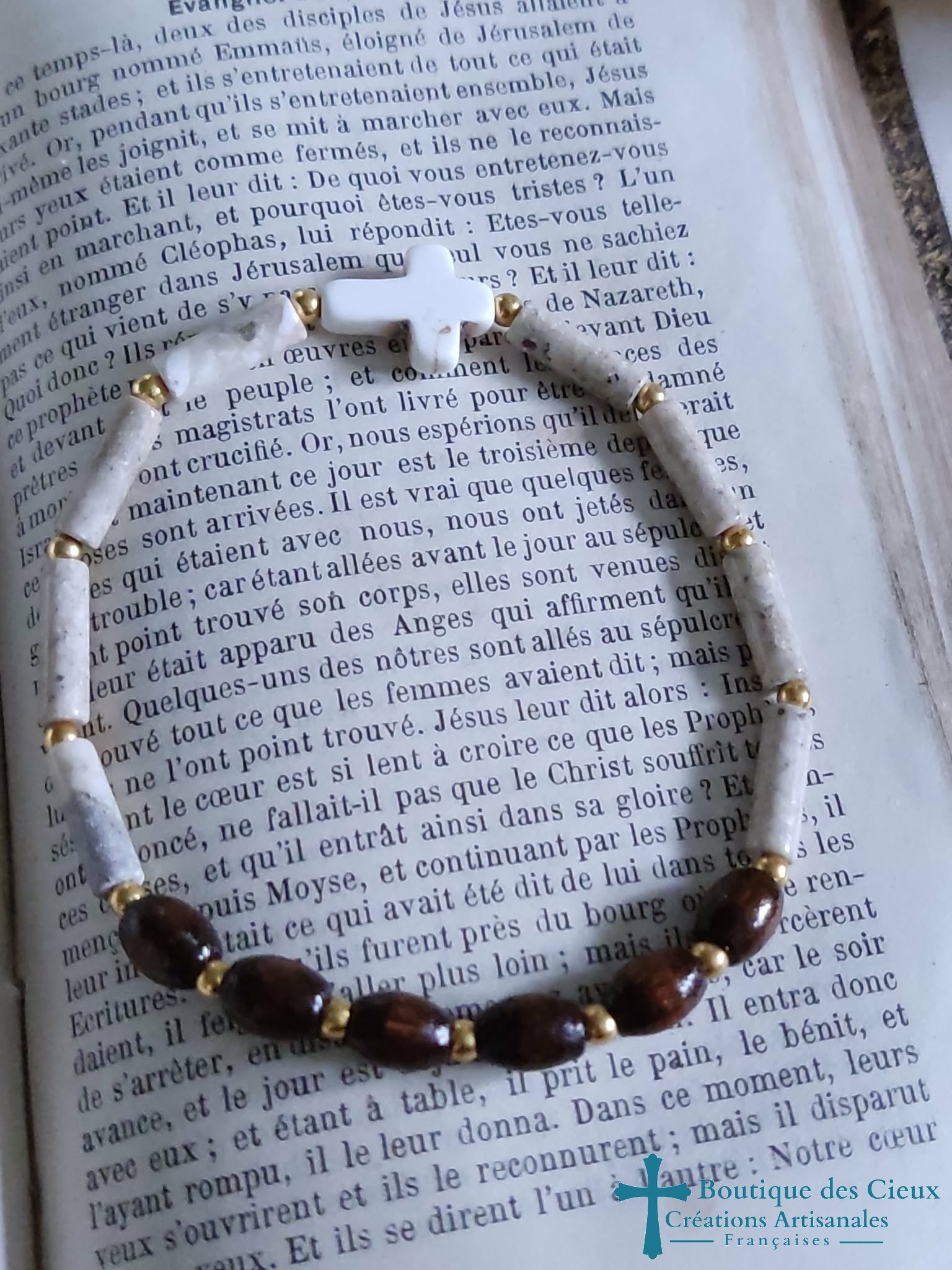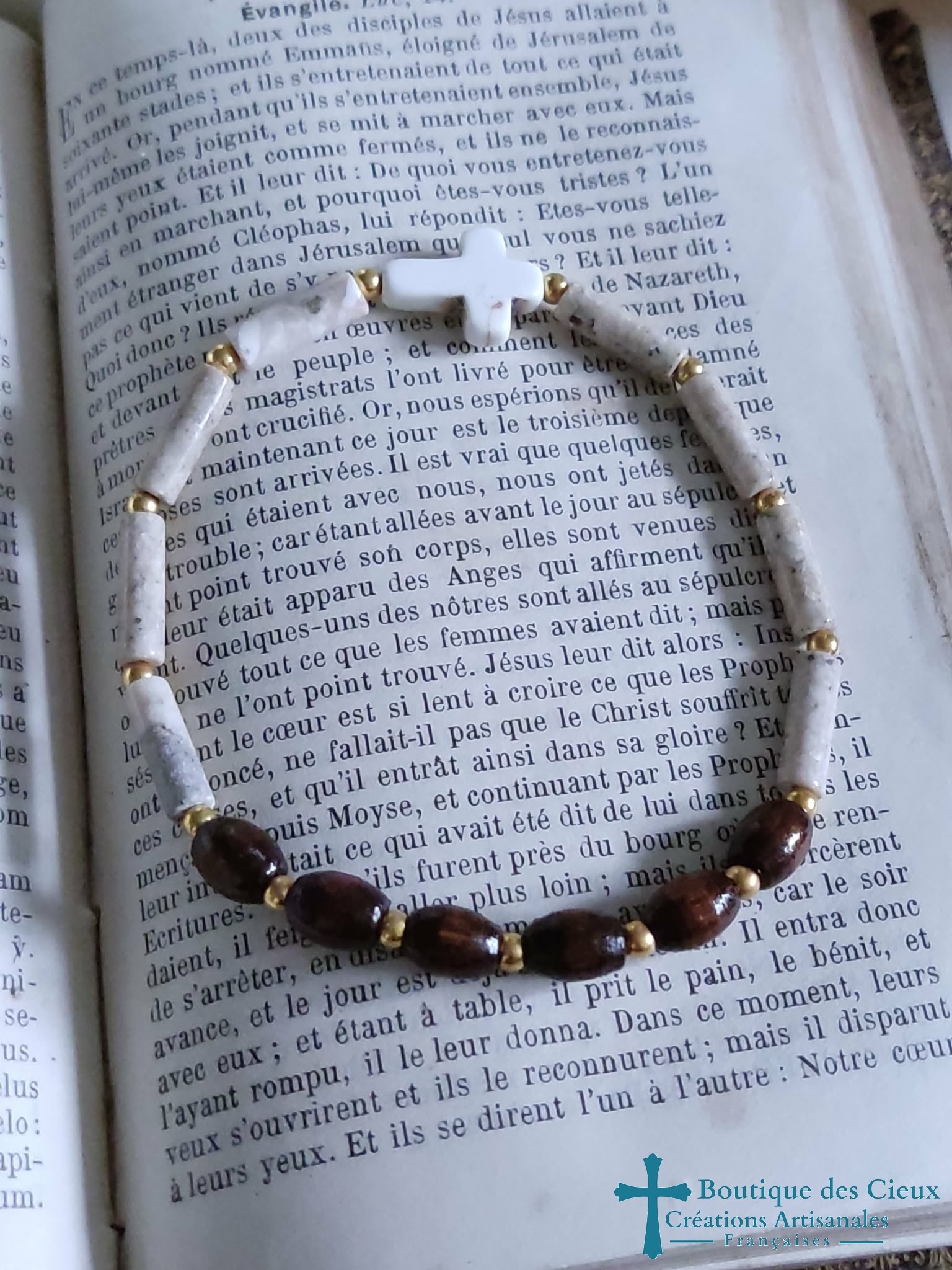 Bracelet pour hommes composé de pierres naturelles, d'une croix synthétique façon howlite et de perles en bois. |