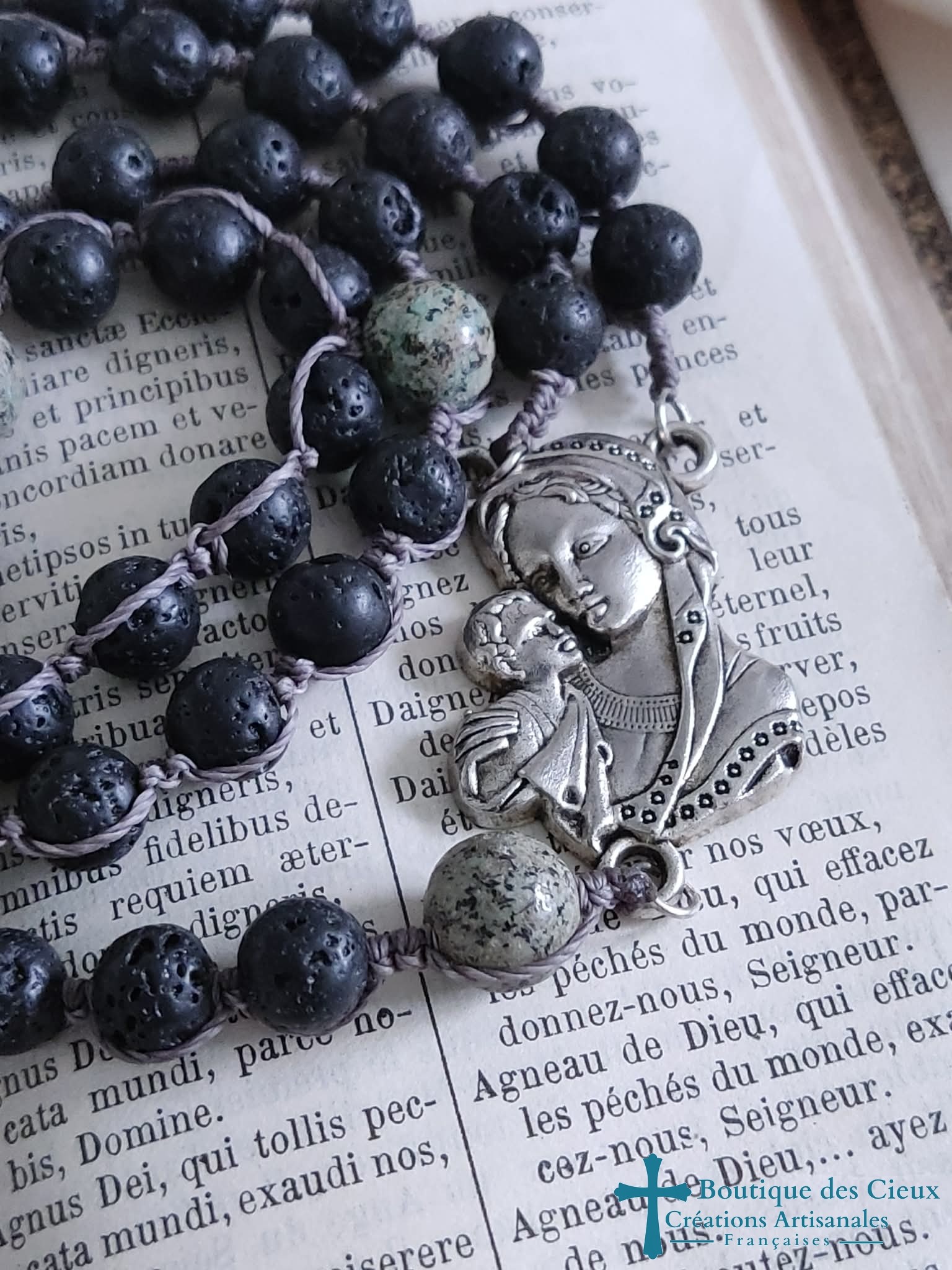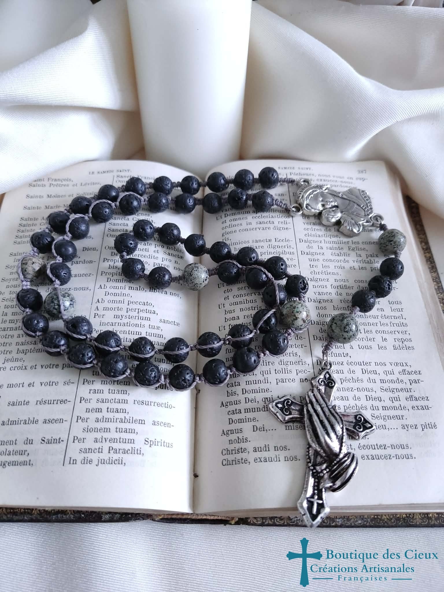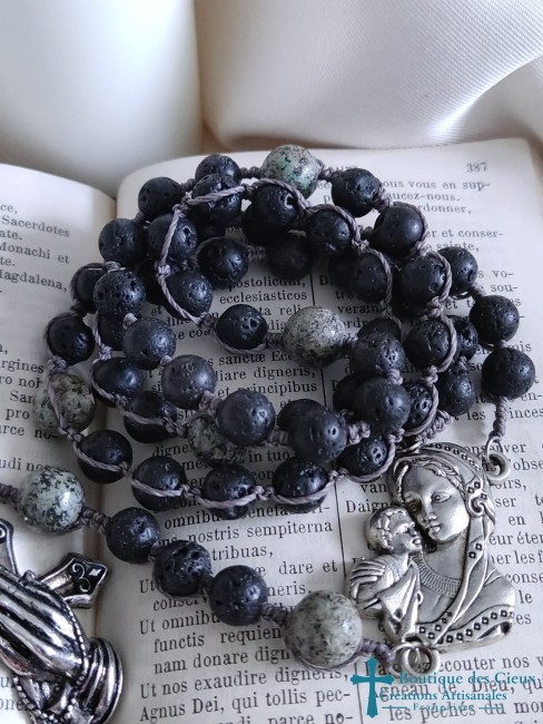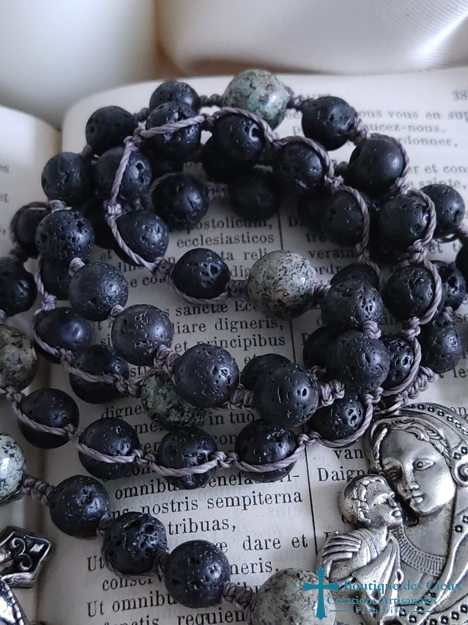 Chapelet (collier) pour homme composé de pierres de lave (purifie et rééquilibre les chakras) et turquoise africaine (variété de jaspe [ pierre d'évolution]) naturelles, ainsi que de belles pièces en métal argenté. Vous souhaitez prier le chapelet, mais ne savez pas comment procéder : rendez vous dans les pages à votre disposition. Vous y trouverez des explications et un livret complet téléchargeable en format pdf vous y est offert. |