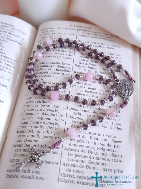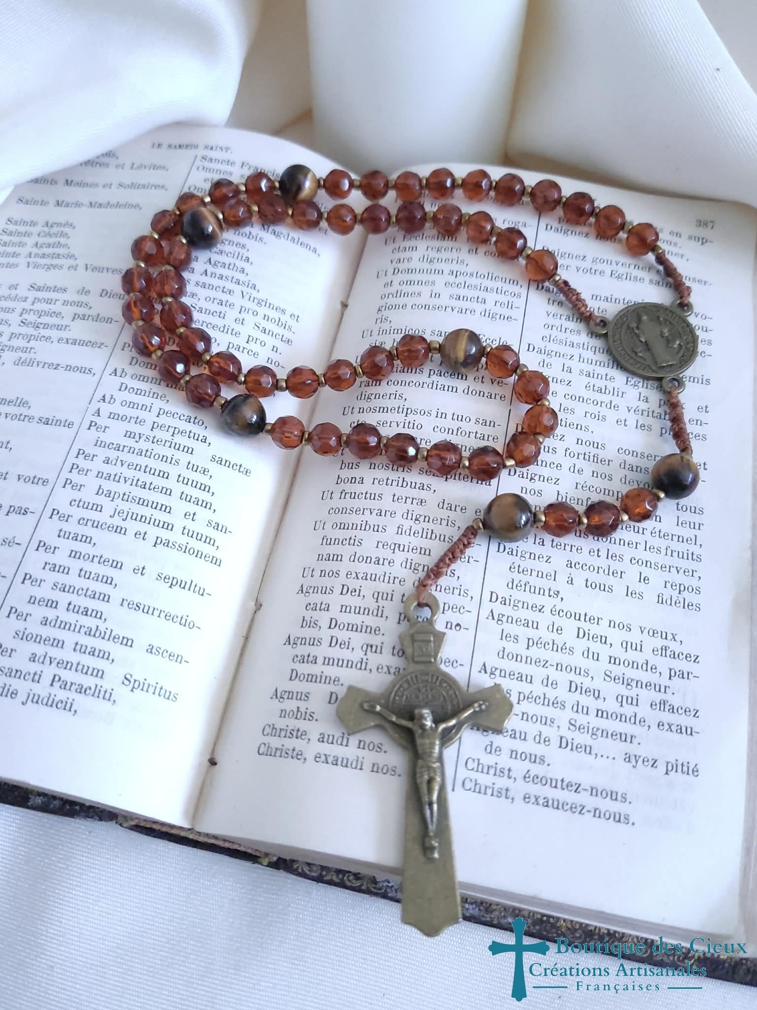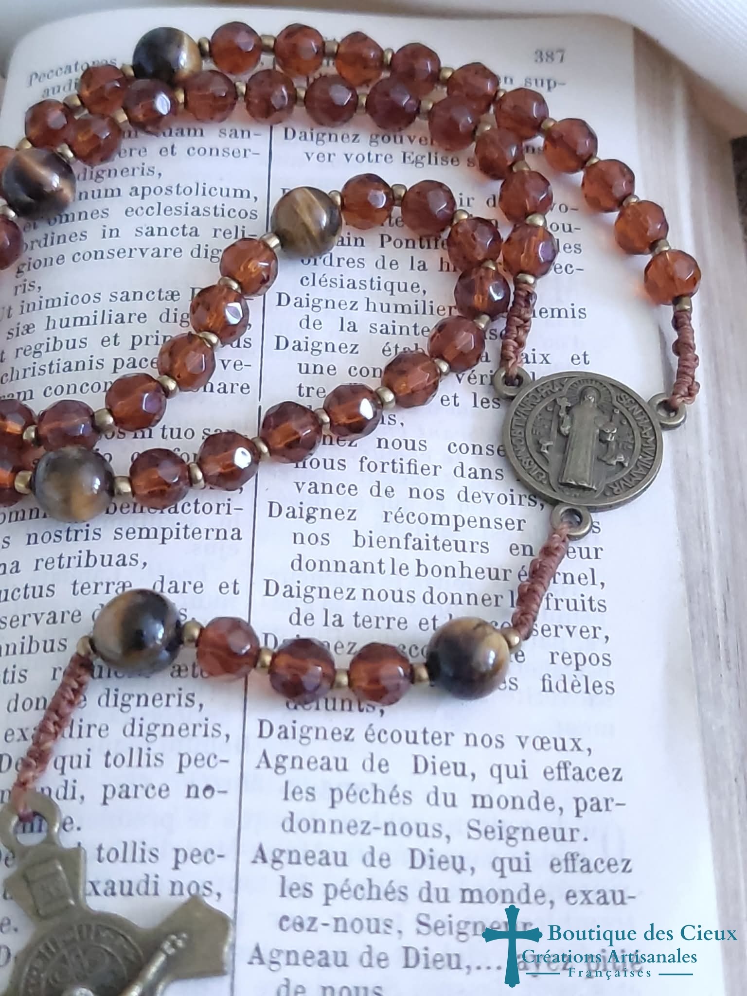 Chapelet en verre facetté et oeil de tigre (pierre de protection) ainsi que d'un connecteur Saint Benoît, et d'une croix en métal bronze. Les grains sont facilement discernables grâce aux petites perles qui les séparent et la différence de texture et taille des "Notre Père" . Vous souhaitez prier le chapelet, mais ne savez pas comment procéder : rendez vous dans les pages à votre disposition. Vous y trouverez des explications et un livret complet téléchargeable en format pdf vous y est offert. |